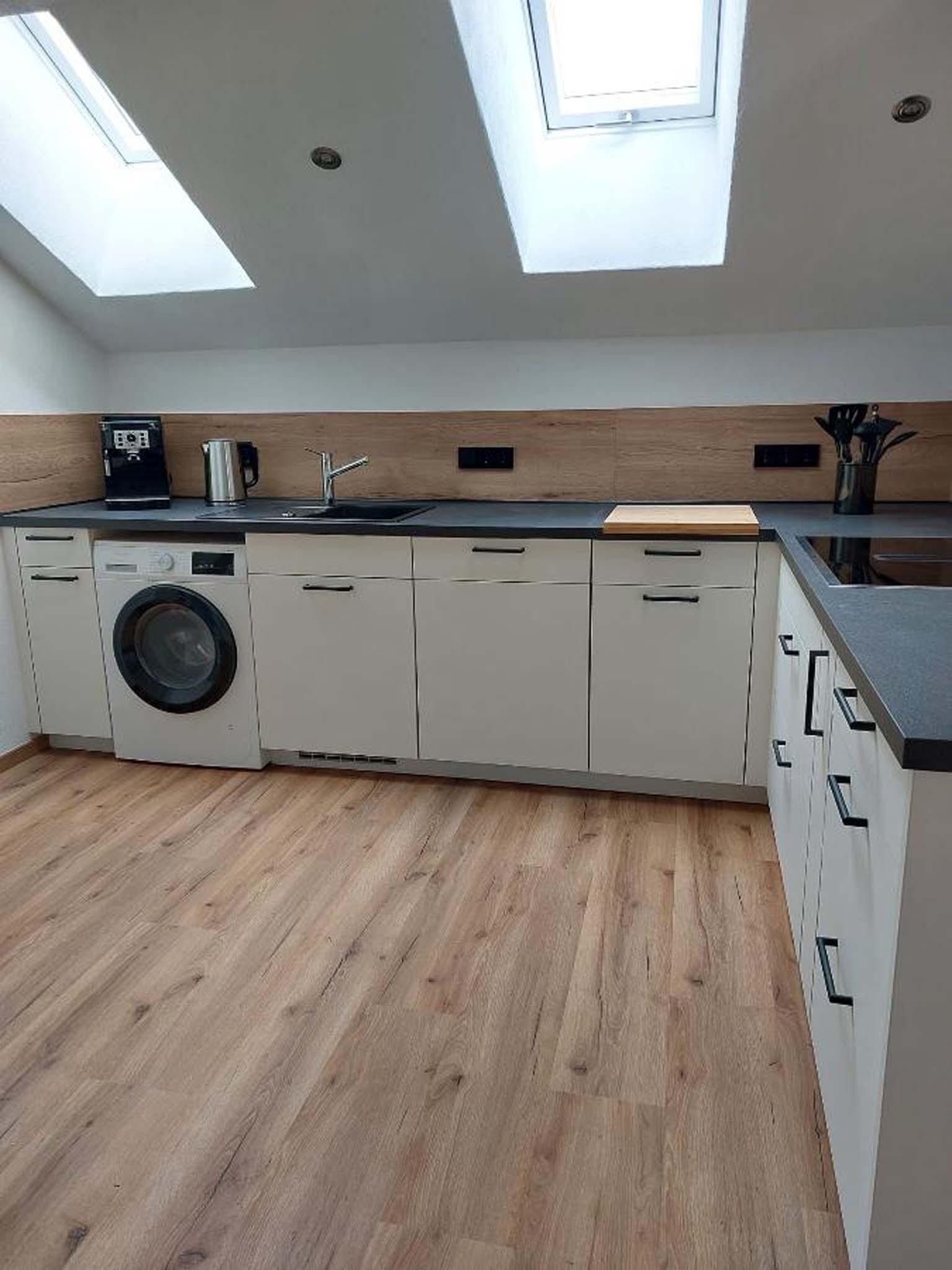 Das gemütliche Wohnzimmer mit Ledercouch und großem Flachbildschirm Sat-TV lädt zum Verweilen ein. Der komplett ausgestattete offene Küchenbereich mit Geschirrspüler, Kühlschrank, Gefrierschrank, E-Herd, Backofen, Mikrowelle, Wasserkocher, Kaffeevollautomat und Toaster lässt keine Wünsche offen.