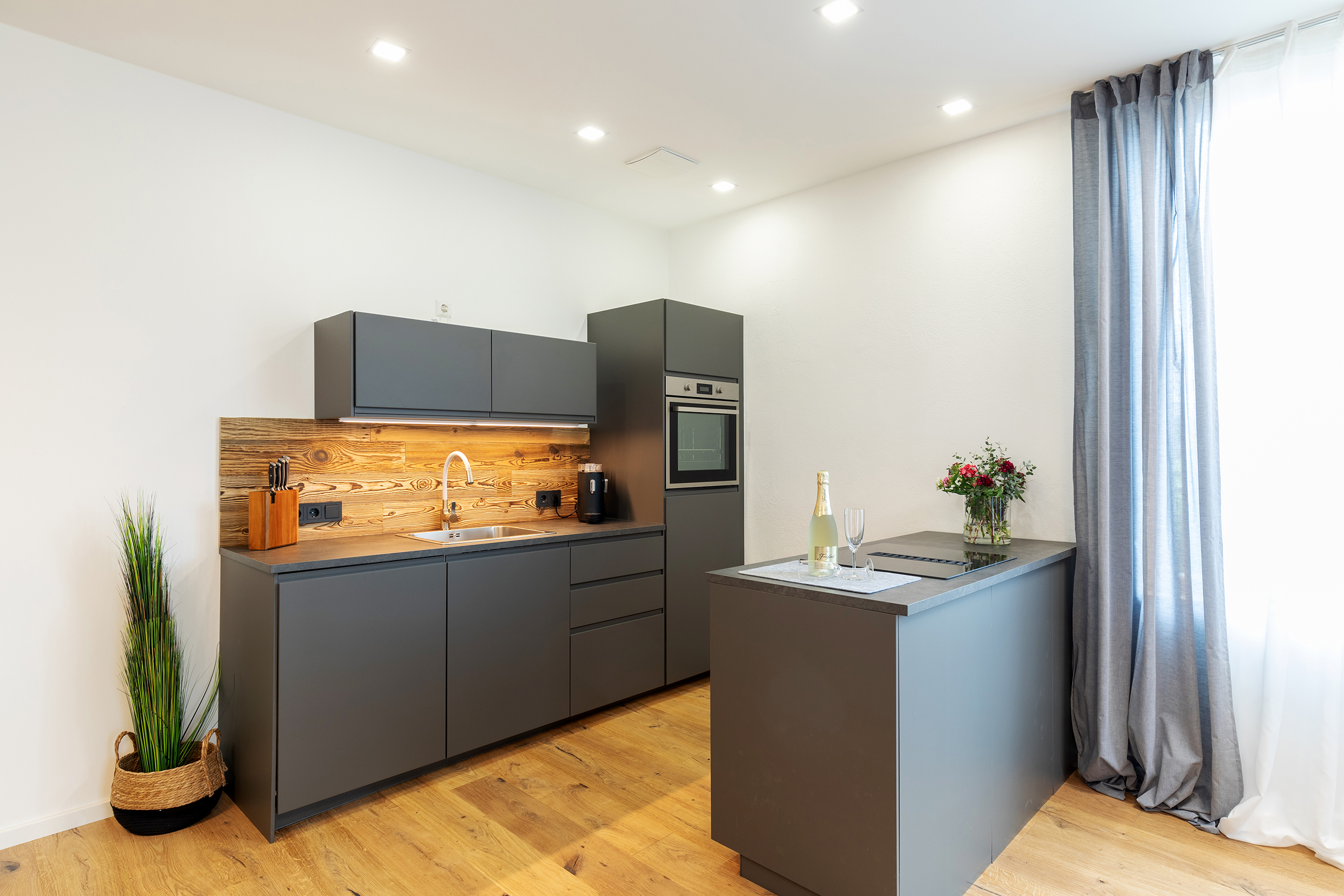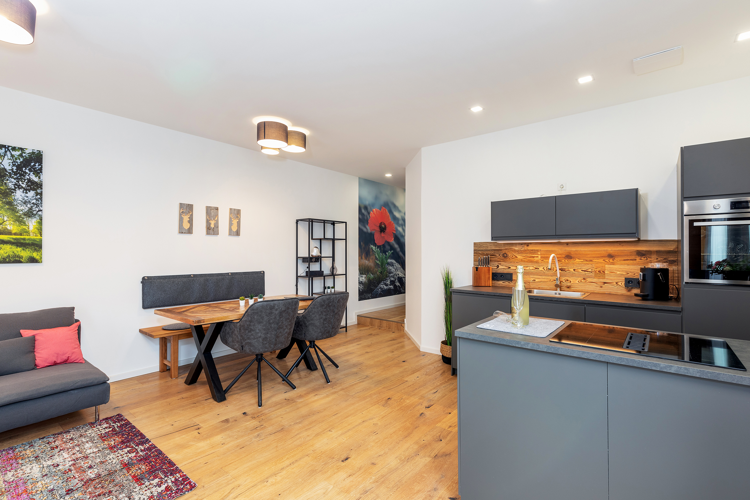 • Designküche mit Induktionskochfeld, separatem Backofen, Geschirrspüler, Mikrowelle, Kühlschrank mit Gefrierfach, Nespressomaschine, Toaster, Wasserkocher und vielem mehr