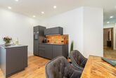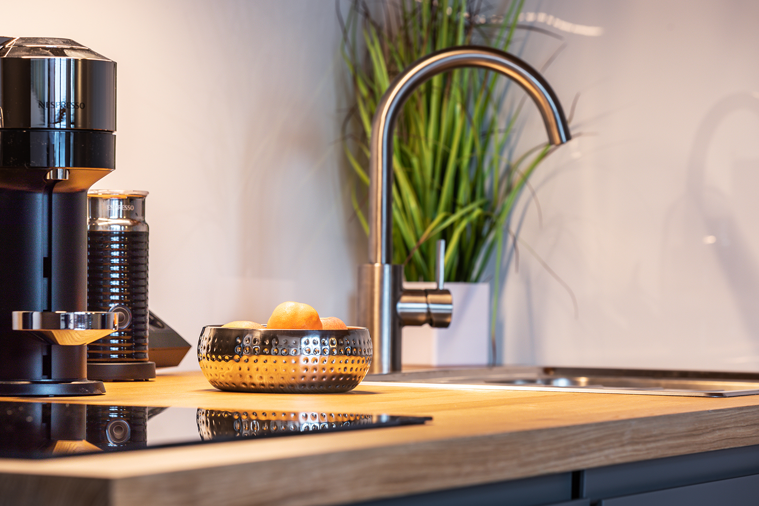 • Designküche mit Induktionskochfeld, separatem Backofen, Geschirrspüler, Mikrowelle, Kühlschrank mit Gefrierfach, Nespressomaschine, Toaster, Wasserkocher und vielem mehr