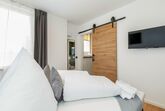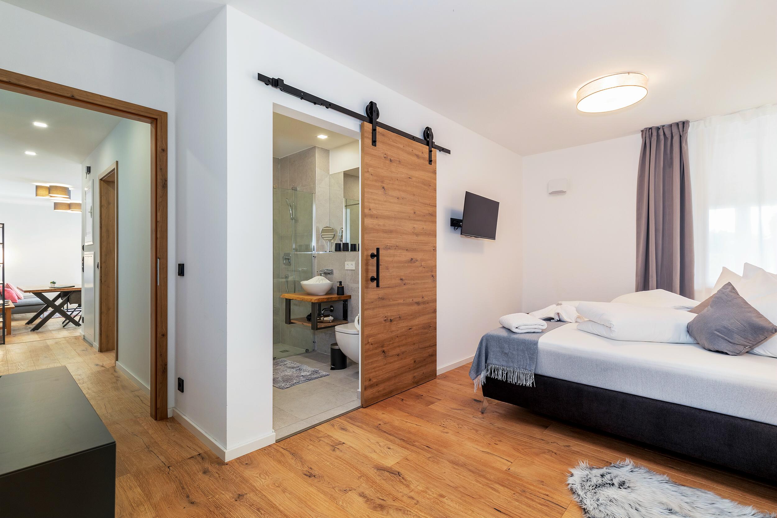 • Master-Schlafzimmer mit breitem Boxspringbett und eigenem Flachbildfernseher