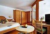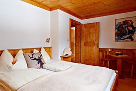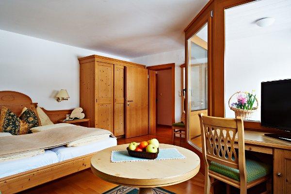 Wohn-Schlafraum mit Doppelbett, Sitzecke und Sat-TV, Doppelzimmer, Badezimmer mit DU oder Wanne/WC/Föhn, Loggia mit Bergblick