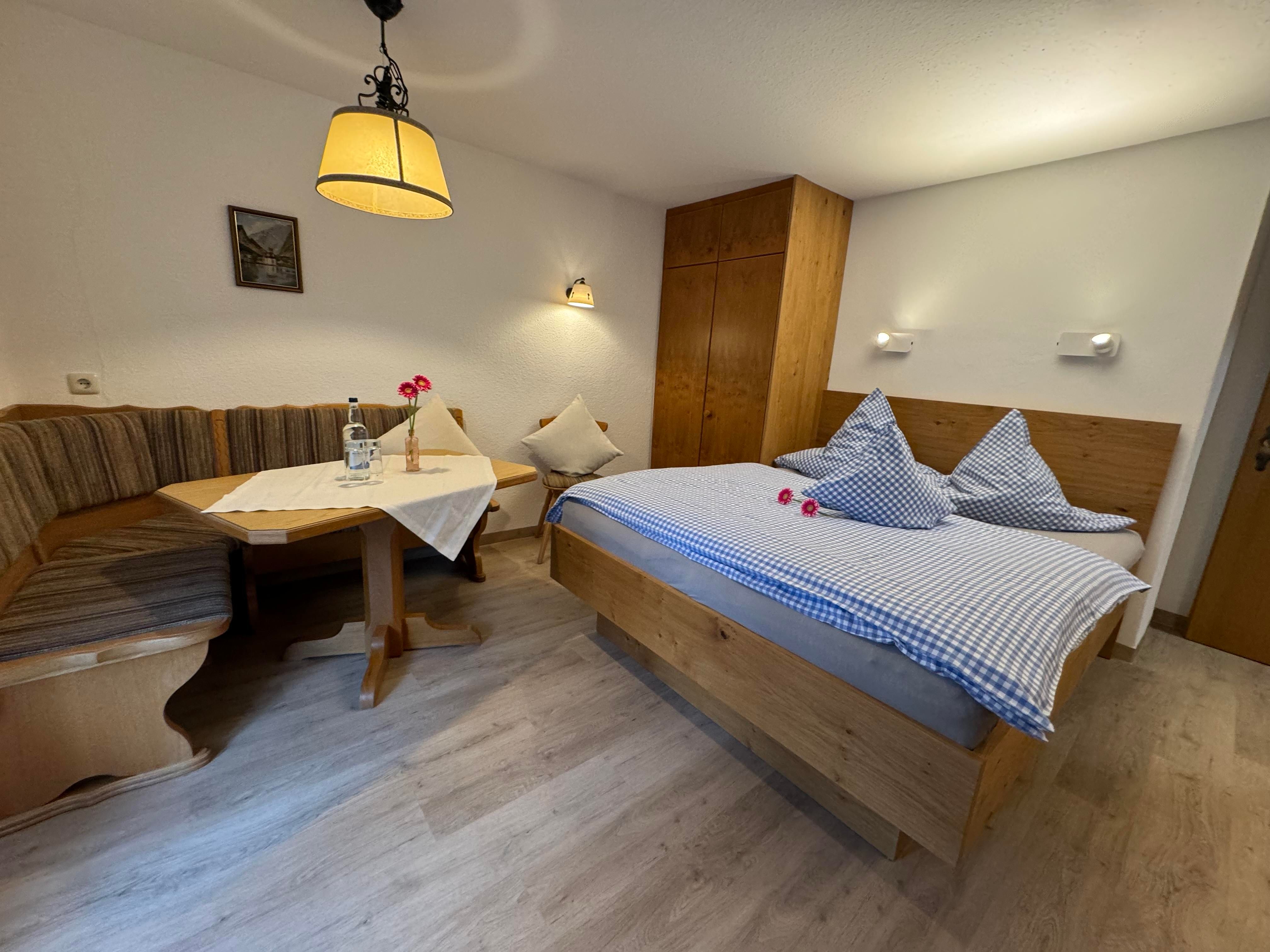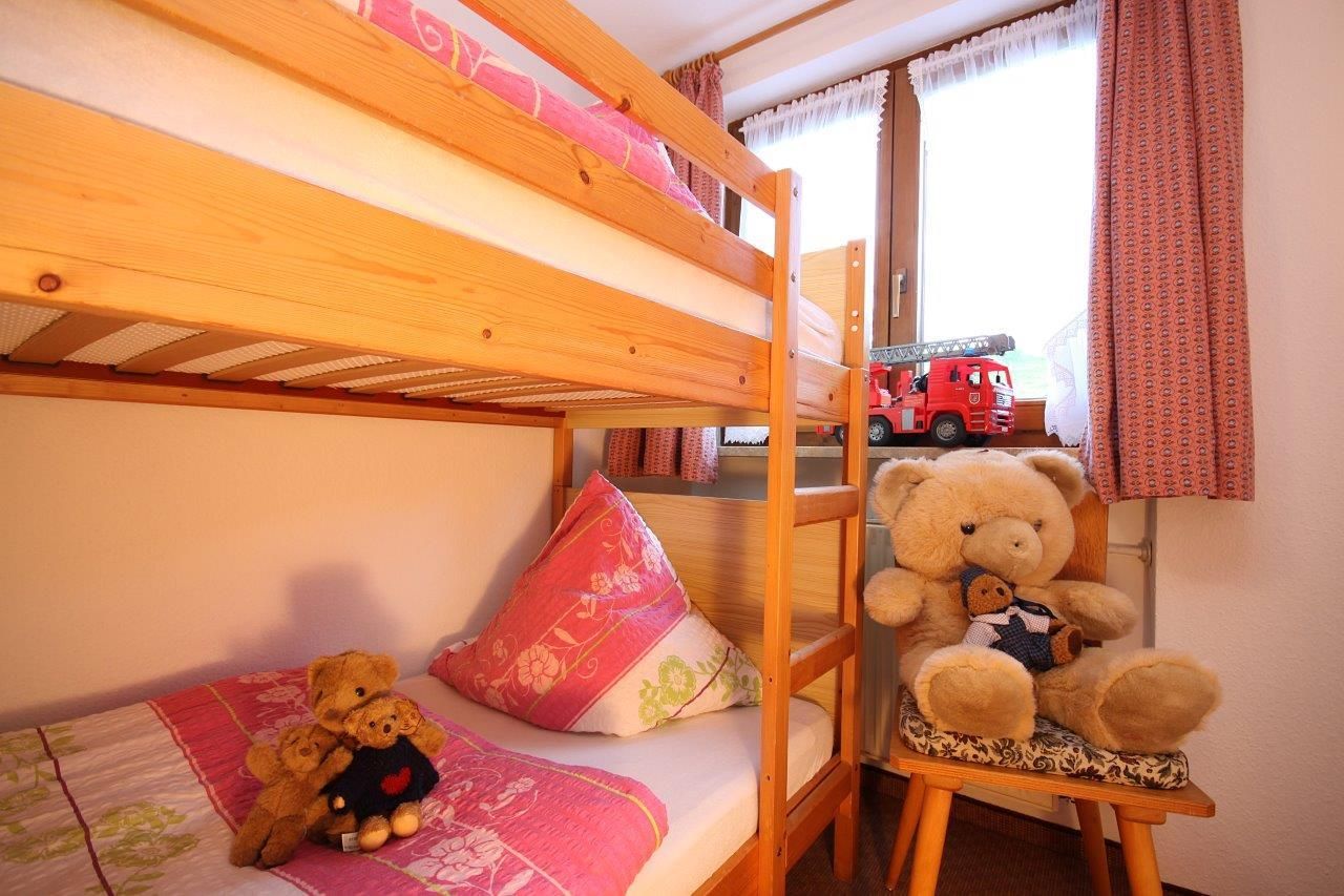 Kinderzimmer mit Schrank und Etagenbetten, Wohn-Schlafraum mit Doppelbett und Eckbank, Tisch und zwei Stühlen.