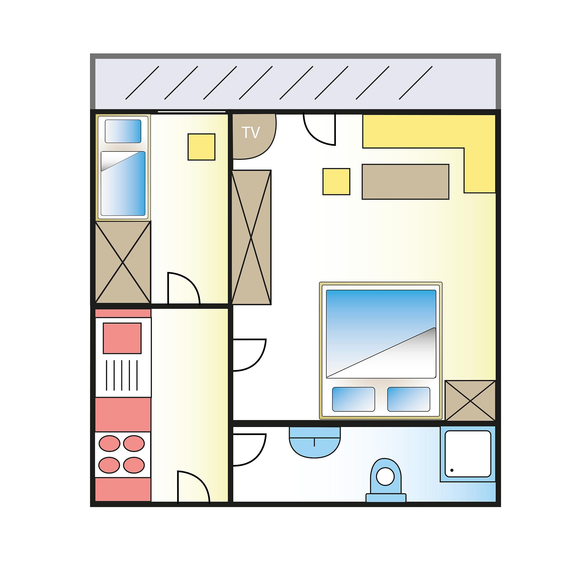 Ferienwohnung (31qm) für 2 Erwachsene und 2 Kinder. Mit Balkon, Vorraum mit Küchenzeile, großzügiges Badezimmer.
