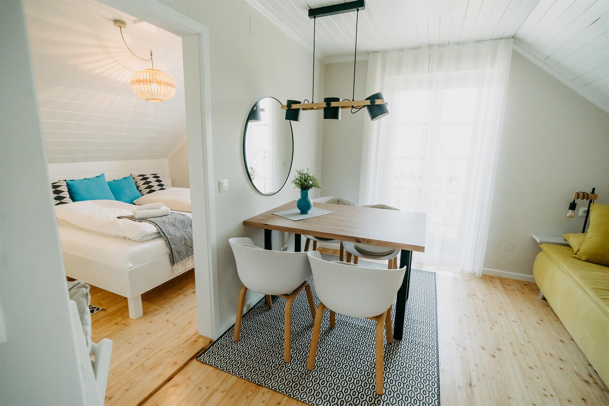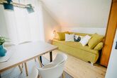 • Esszimmer mit zusätzlicher Schlafmöglichkeit auf bequemer großer Federkern-Couch