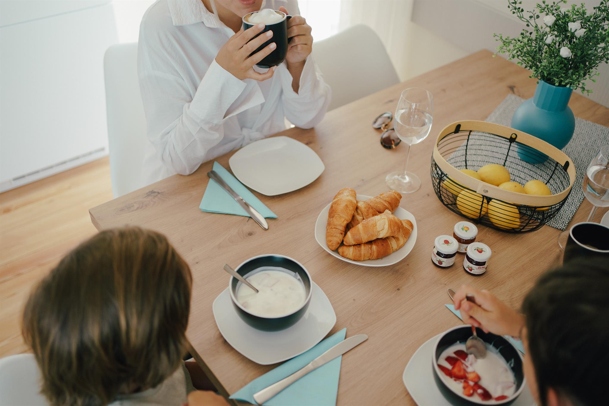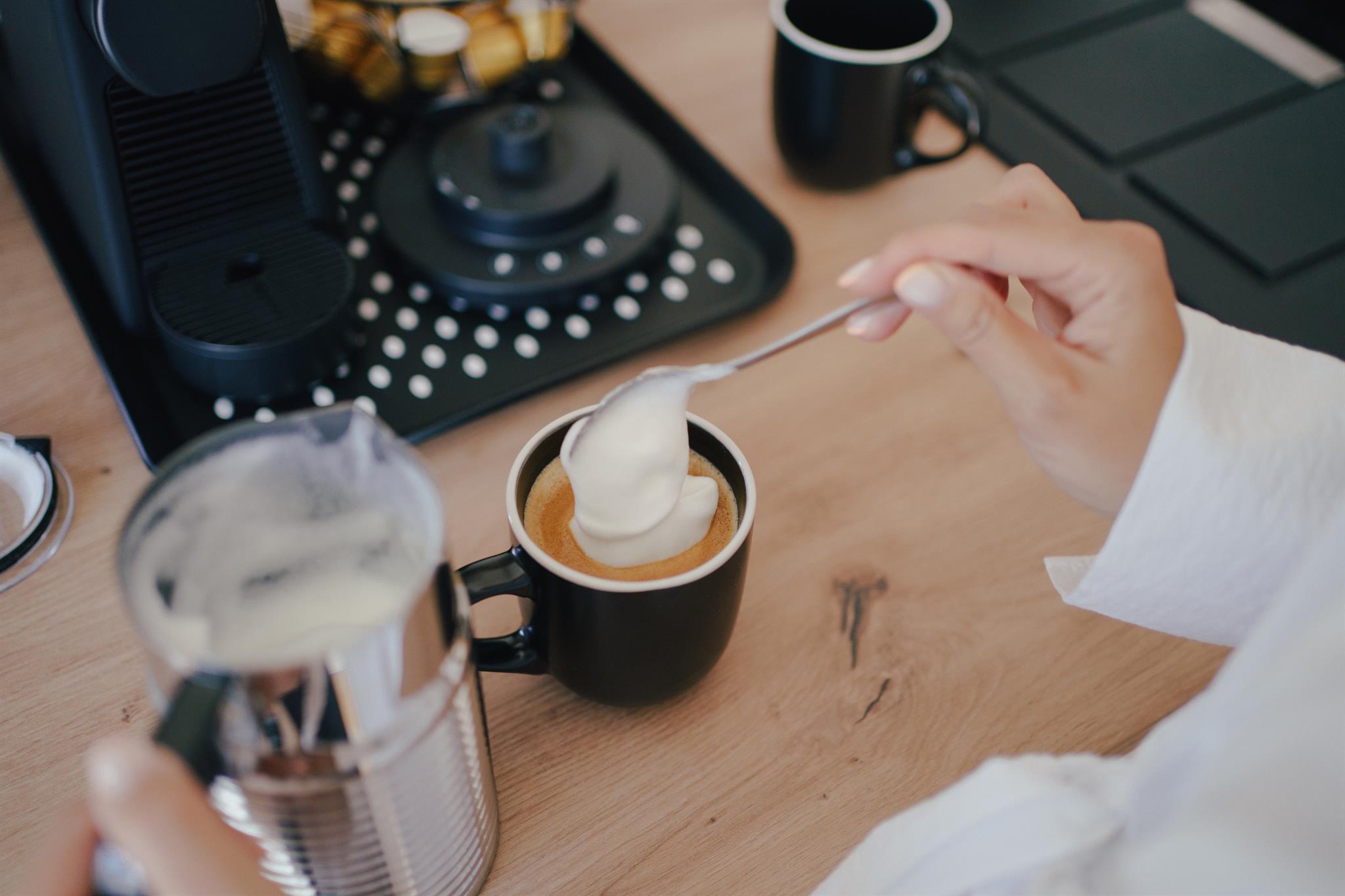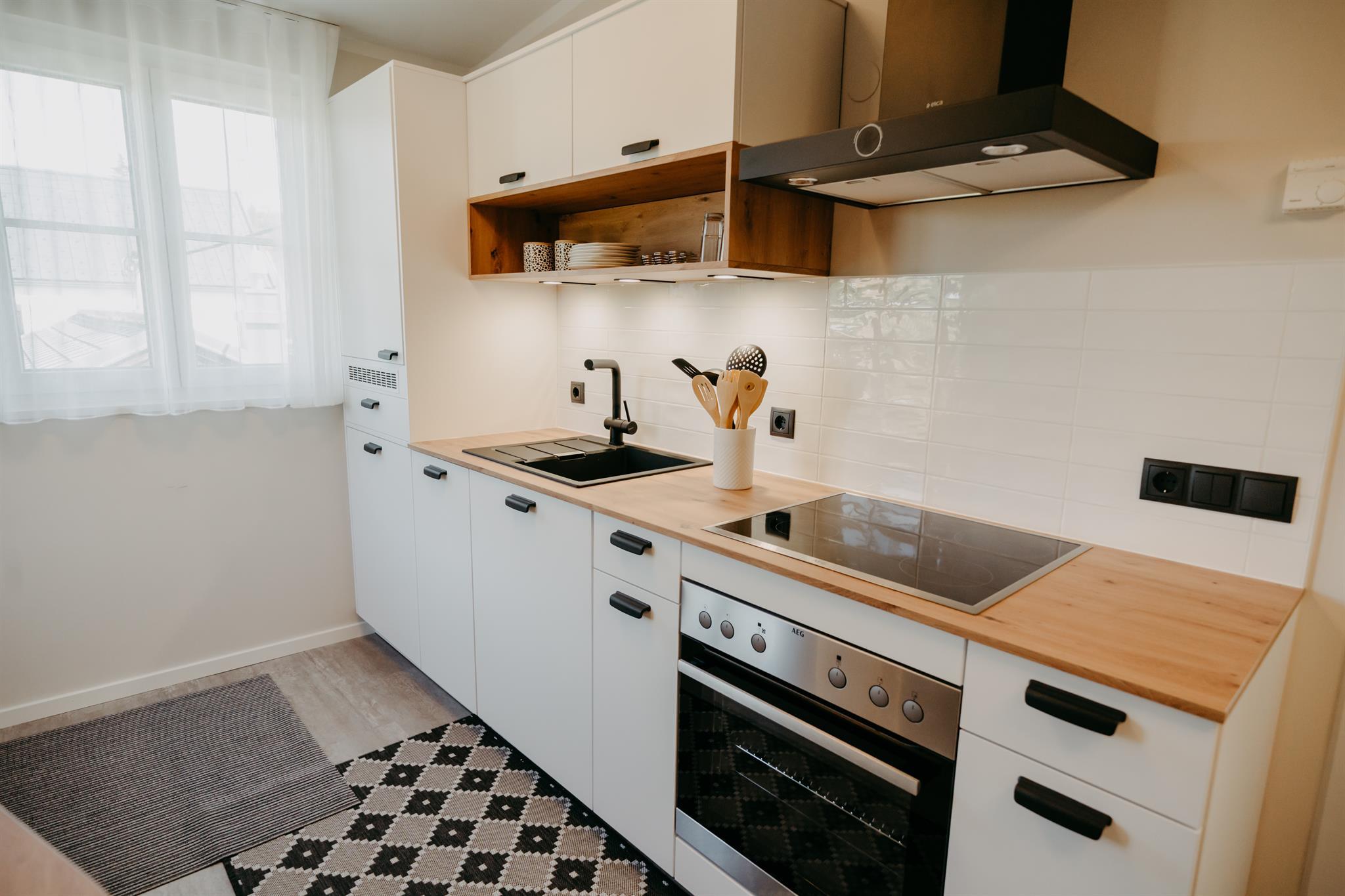 • komplett ausgestattete Wohnküche mit Geschirrspüler, Kühlschrank mit Gefrierfach, besonders gut ausgestattet mit Geschirr und Besteck für Selbstversorger, Nespresso-Kaffeemaschine und -Milchschäumer