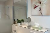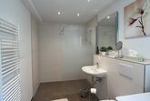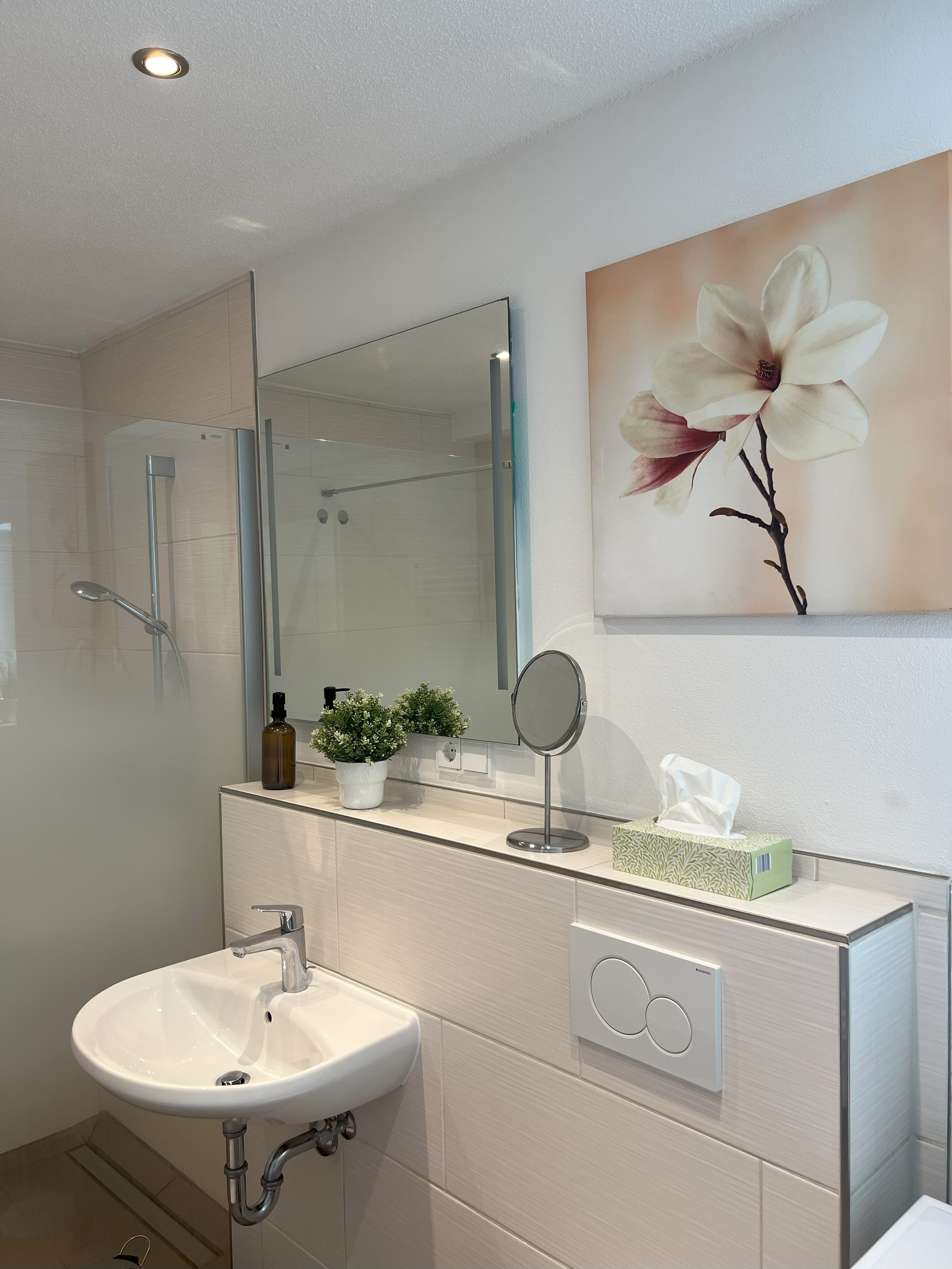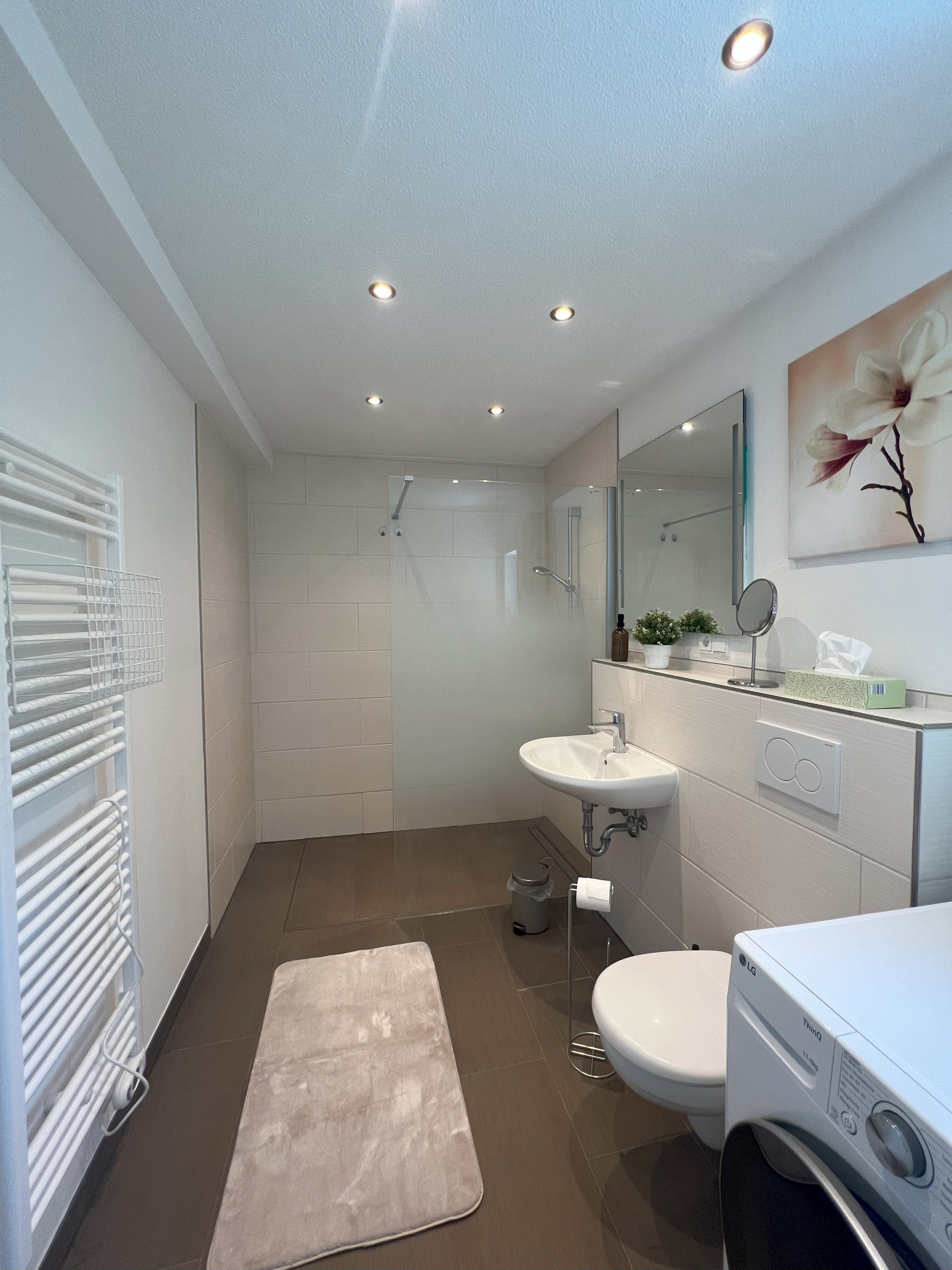 Das geräumige Badezimmer verfügt über eine ebenerdige Dusche, einen großen Spiegel, einen Waschtisch und einen Handtuchtrockner, die alle dazu beitragen, dass Sie sich entspannen und erfrischen können.