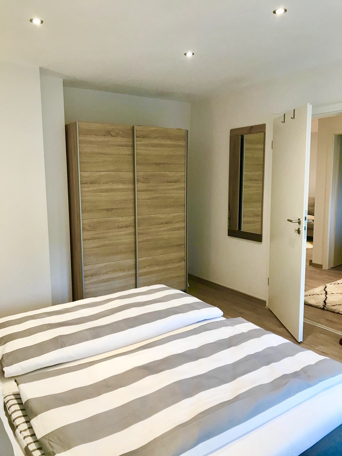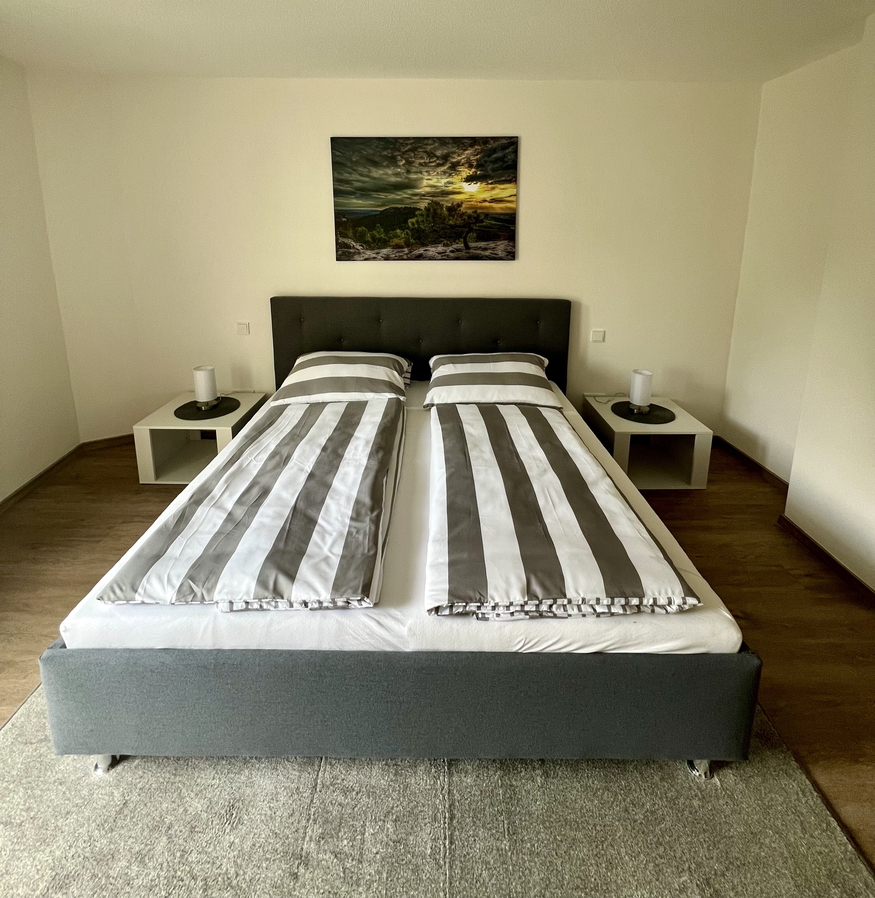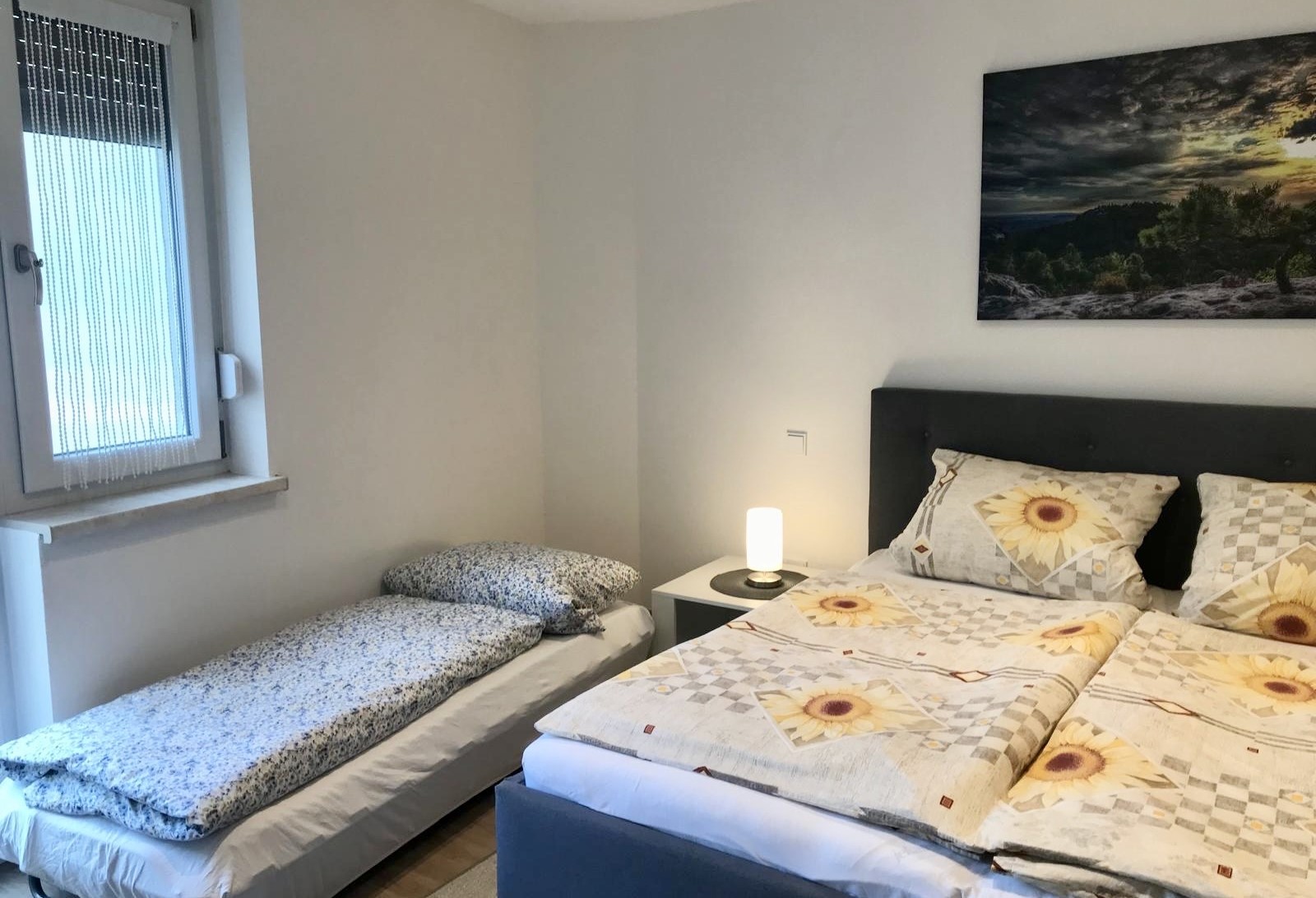 Das ruhige Schlafzimmer lädt mit einem bequemen Polsterbett und einem herrlichen Blick auf den Garten zum Träumen und Entspannen ein. Für Ihre Kinder steht ein Zustellbett bereit. Ein Babybett stellen wir kostenfrei zur Verfügung.