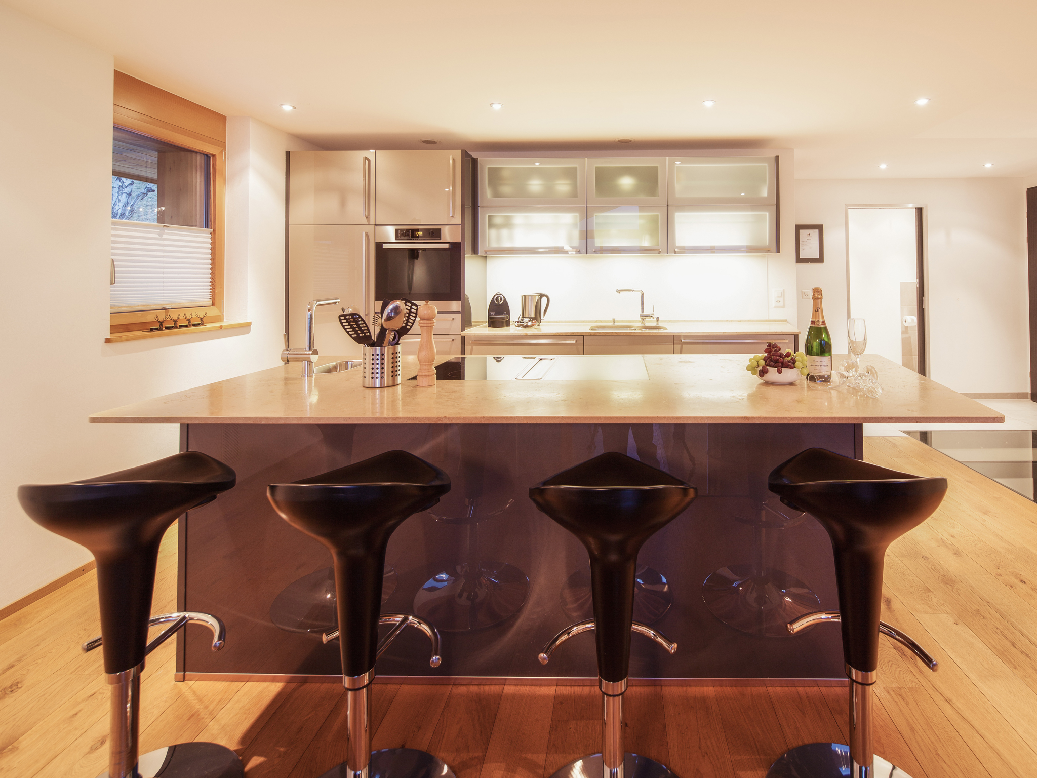 Luxuriöse und grosszügige 5-Zimmer-Wohnung 200 m2 auf 2 Stockwerken mit offener grosser Küche mit Kochinsel (Nespresso-Kaffeemaschine mit gratis Kapseln), grosser Esstisch für max. 10 Personen, drehbarer Kaminofen (gratis Holz), Wohn-/Esszimmer, Sat.-TV, 4 Doppelzimmer davon 2 Doppelzimmer mit direktem Zugang zu Dusche/WC. 1 x Bad/WC und 1 separates Tages-WC.