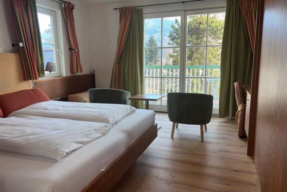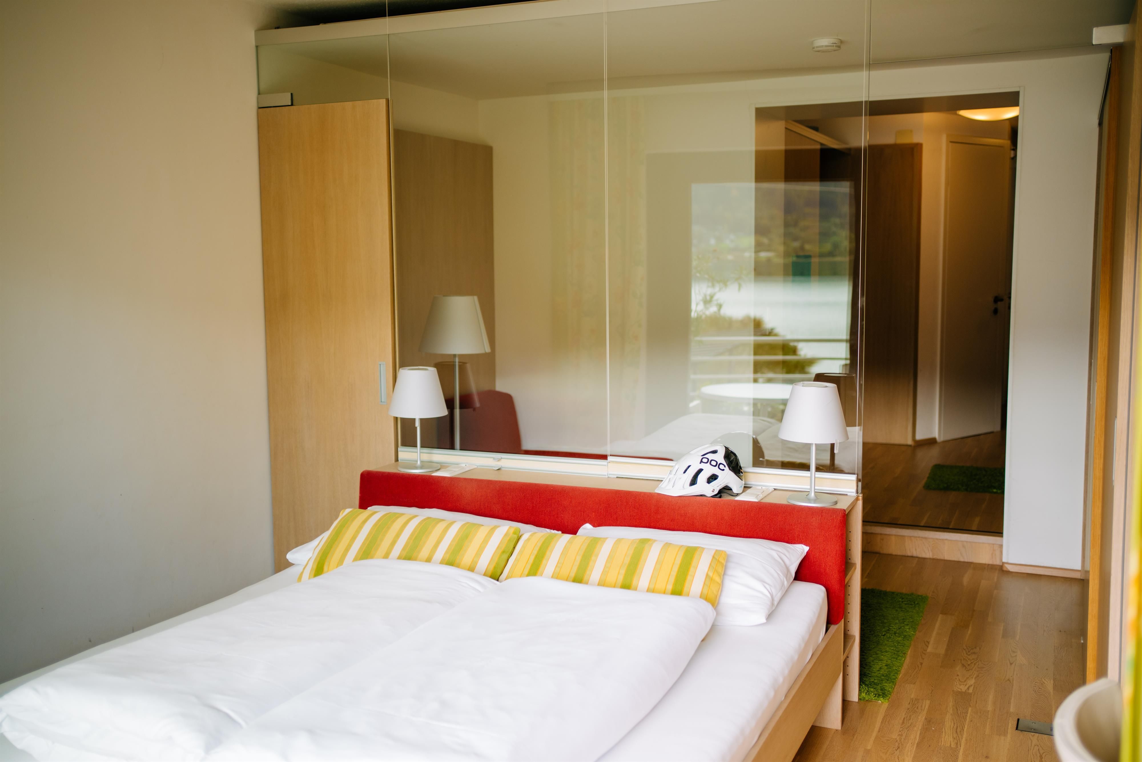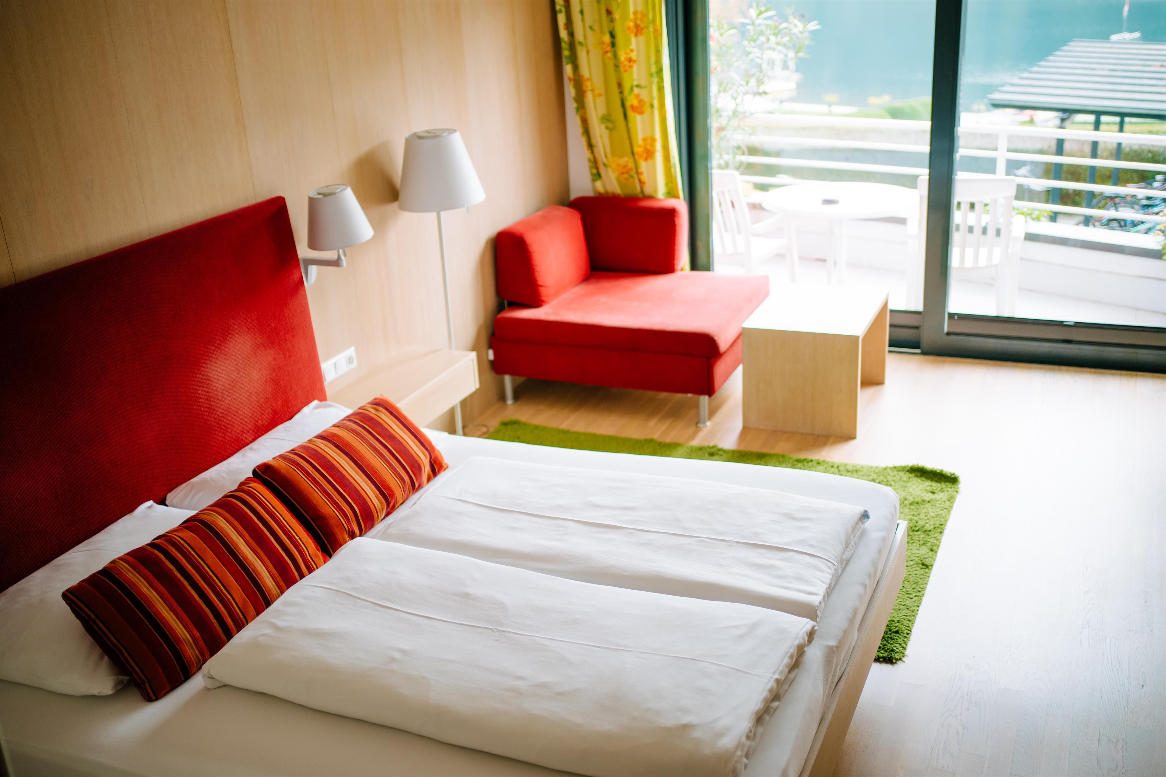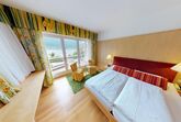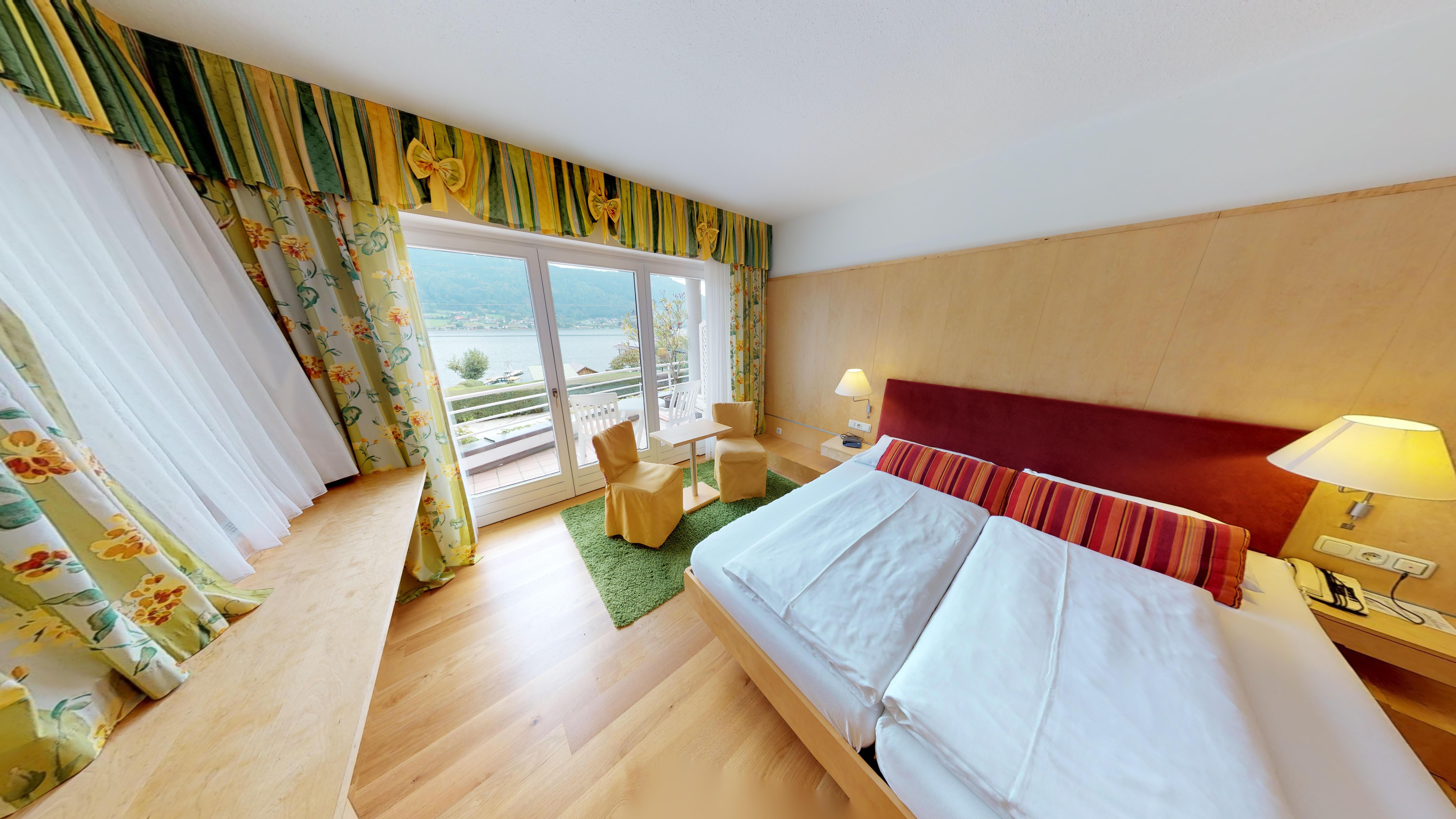 Familienzimmer mit Balkon oder Terrasse und Seeblick im Haupthaus, Landhaus oder Haus am See, seeseitiges Elternzimmer und getrenntes Kinderzimmer, teilweise Hochbetten, Bad oder DU/WC, Föhn, Sat-TV, gratis W-Lan