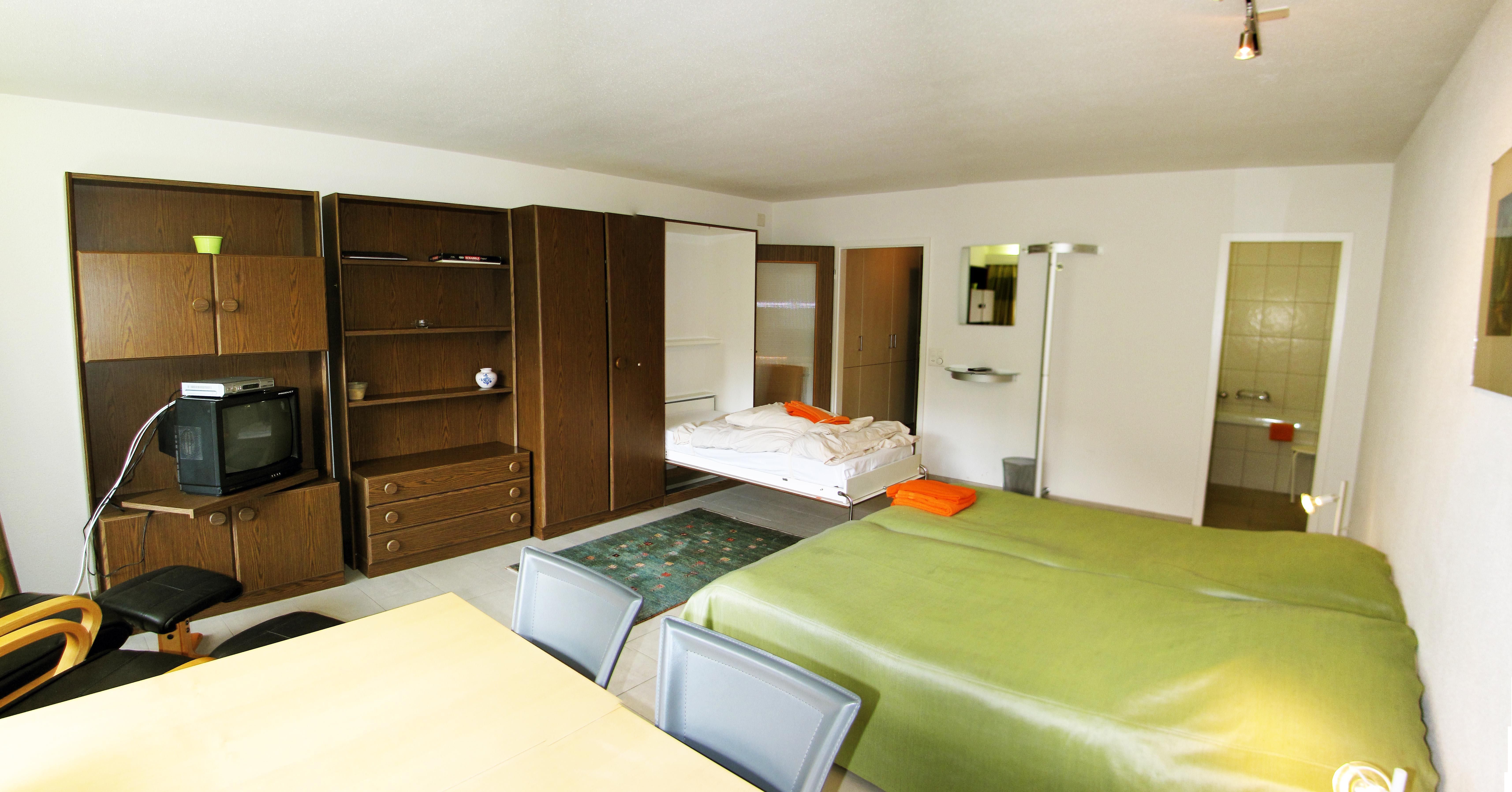 Das Cristal 09 verfügt über einen geräumigen, modernen Wohn- / Schlafbereich mit zwei Einzelbetten und einem Ausziehbett (Klappbett), einem eigenen Südbalkon mit Bergblick, einer separaten Küche mit einem kleinen Kühlschrank, einem Gefrierschrank, 1 Bad / WC und Wifi.