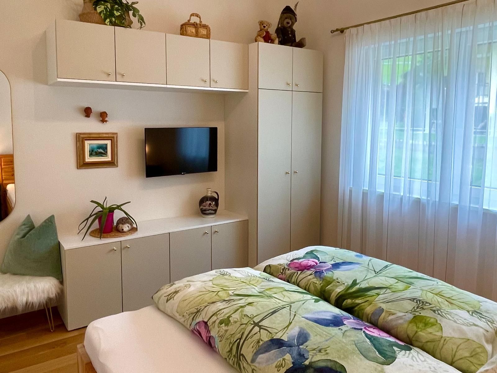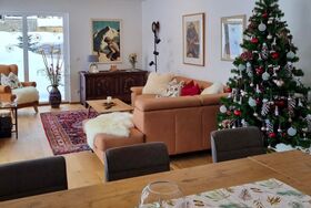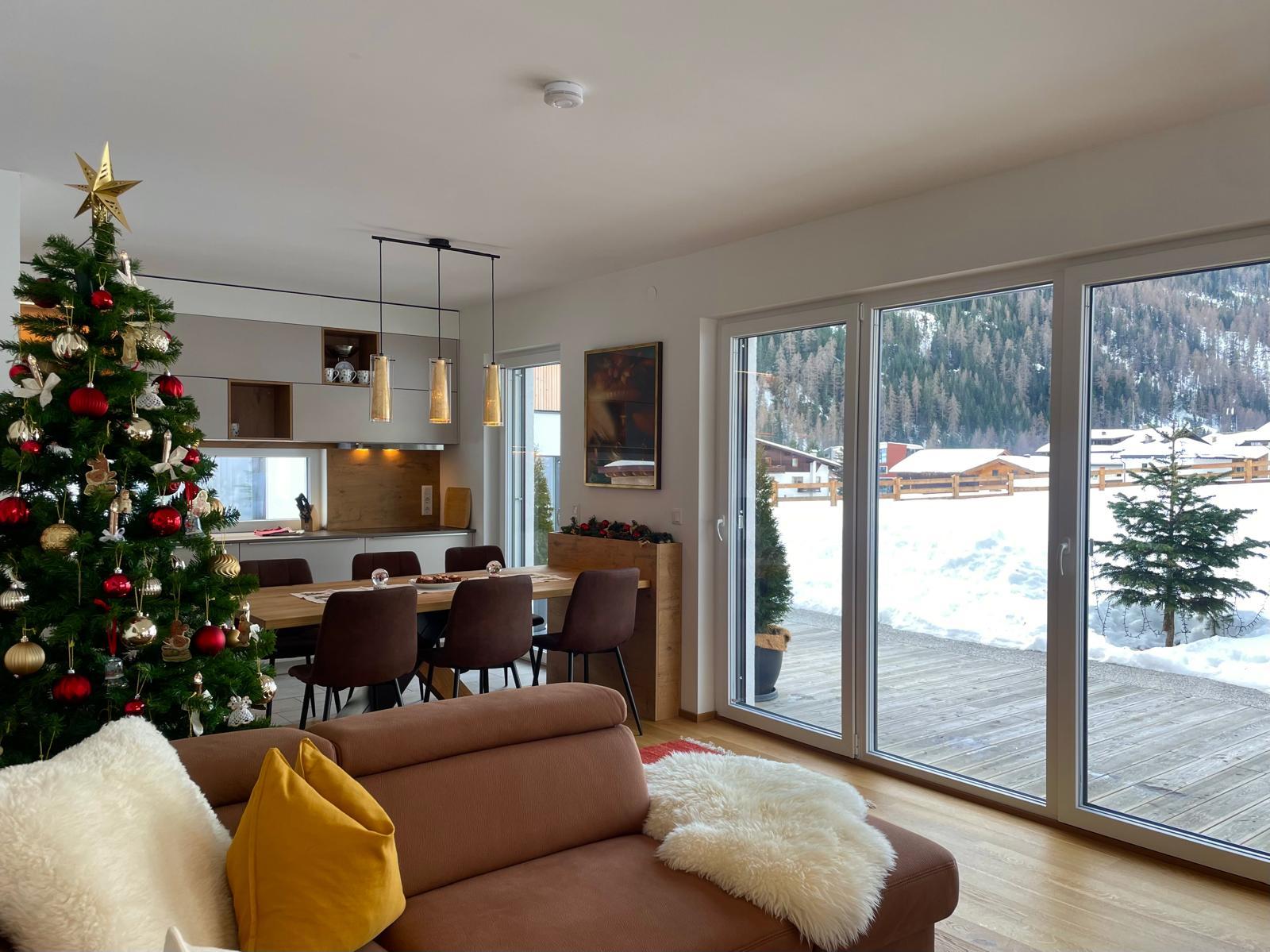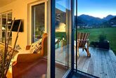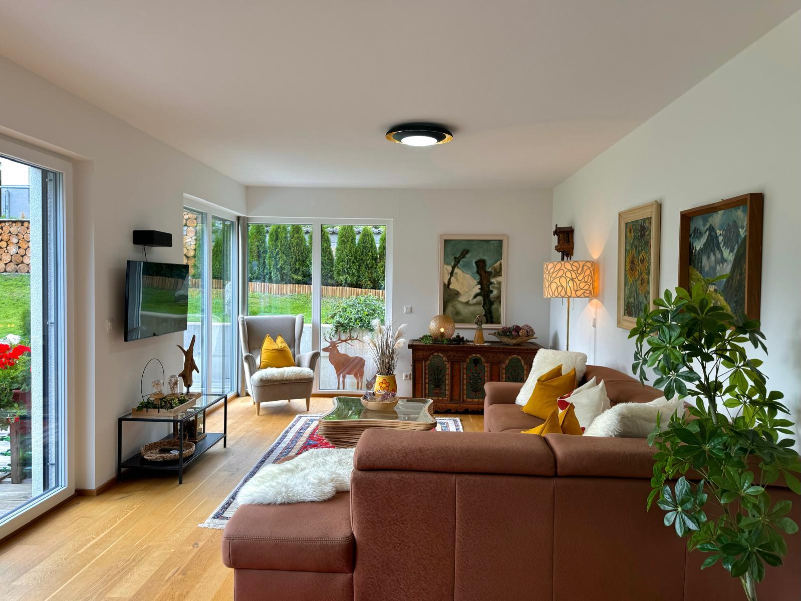 Wohnkomfort mit 2 Terrassen und großem Garten. Wohn-/Premiumkochbereich (35m²), Schlafzimmer mit Zirbenholz-Doppelbetten & Flatscreen-TV, Hauptbad mit Regenwalddusche, Wanne & WC, zweites Bad mit Dusche, zusätzliches separates WC und Infrarotkabine.