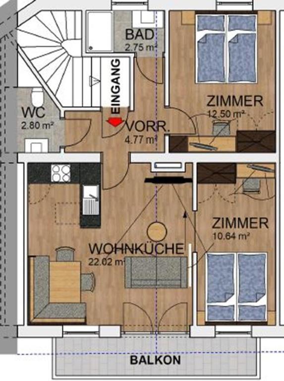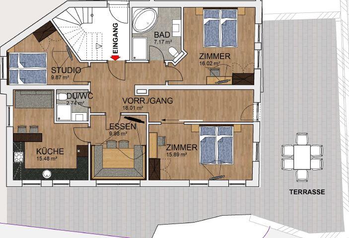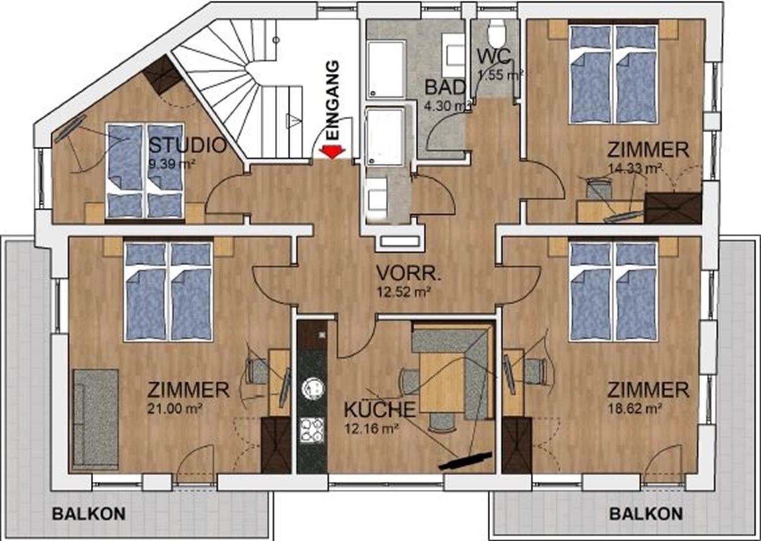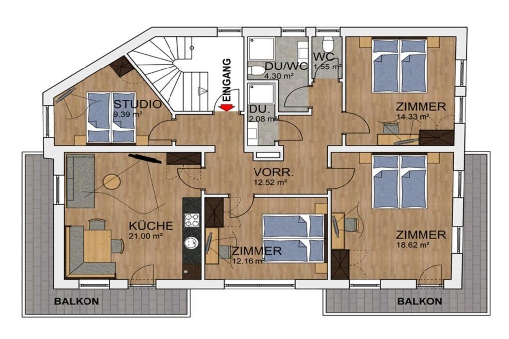 Top 2 mit ca. 96 m²: 4 Doppelzimmer, 2 Badezimmer mit Dusche oder Badewanne, 1 separates WC, vollausgestattete Wohnküche mit Essbereich und 2 Balkone.
