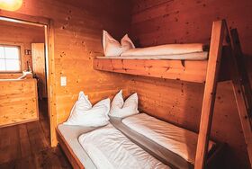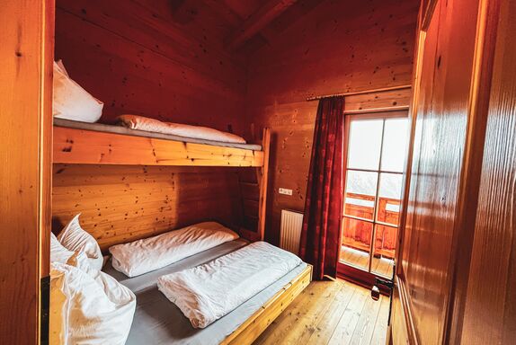 Uriges Dreibettzimmer mit Doppelbett und Stockbett. 2 Zimmer sind mit Balkon, mit wunderschönen Bergblick. 2 Etagenbadezimmer mit Dusche und Waschbecken. Separates WC. Ca. 10 m²