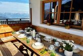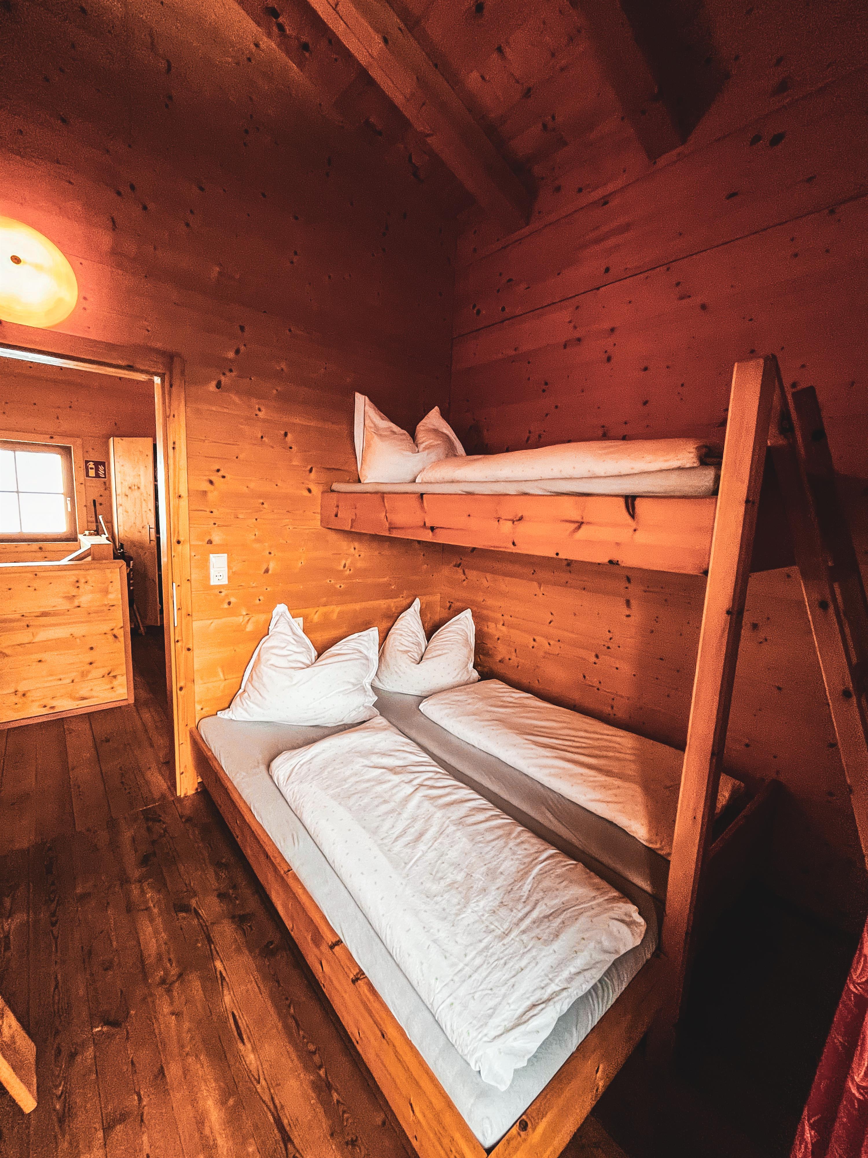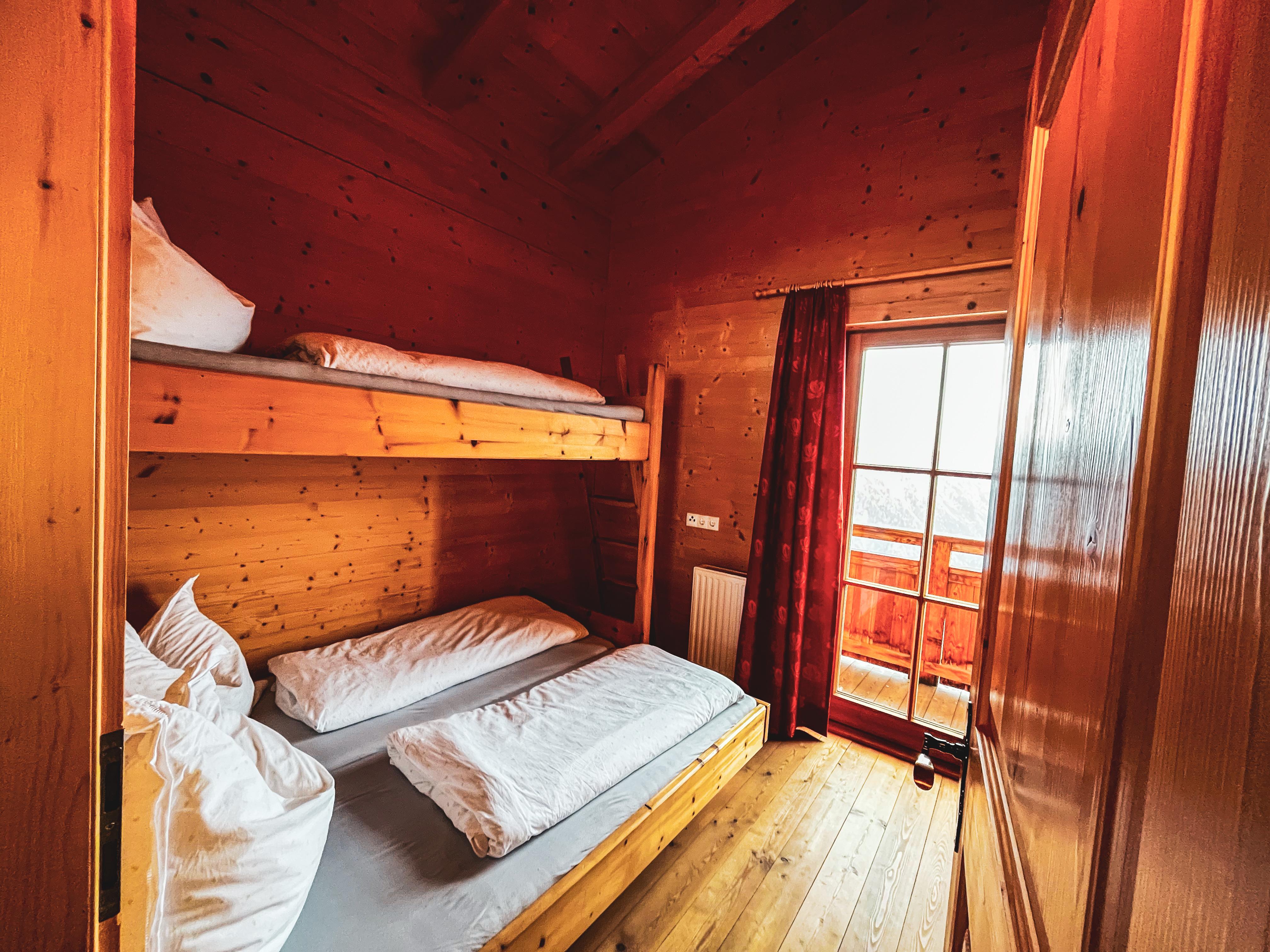 Uriges Dreibettzimmer mit Doppelbett und Stockbett. 2 Zimmer sind mit Balkon, mit wunderschönen Bergblick. 2 Etagenbadezimmer mit Dusche und Waschbecken. Separates WC. Ca. 10 m²