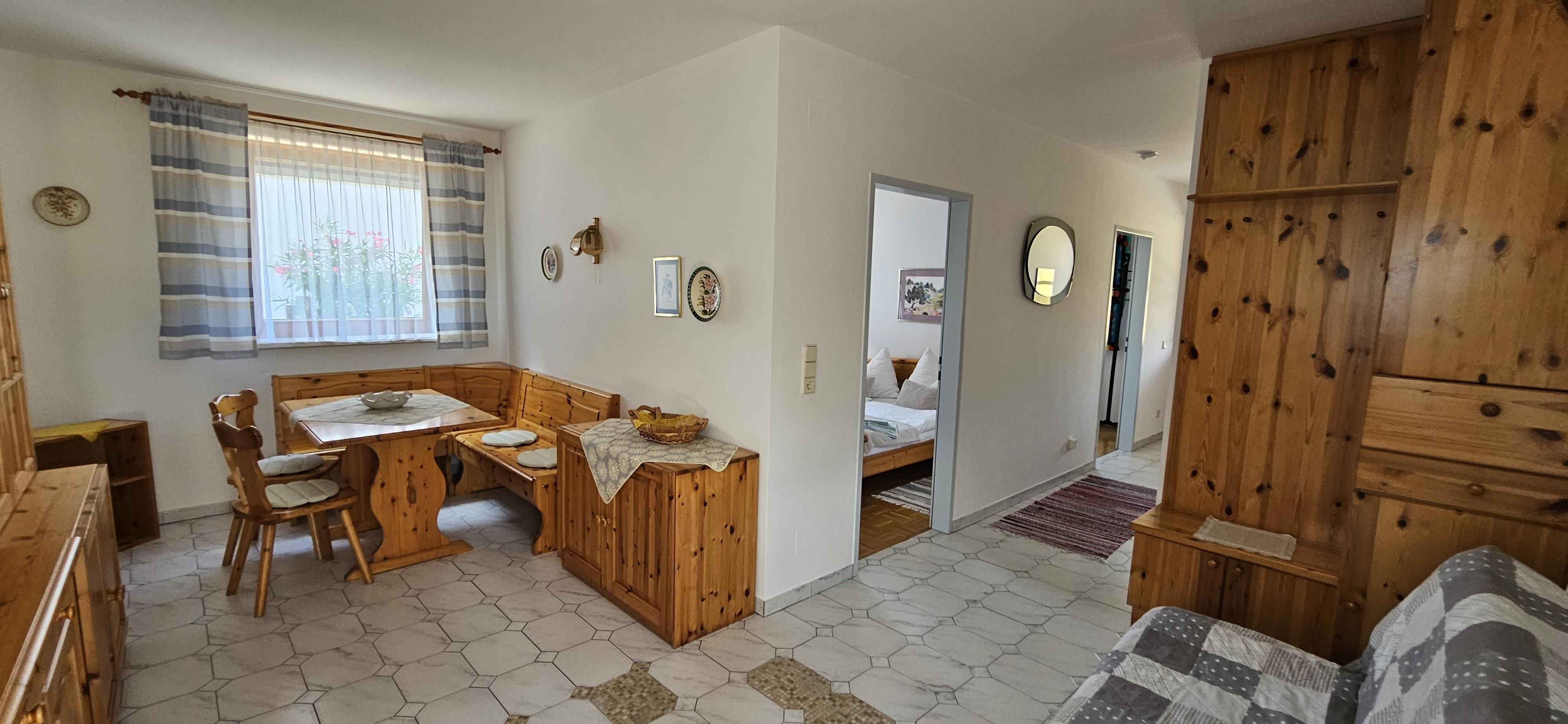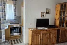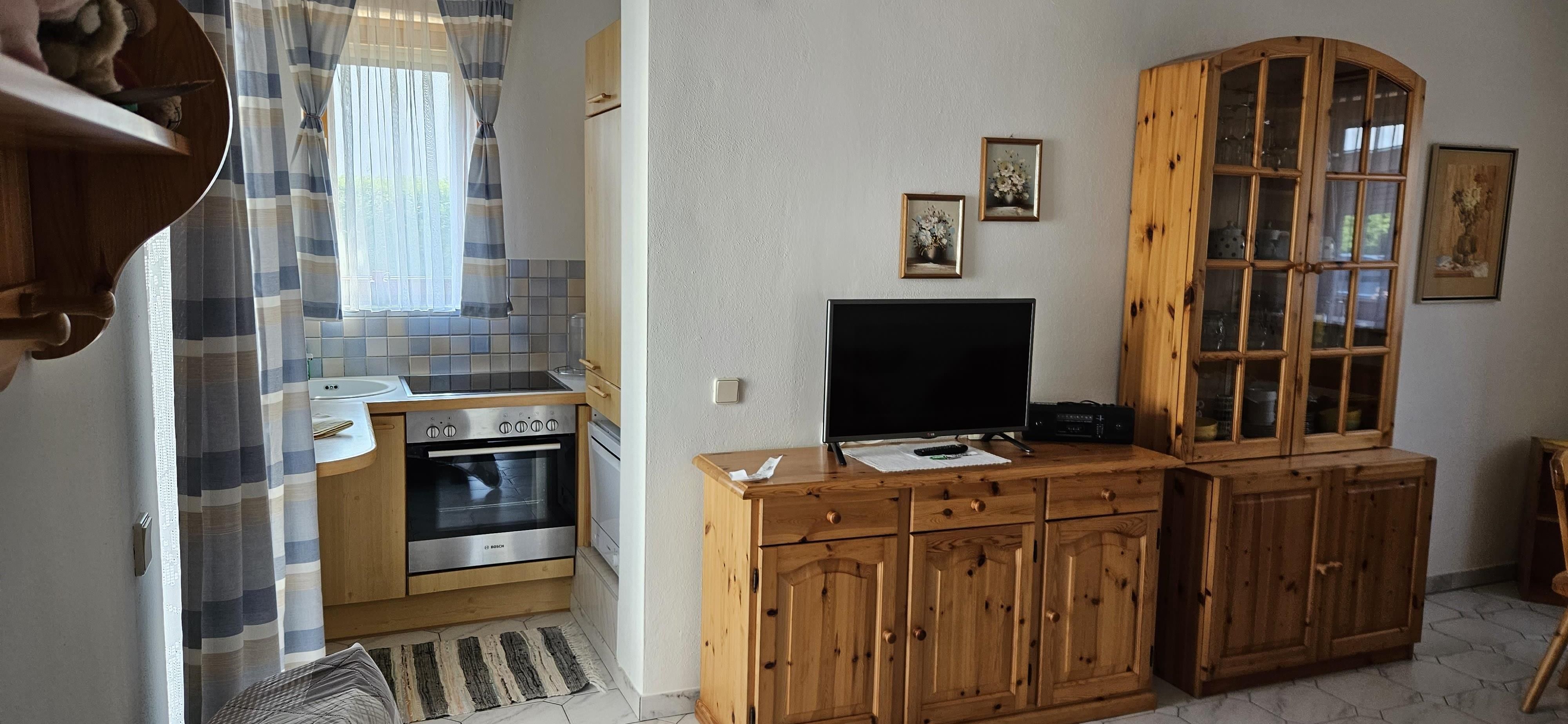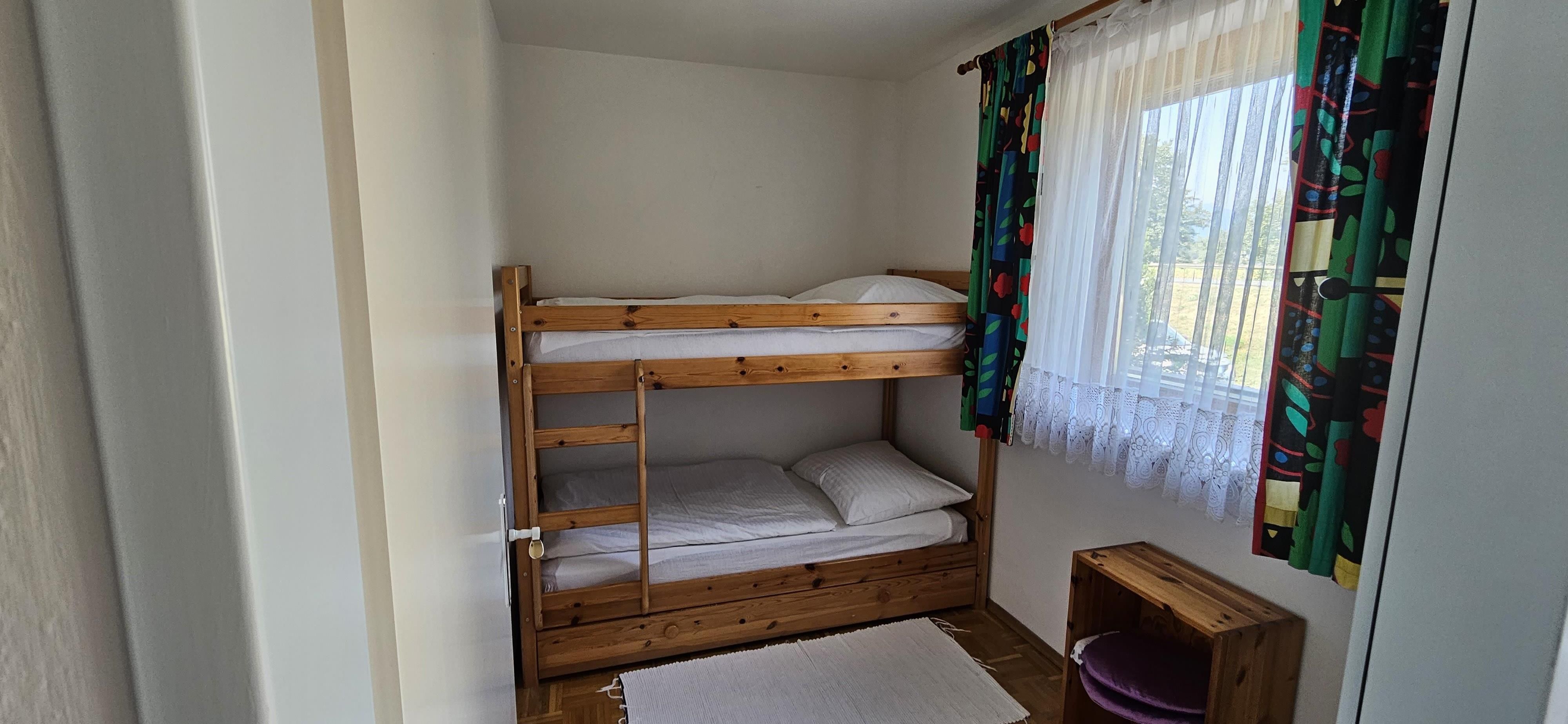 Die Ferienwohnung verfügt über eine Wohnküche, ein Schlafzimmer, Kinderzimmer mit Stockbett, Dusche, WC, glasüberdachte Terrasse mit Sonnenliegen und Gartengarnitur.