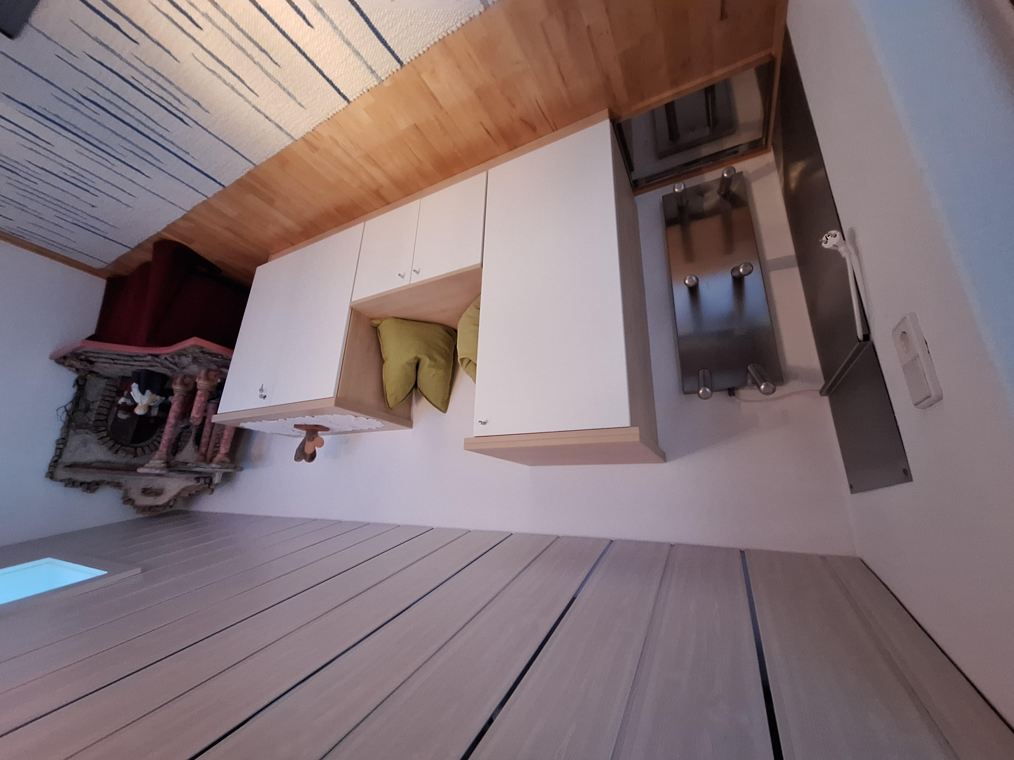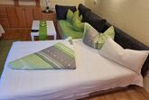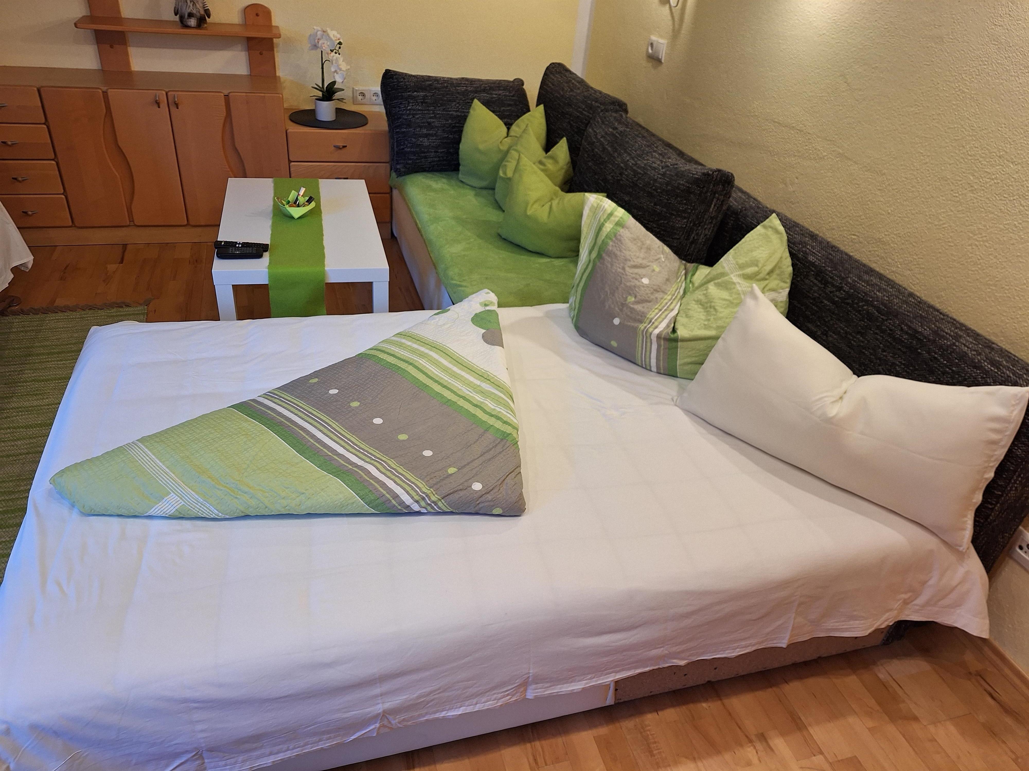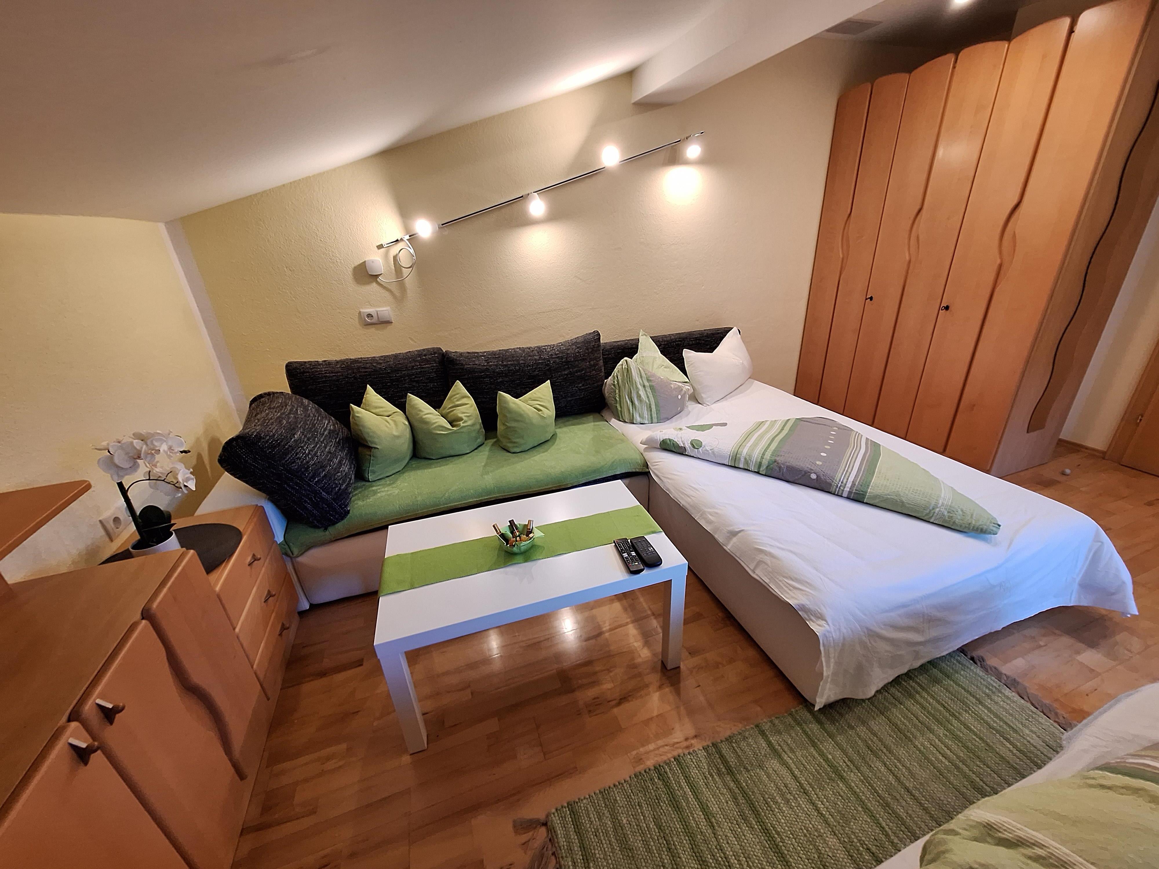 In der Ferienwohnung Nina wohnen Sie in einem hellem Wohnschlafzimmer eine voll ausgestattete Küchenzeile, TV und Radio, sowie ein Badezimmer mit Dusche und WC.