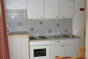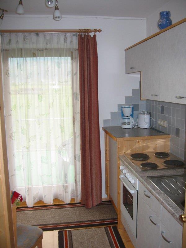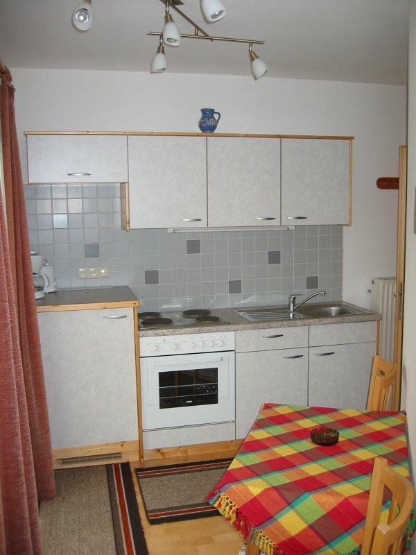 Schöne Wohnung (28m²), 2 Personen mit großem Südbalkon und Mittagskogelblick. Schlafzimmer mit Doppelbett und SAT-TV, Küche mit Esstisch. Dusche/WC, am Balkon befinden sich ein Tisch, Stühle und Kippliegen.