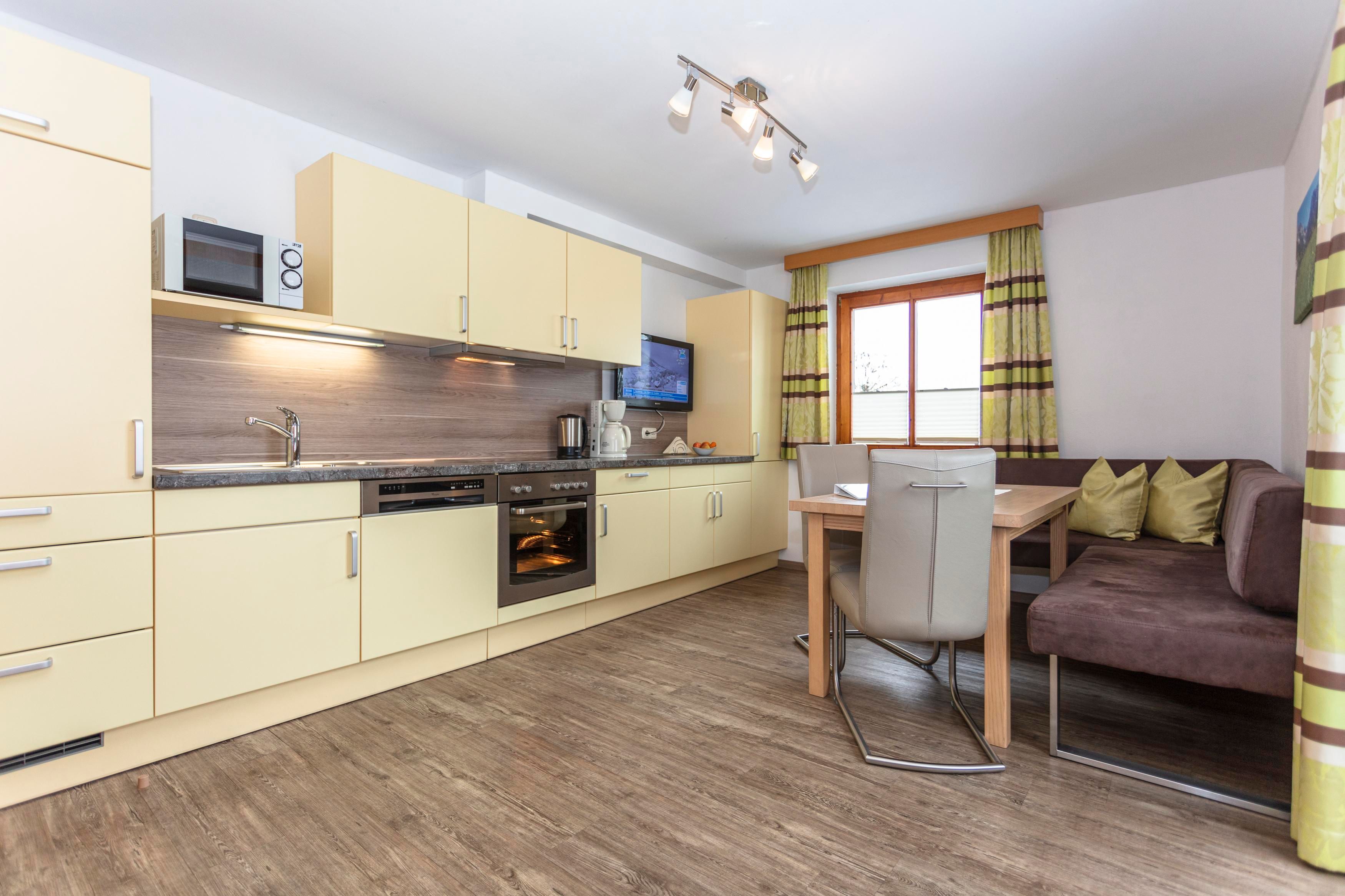 Ausstattung: Komplett ausgestattete Wohnküche mit Geschirrspüler und Micro, gemütliche Eckbank mit großem Esstisch, Kabel TV, gratis Internetanschluss. Schlafzimmer mit Dusche/WC. Balkon oder Terasse. Handtücher und Bettwäsche inklusive, Brötchenservice. HOCHKÖNIGCARD