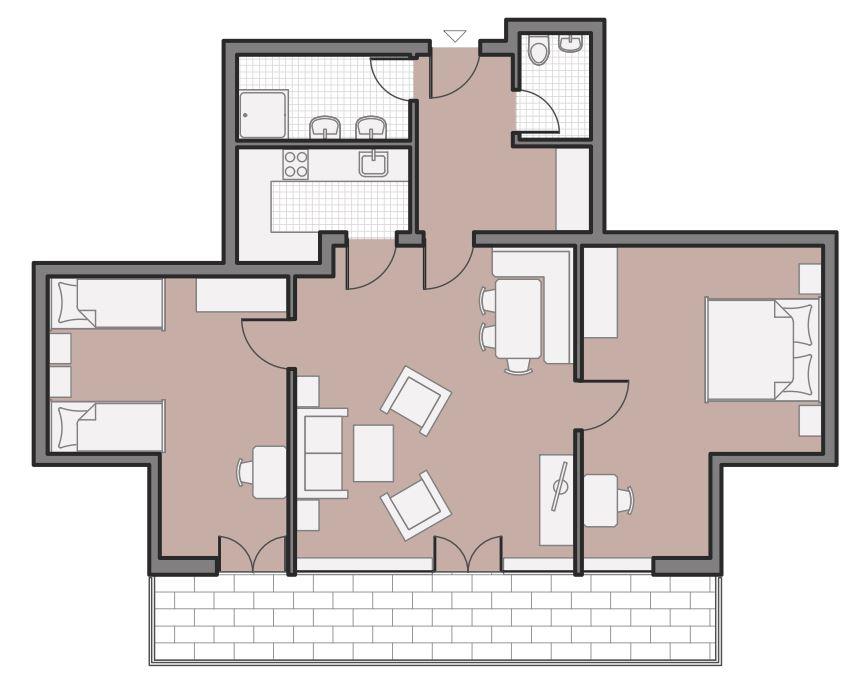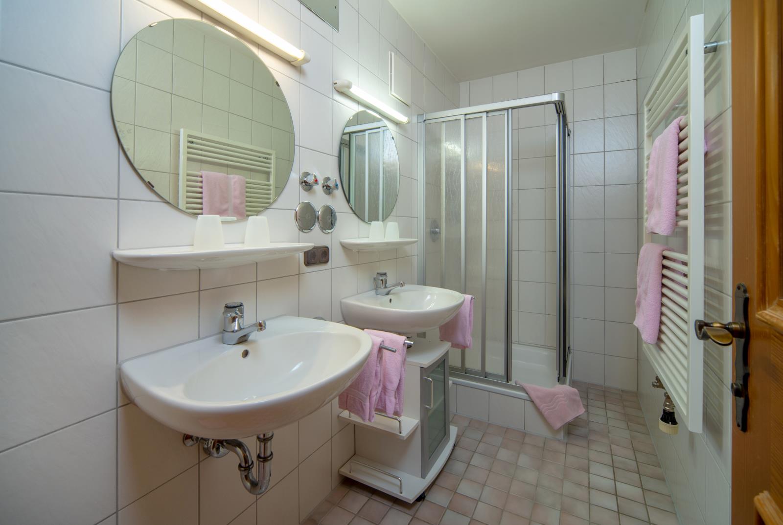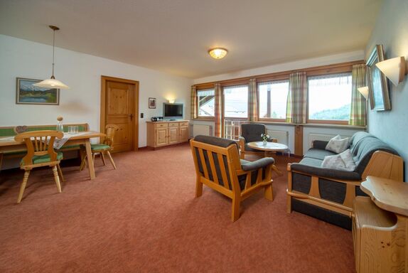 Große 3-Zimmerwohnung (88 qm) mit Wohnzimmer, zwei Doppelzimmer (offene Bettenden und eines mit getrennten Betten), separater Küche mit Spülmaschine und Mikrowelle, Dusche mit Doppelwaschbecken und separatem WC, Flachbild-TV, Radio und Südbalkon mit grandiosem Blick auf die Oberstdorfer Berge.