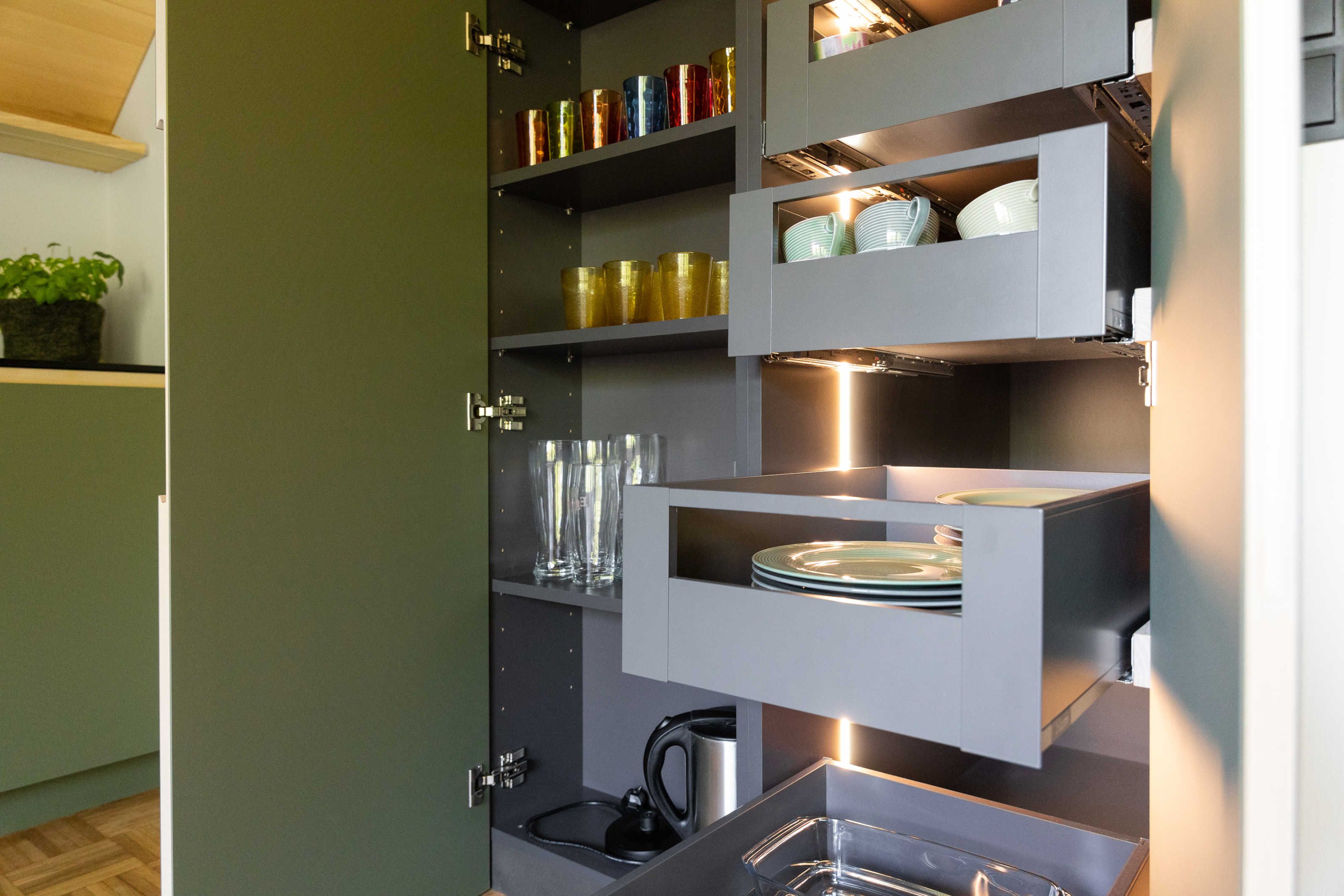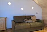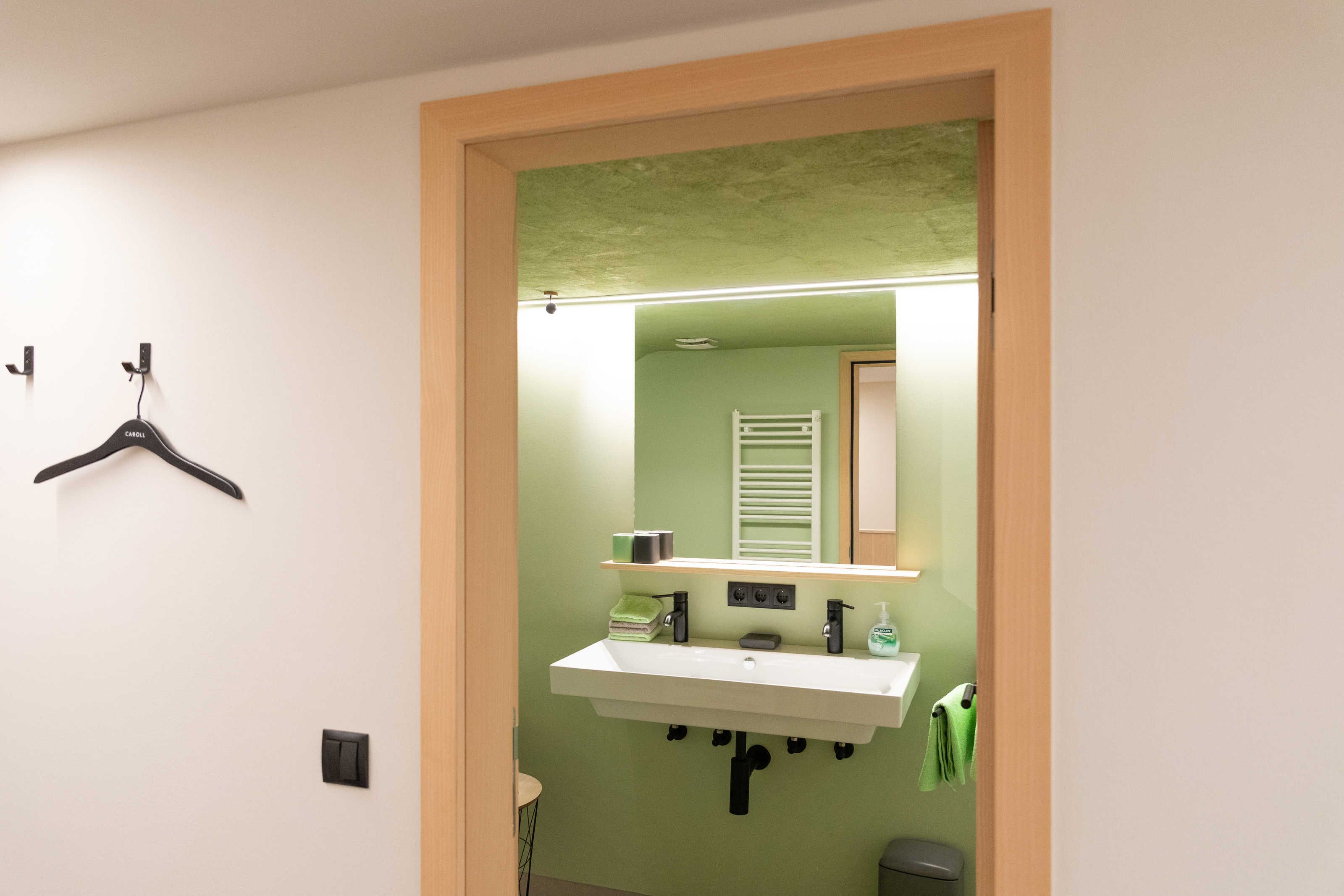 Die Küche ist mit Geschirrspüler, Herd, Backofen, Geschirr, Geschirrtüchern und mit einer Kaffeemaschine (Filtermaschine und Senseo-Pad) ausgestattet. Im Wohnraum steht ein Qualitätsschlafsofa für ein bis zwei Erwachsene zur Verfügung. Zur Ausstattung des Wohnraumes gehört ein Fernseher mit Smart-TV-Funktionen, sowie kostenfreies WLAN. Das separate südseitig ausgerichtete Schlafzimmer mit einem Doppelboxspringbett und das Badezimmer sind ebenfalls von qualitativer Bregenzerwälder Handarbeit gekennzeichnet. Handtücher und Bettwäsche sind ausreichend und zum Wechseln vorhanden. Der Zugang und der Vorraum sind großzügig gestaltet.