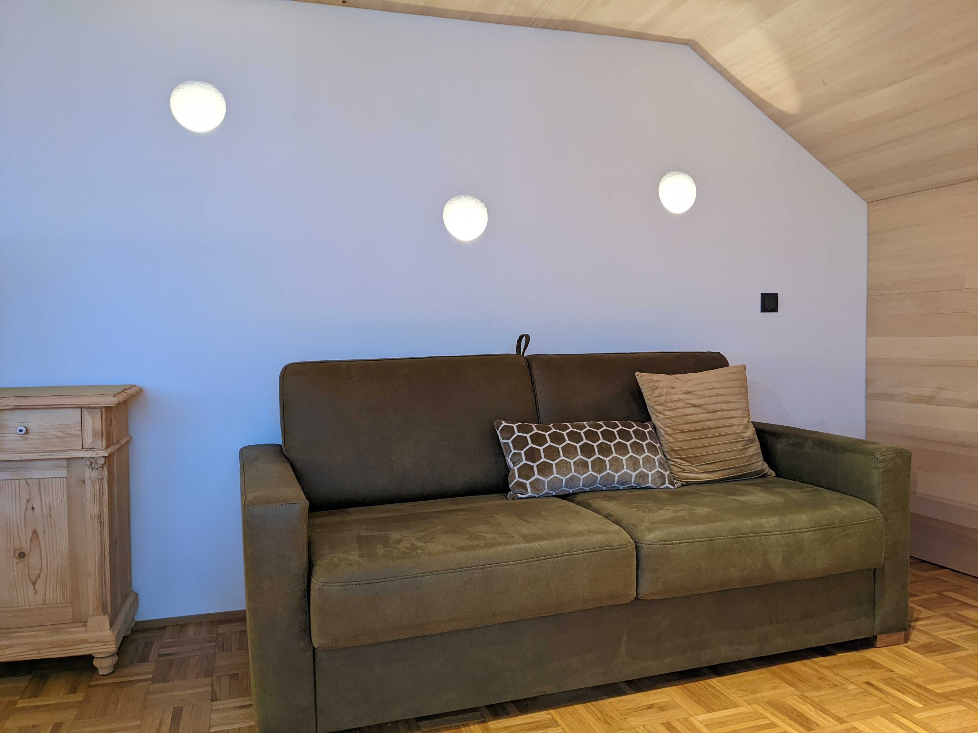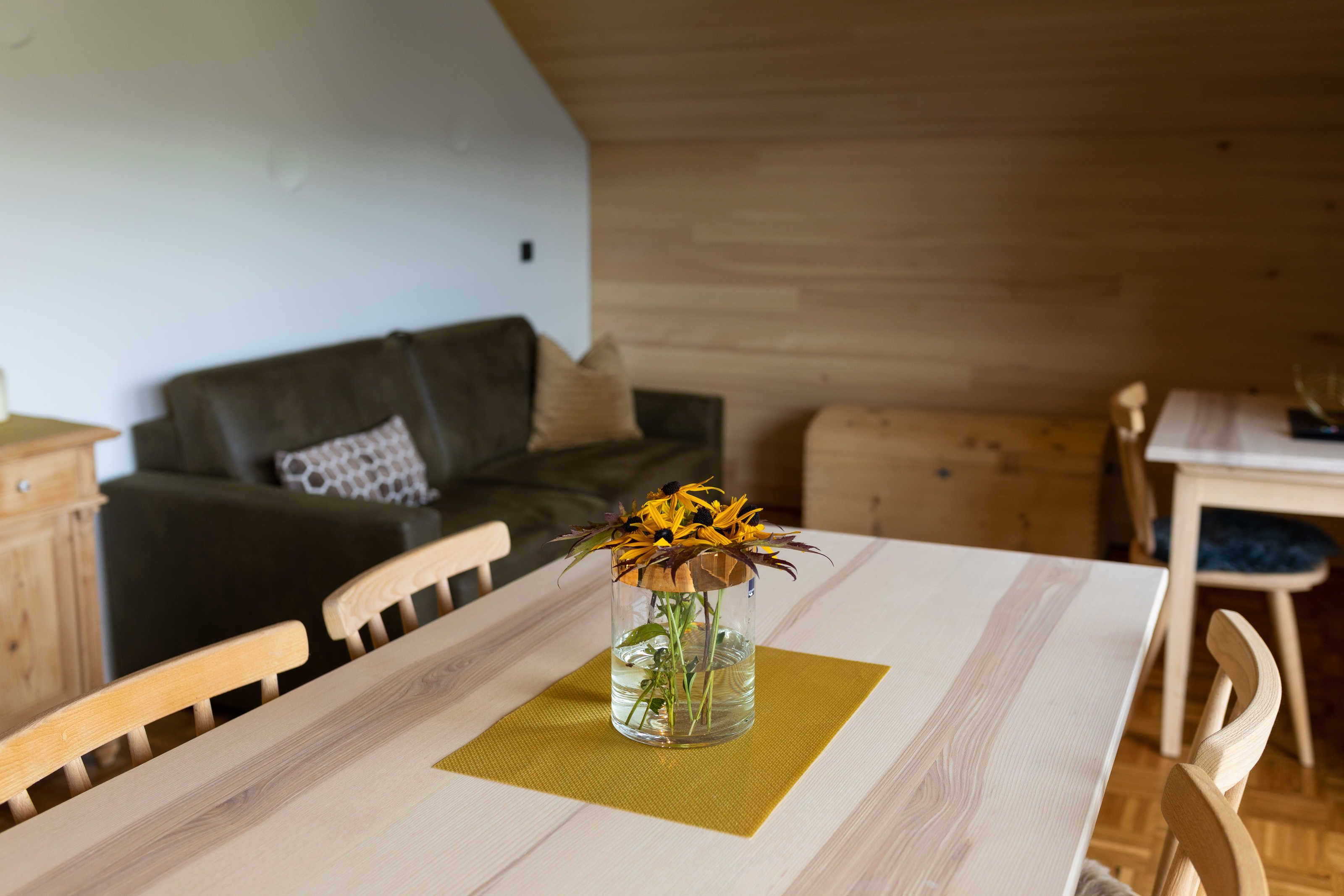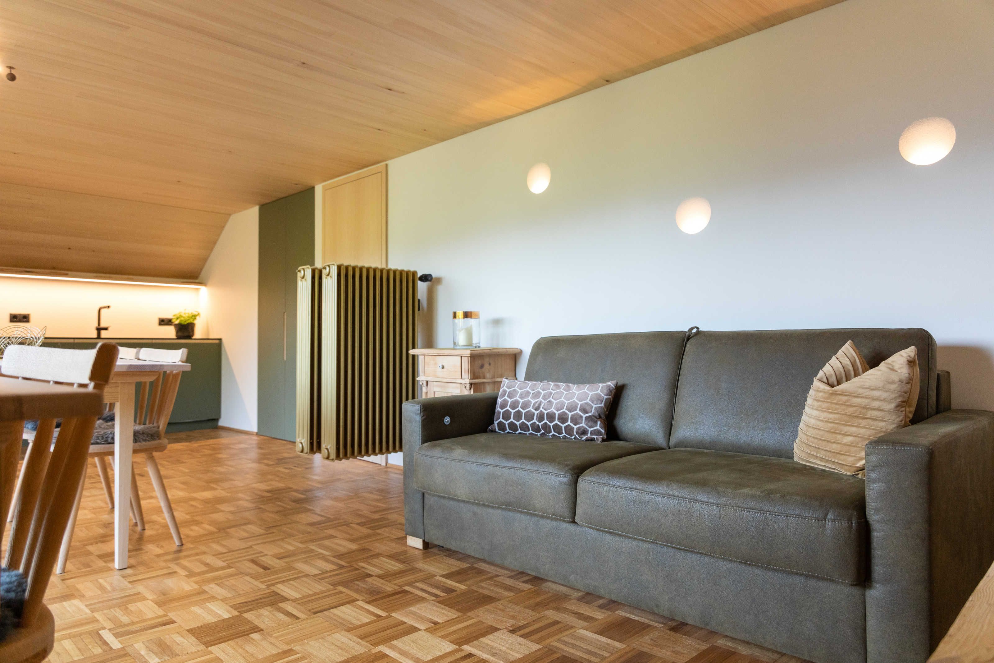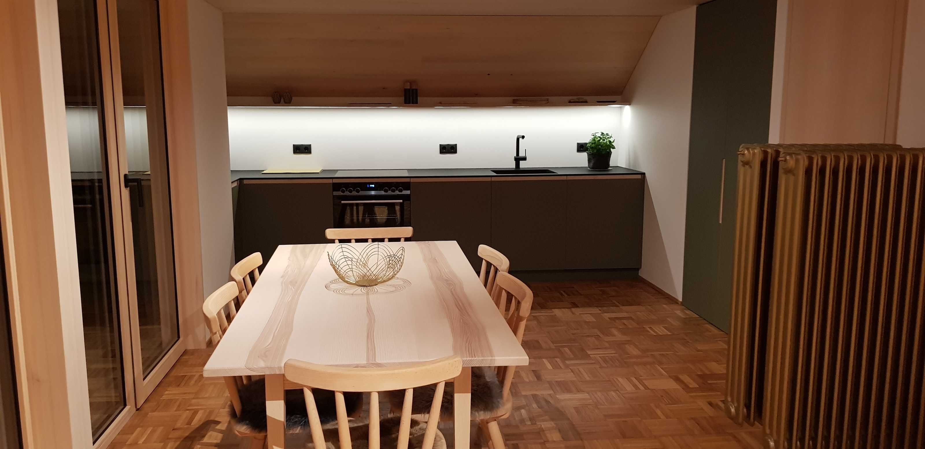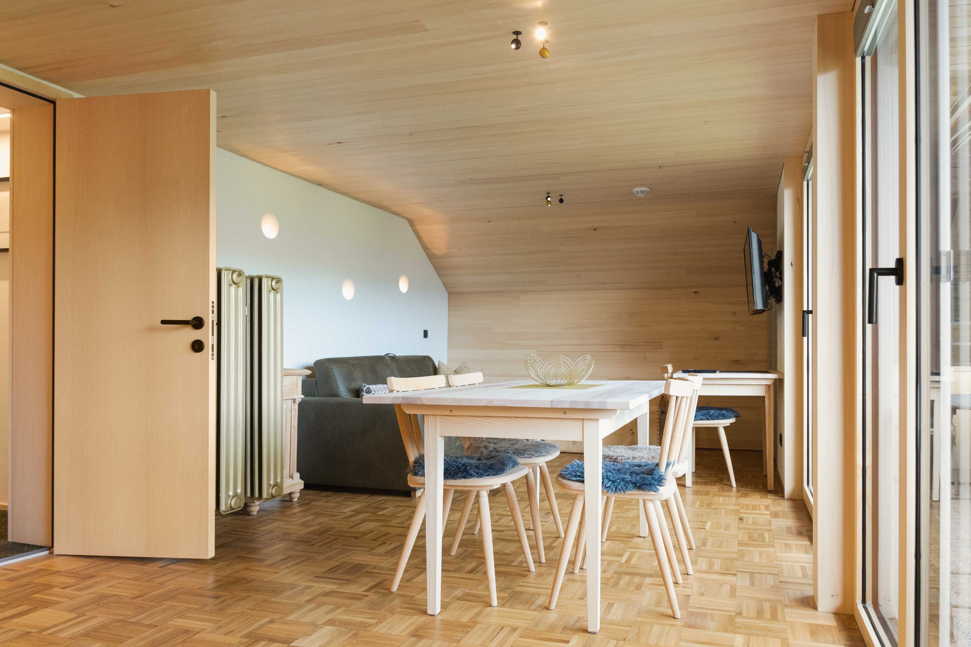 Die Ferienwohnung Ifen wurde 2021 vollständig renoviert und umgestaltet. Es steht nun ostseitig ein großzügiger Wohn-, Ess- und Schlafraum mit integrierter Küche und Balkon und ein Schlafzimmer zur Verfügung. Die Räume sind hochwertig mit heimischem Holz aus Weißtanne getäfert. Die Möbel und die Küche stammen vom Bregenzerwälder Tischlermeister. Die Planung und die Beleuchtung stammt von Georg Bechter Licht und Architektur aus Hittisau.