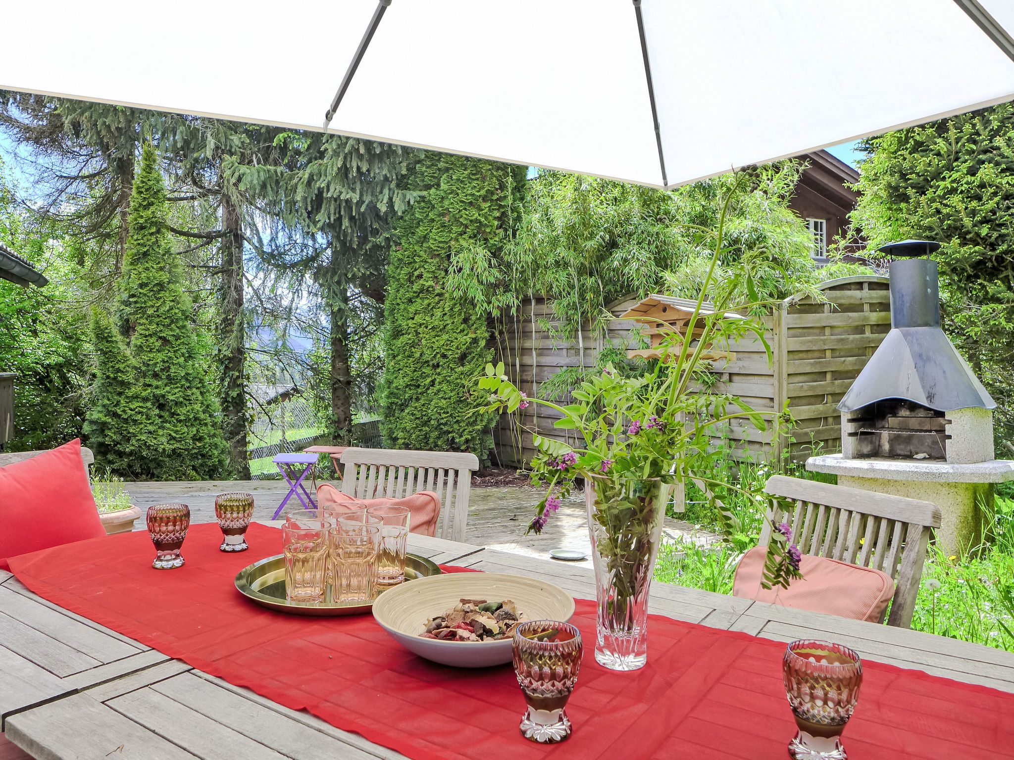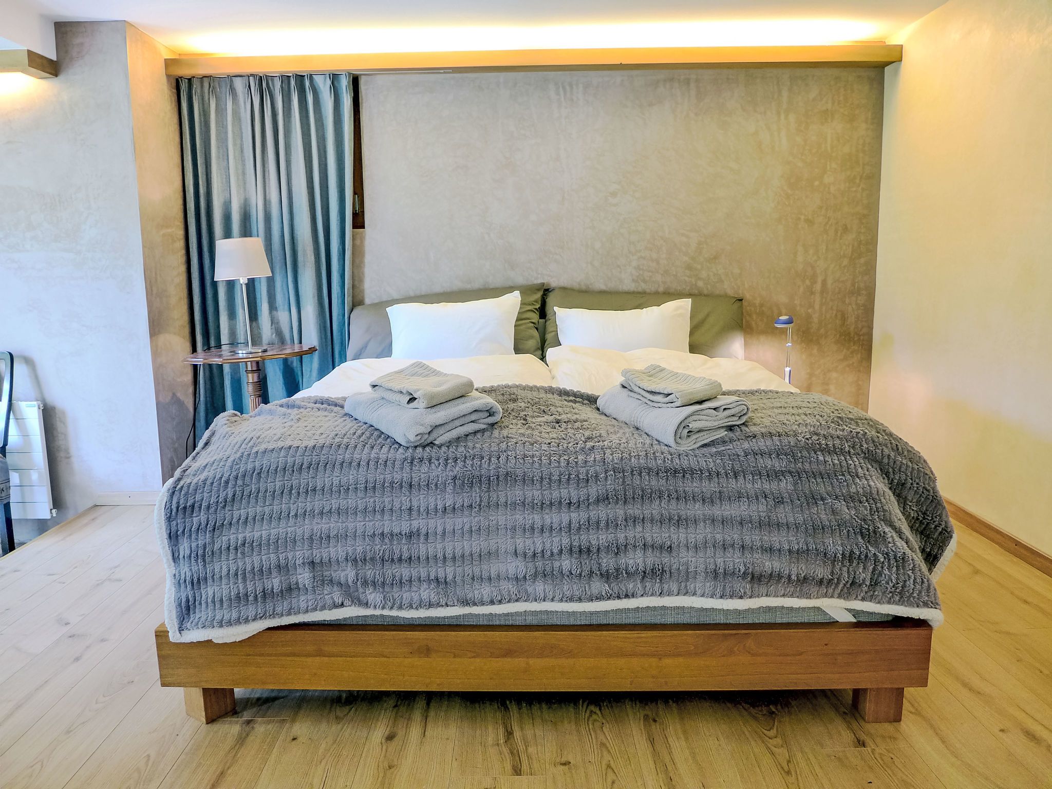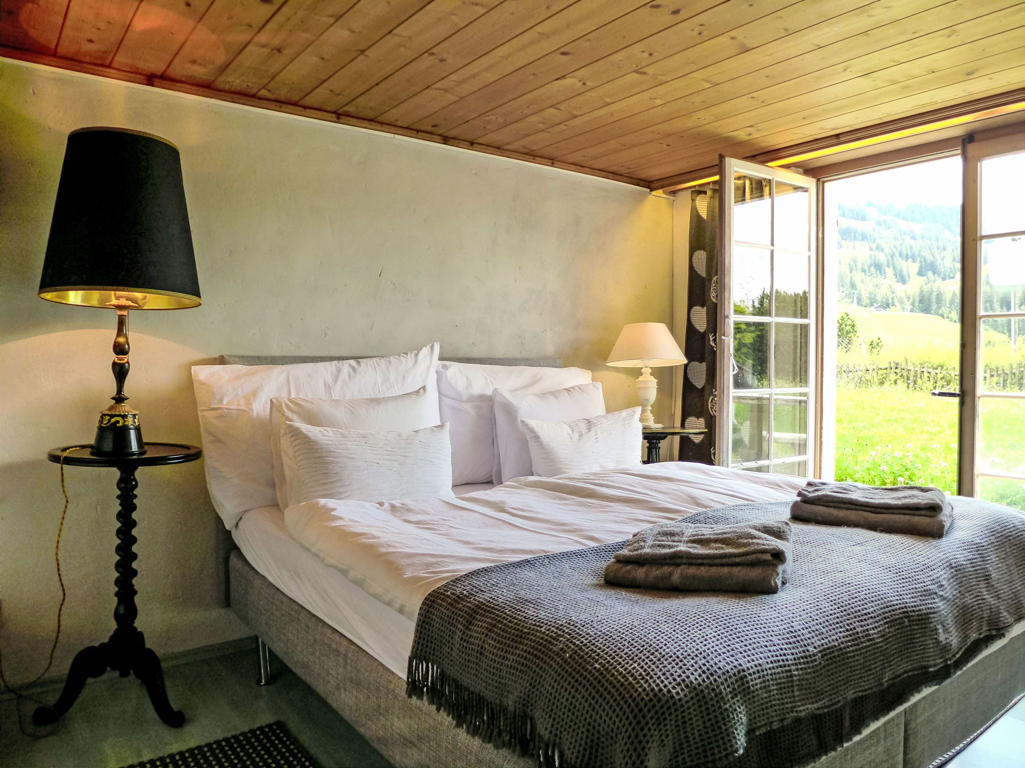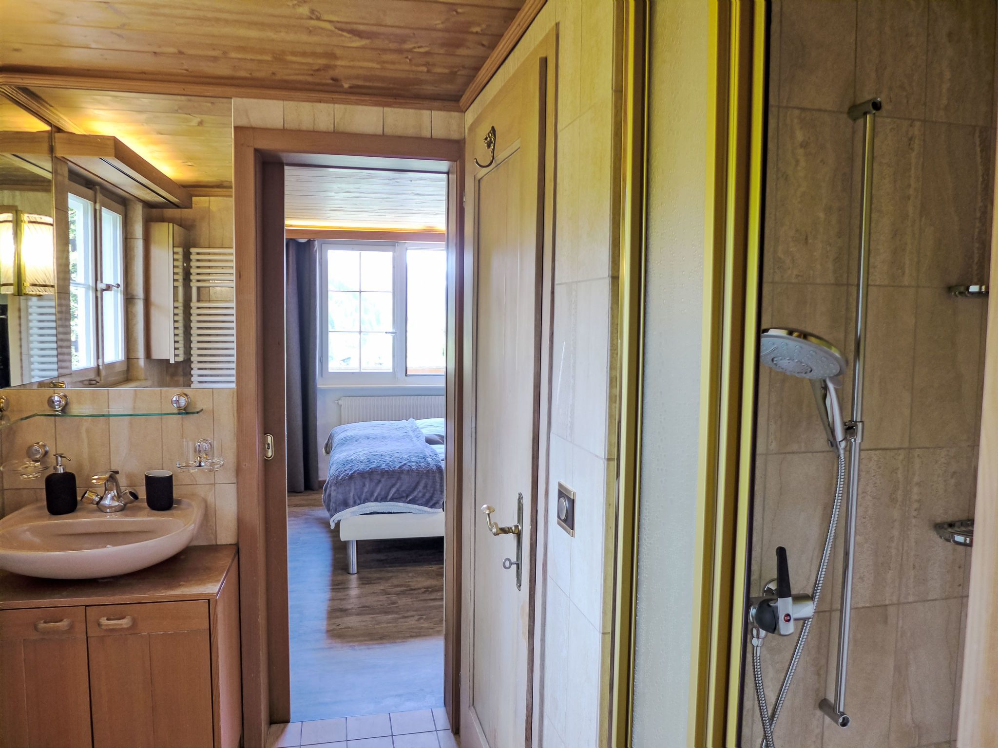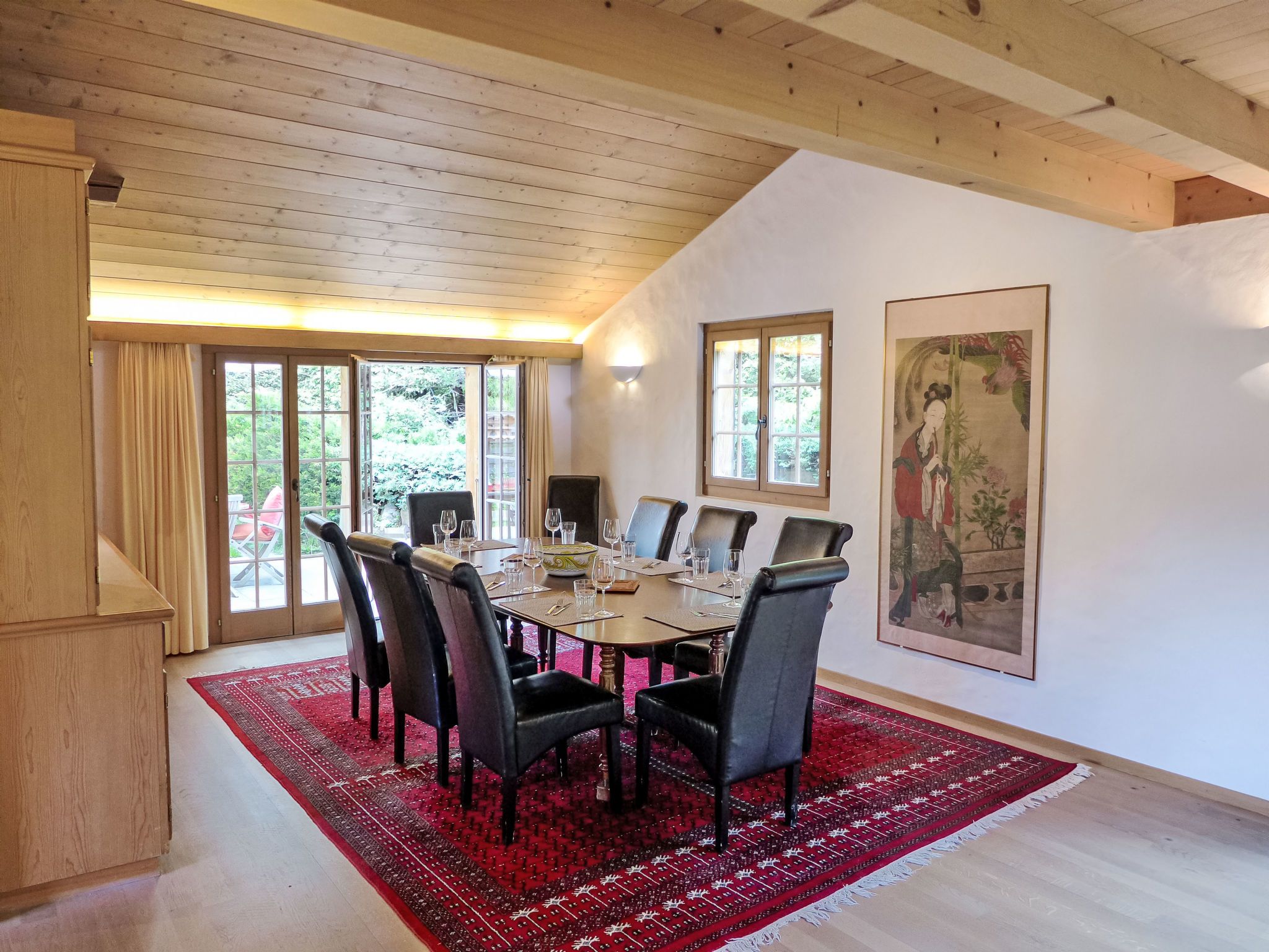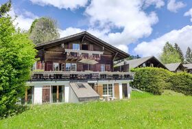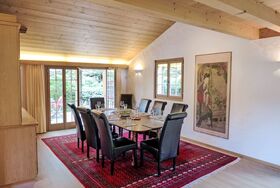7-Zimmer-Chalet 280 m2 auf 3 Stockwerken. Geräumig und hell, sehr komfortabel und geschmackvoll eingerichtet: offenes grosses Wohnzimmer mit offenem Kamin. Ausgang zum Balkon. Offenes Esszimmer mit Esstisch. Ausgang zur Terrasse. 1 Zimmer mit 1 Doppelbett (160 cm, Länge 200 cm). 1 Zimmer mit 1 franz. Bett (140 cm, Länge 200 cm). Grosse, offene Küche (Backofen, Geschirrspüler, 4 Induktionskochplatten, Toaster, Wasserkocher, Mikrowelle, Tiefkühler, elektrische Kaffeemaschine, Dampfgarer, Racletteofen, Kochinsel, Fondue Set (Käse)). Dusche/WC. Unteres Geschoss: 1 grosses Zimmer mit begehbarem Kleiderschrank mit 1 Doppelbett (160 cm, Länge 200 cm), Dusche/WC und TV. Ausgang zum Garten. 1 Zimmer mit 1 Doppelbett (160 cm, Länge 200 cm), Bad/WC und TV. Ausgang zum Garten. 1 kleines Zimmer, ohne Fenster mit 1 franz. Bett (140 cm, Länge 200 cm), Dusche/WC und TV. Dachgeschoss: offene Galerie. 1 grosses Zimmer mit begehbarem Kleiderschrank mit 1 Doppelbett (160 cm, Länge 200 cm), Bad/Dusche/WC und TV. Ausgang zum Balkon. Grosse Terrasse, Gartensitzplatz. Terrassenmöbel. Herrliche Panoramasicht auf die Berge, die Skipiste und die Landschaft. Zur Verfügung: Waschmaschine, Wäschetrockner, Bügeleisen, Haartrockner, Holz (extra). Internet (WLAN, gratis). Bitte beachten: Nichtraucher-Haus. Maximal 1 Haustier/Hund erlaubt. Rauchmelder, Feuerlöscher. Bei Belegung mit weniger Personen als der maximalen Personenzahl stehen nicht alle Wohneinheiten zur Verfügung.