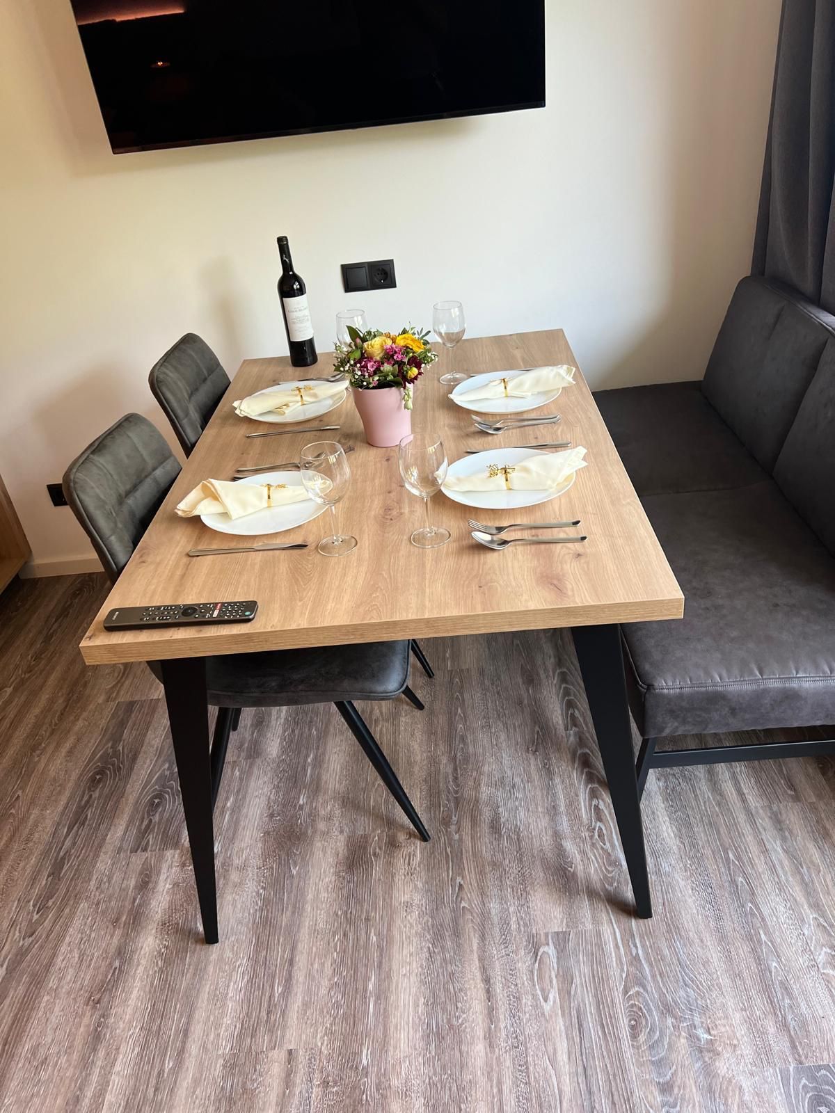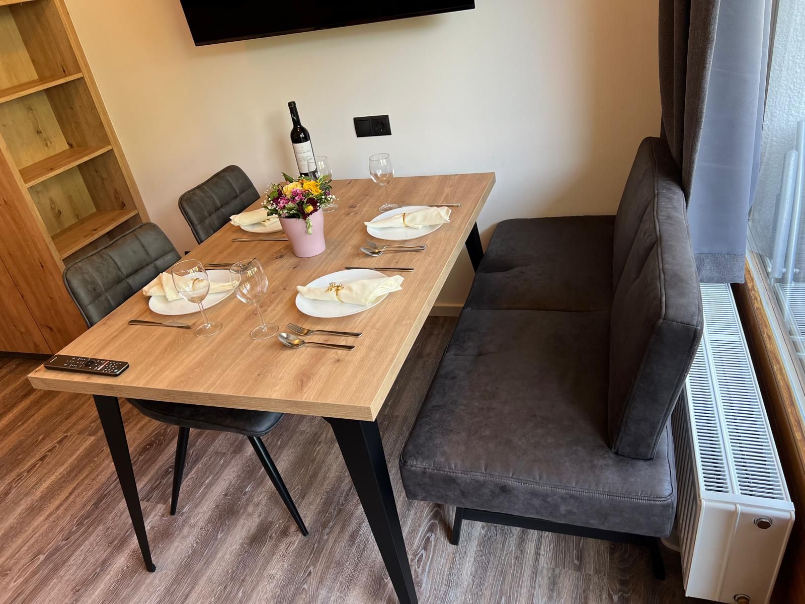 - Geräumiges Wohnzimmer: Das Wohnzimmer ist hell und einladend gestaltet. Es bietet eine gemütliche Sitzecke mit modernen Sofas und Sesseln, die zum Entspannen einladen. Ein großer Flachbildfernseher mit internationalen Kanälen und Streaming-Diensten sorgt für beste Unterhaltung.