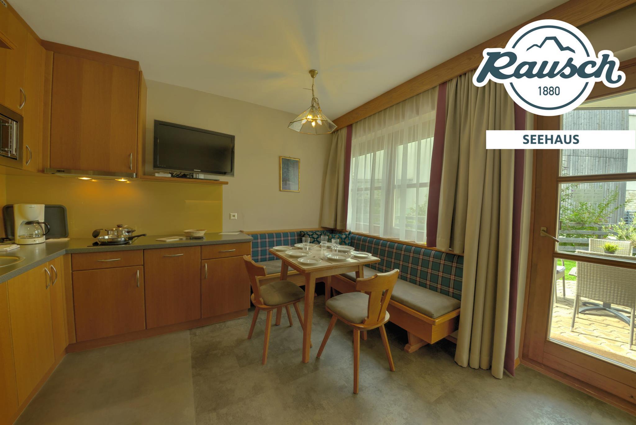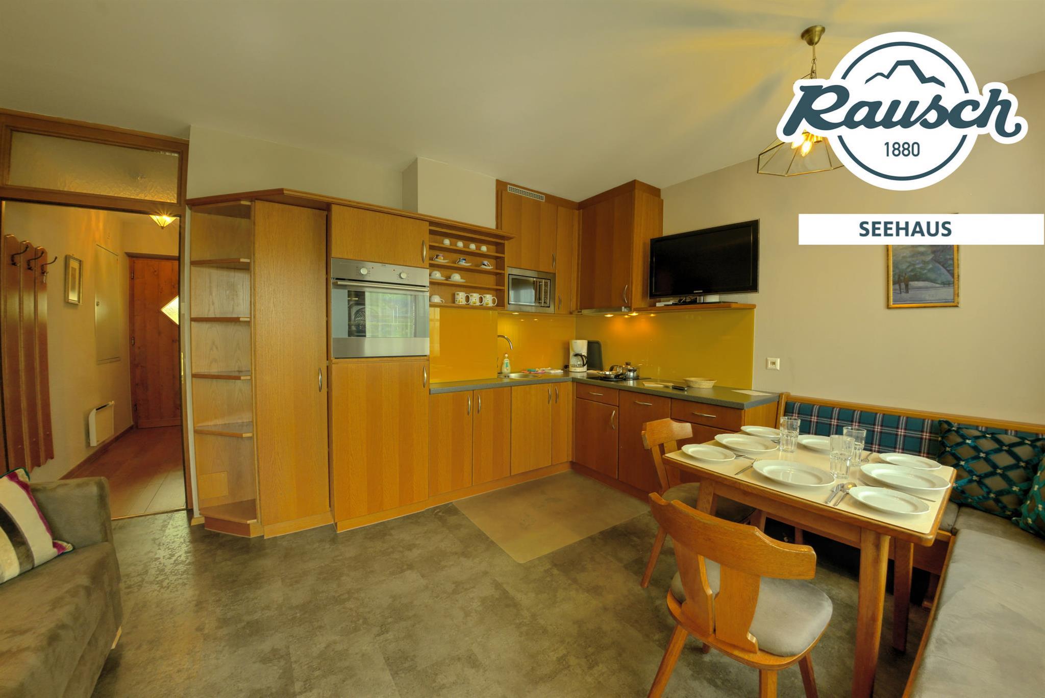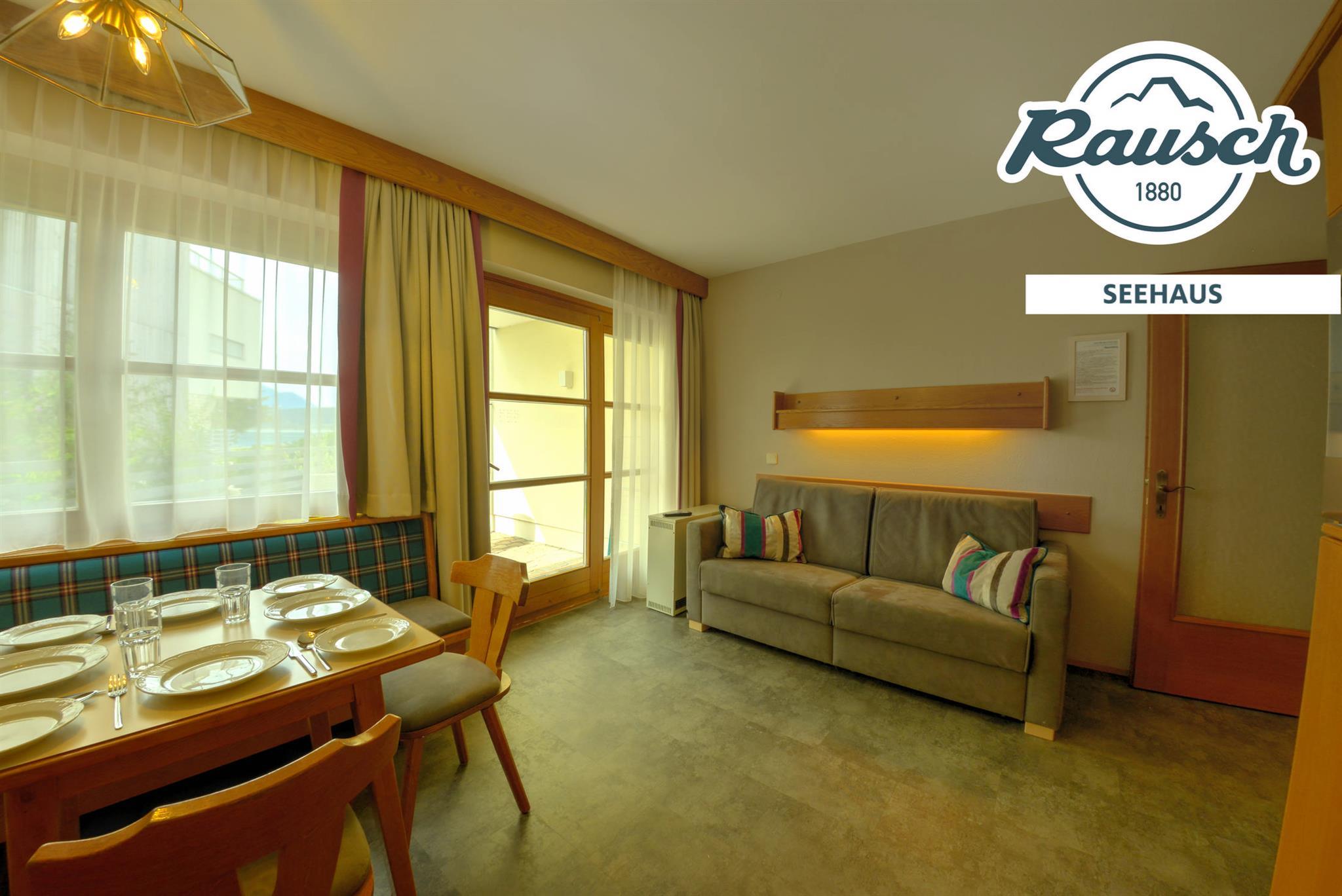 1 Schlafraum mit Doppelbett, 1 Wohnraum mit 2 Ausziehcouchen, Kochnische (ua. mit Backrohr und Geschirrspüler) , Essecke, Zimmersafe, Sat-TV, kostenloses WLAN, 1 Bad mit Dusche und großem Waschbecken, 1 getrenntes WC, Terrasse oder Balkon mit Sitzgelegenheit, 1 kleiner Vorraum.