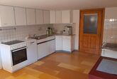 • Küche mit Eckbank, Esstisch, Kühlschrank, Elektroherd, Geschirrspüler und Backrohr