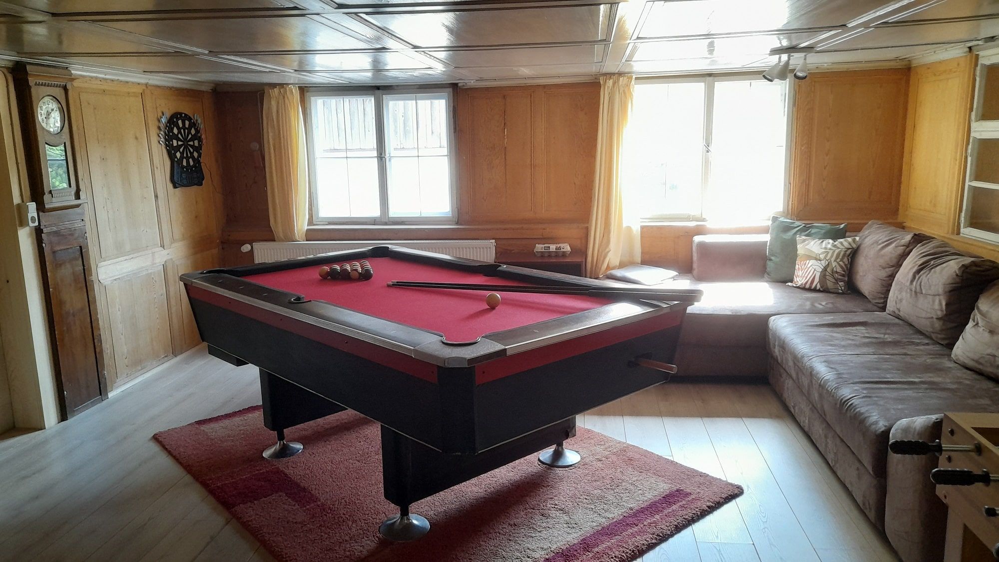 Ein Spieleraum mit Billiardtisch, Tischfußball sowie Dart, lädt im Erdgeschoss zum geselligen Spielen ein.