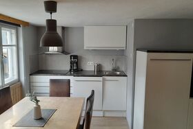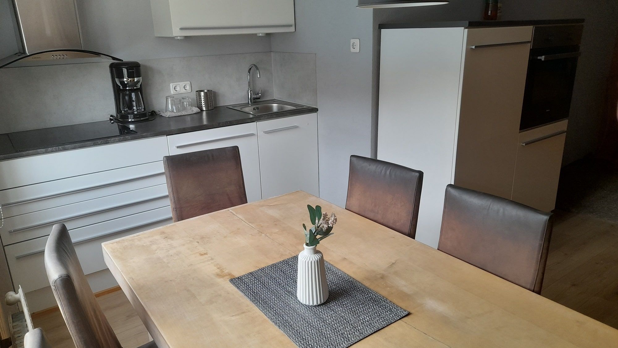 Küche mit Esstisch, Kühlschrank, Elektroherd, Geschirrspüler