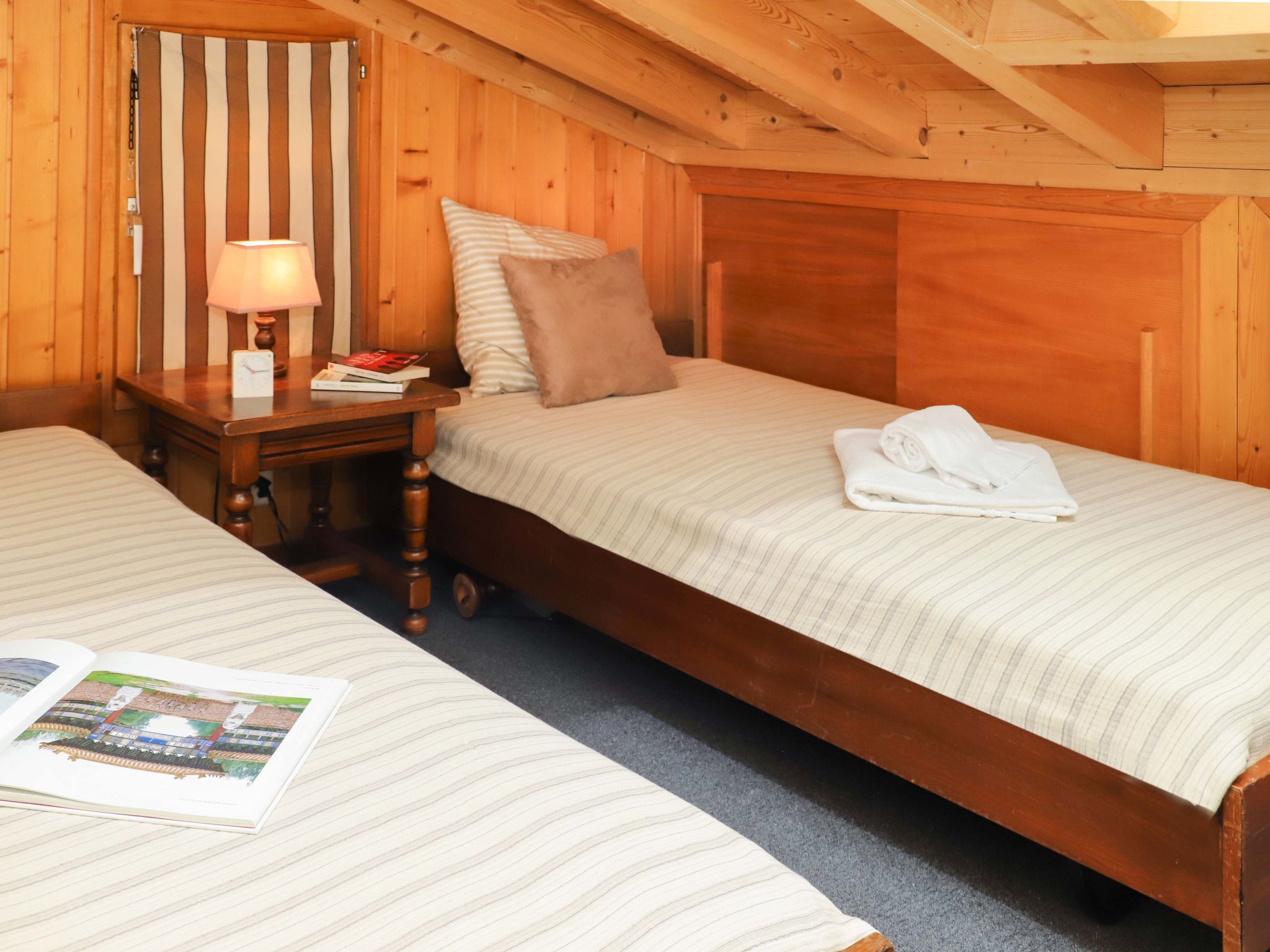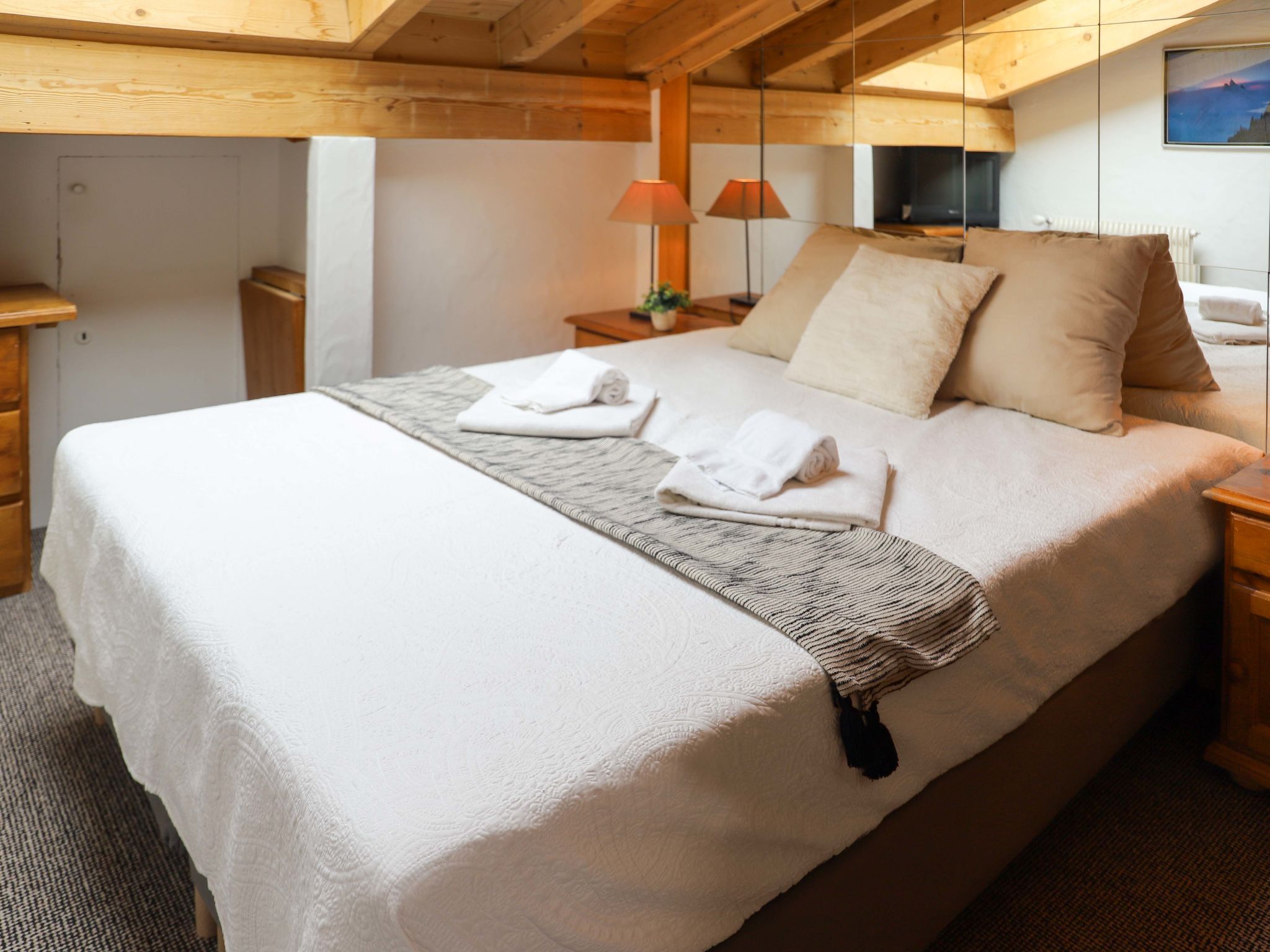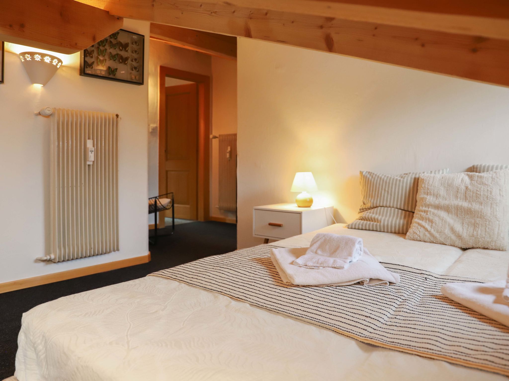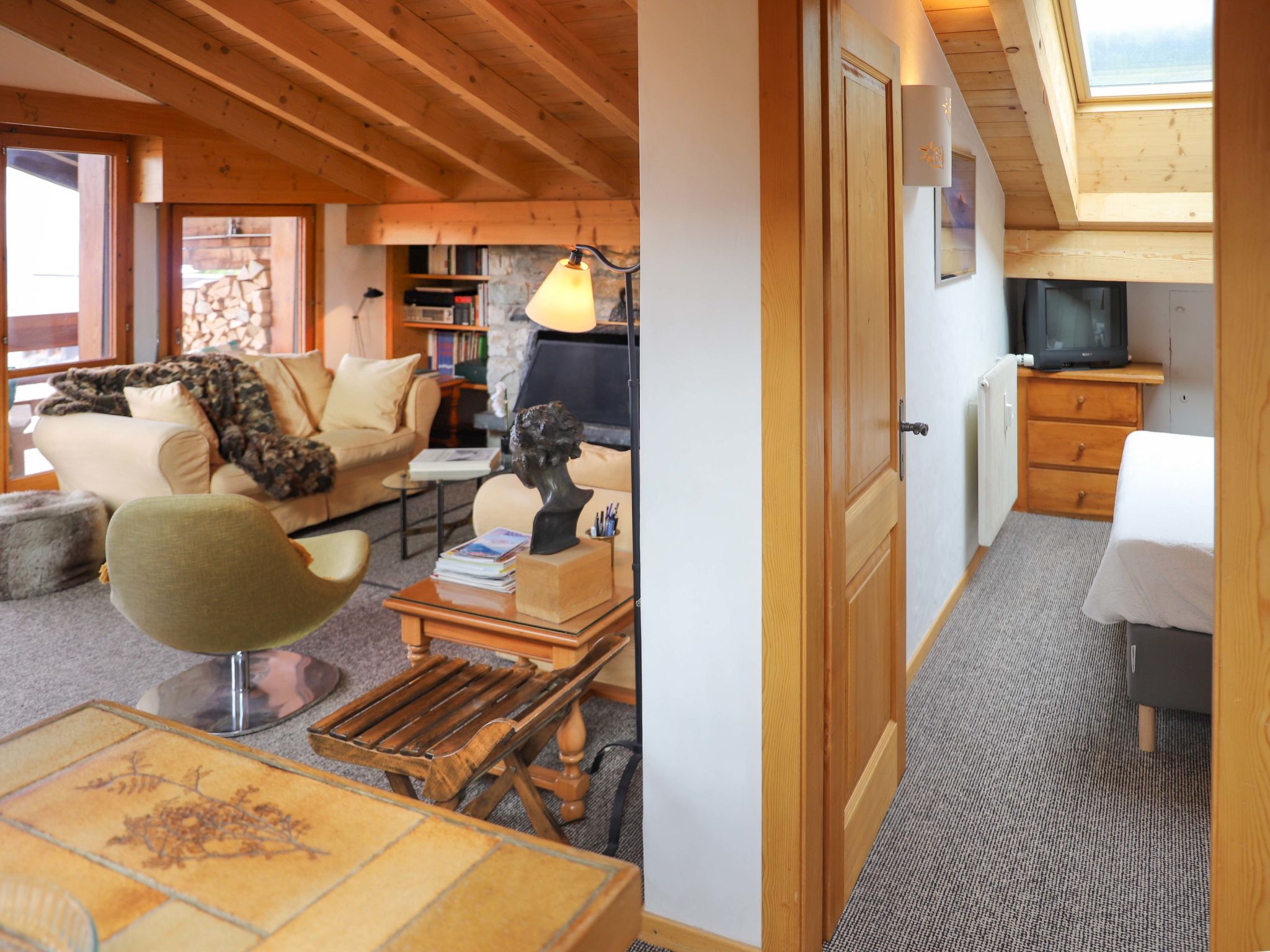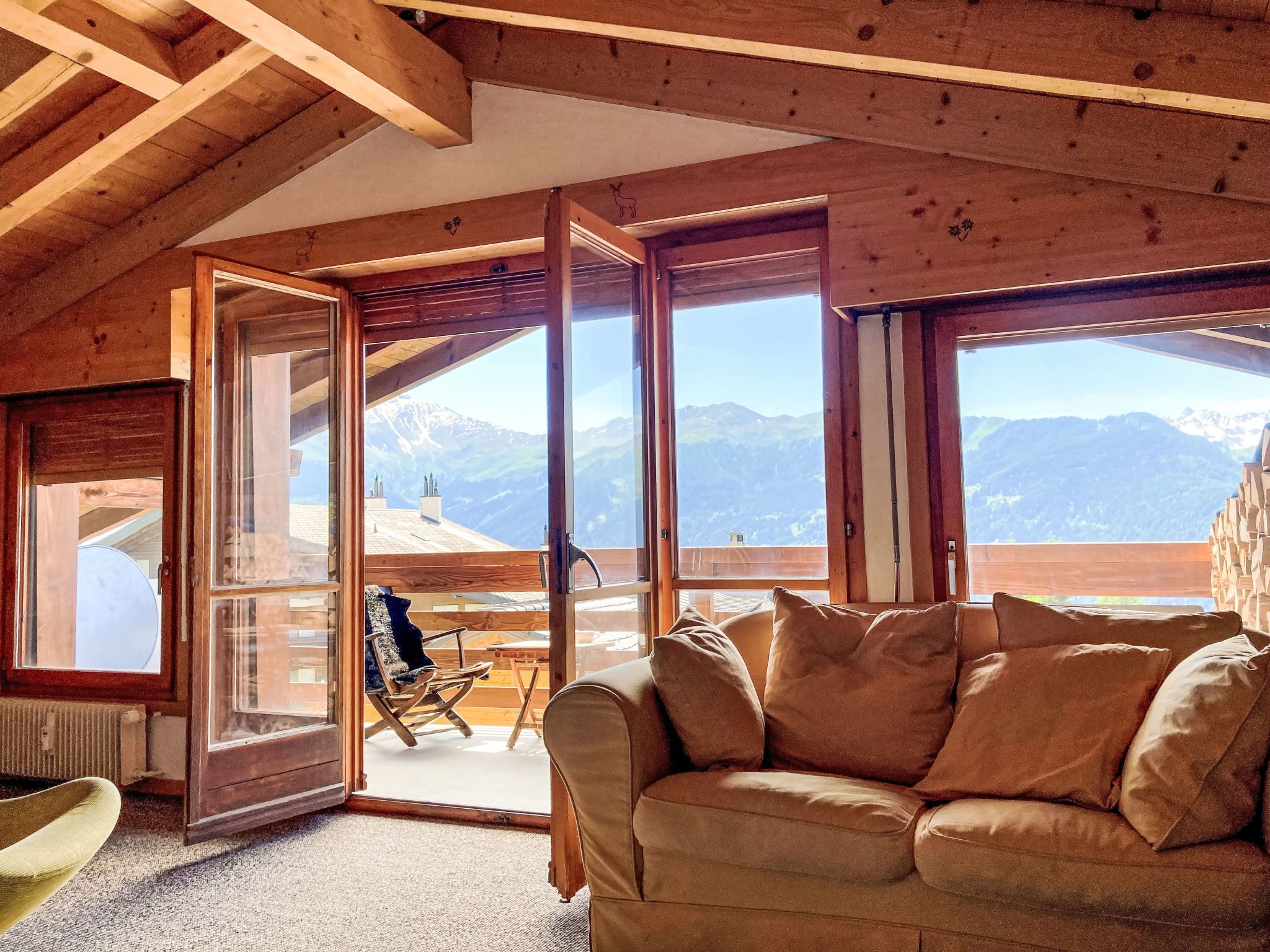 Olympia 443, 4-Zimmer-Attikawohnung 90 m2 im 4. Stock. Geräumig, renoviert, schön und geschmackvoll eingerichtet: grosses Wohn-/Esszimmer mit offenem Kamin und Kabel-TV. 1 Zimmer mit 1 Doppelbett (180 cm, Länge 200 cm). 1 abgeschrägtes Zimmer mit 2 Betten (90 cm, Länge 200 cm). 1 abgeschrägtes Zimmer mit 2 Betten (90 cm, Länge 200 cm). Offene Küche (4 Kochplatten, Backofen, Geschirrspüler, 4 Glaskeramikplatten, elektrische Kaffeemaschine, Kapseln für die Kaffeemaschine (Nespresso) extra, Racletteofen, Fondue Set (Käse)). Bad/WC, Dusche/WC. Balkonmöbel. Sehr schöne Sicht auf die Berge. Zur Verfügung: Internet (Wireless LAN). Parkplatz Nr. 443 (1 Auto). Bitte beachten: Nichtraucher-Unterkunft. Rauchmelder.