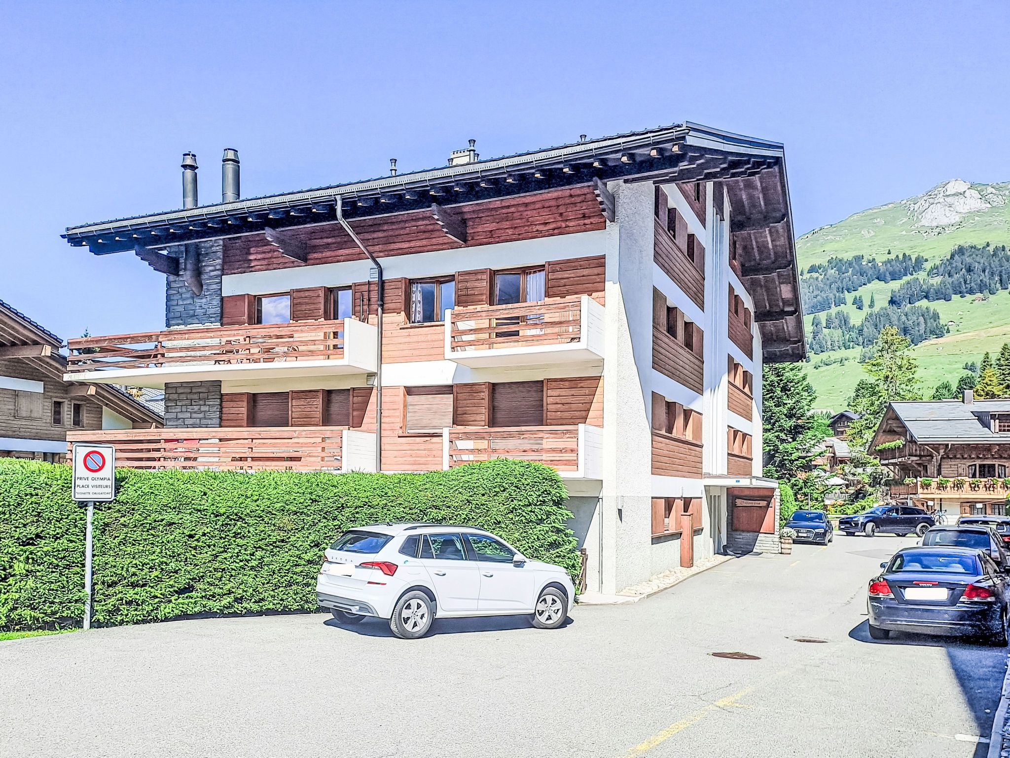 Appartementhaus Olympia, auf 4 Stockwerken. Im Ort, 300 m vom Zentrum von la station, ruhige Lage. Im Hause: Fahrstuhl, Skiraum, Zentralheizung. Öffentliche Parkplätze 800 m. Einkaufsgeschäft, Restaurant 300 m, Bushaltestelle Ermitage 100 m, Hallenbad 800 m. Tennis 1 km, Reitstall 1 km, Sportzentrum 1 km, Gondelbahn 800 m, Skischule, Schlittelbahn 200 m.