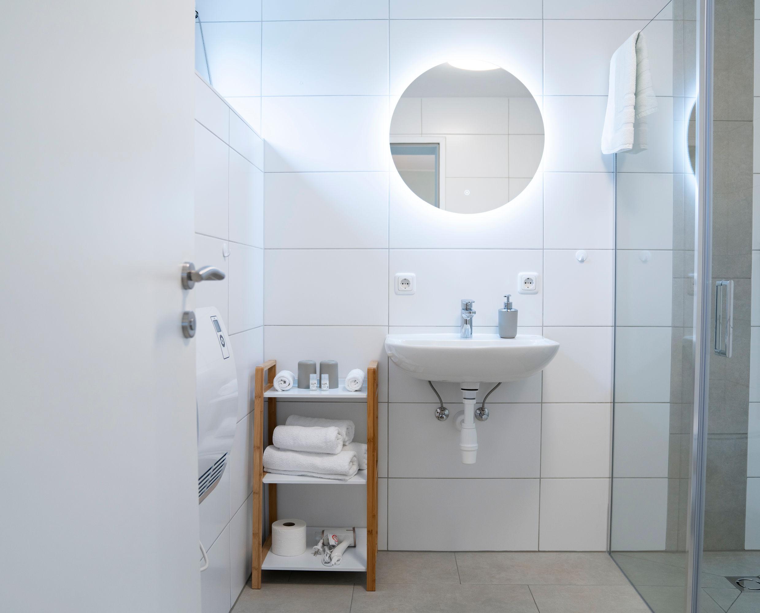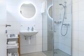 • Badezimmer mit Dusche, Toilette, Waschbecken, Spiegel, Fön