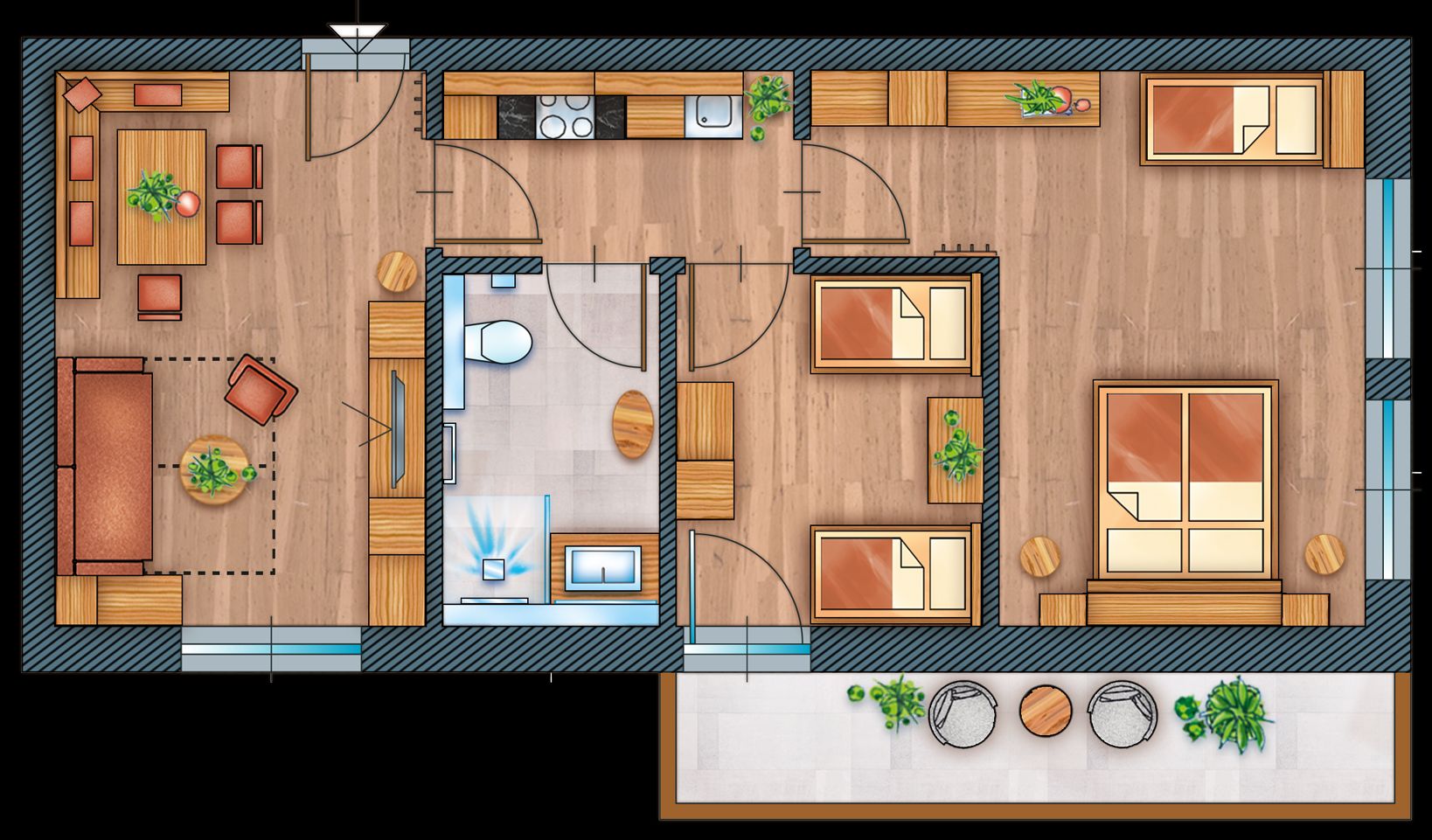Eine 4-Zimmer-Wohnung für alle Bedürfnisse – unser Appartement „Rubin“ überzeugt mit einer großzügigen Raumaufteilung.