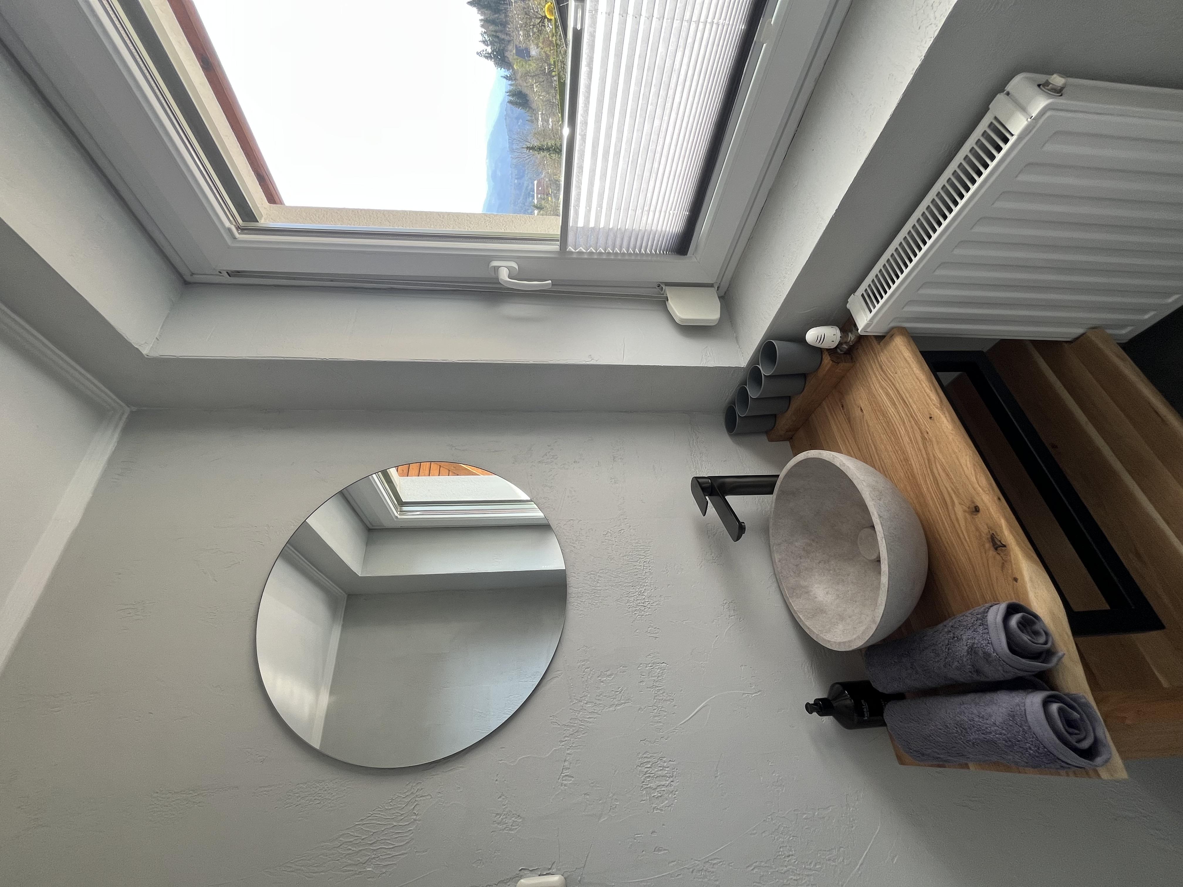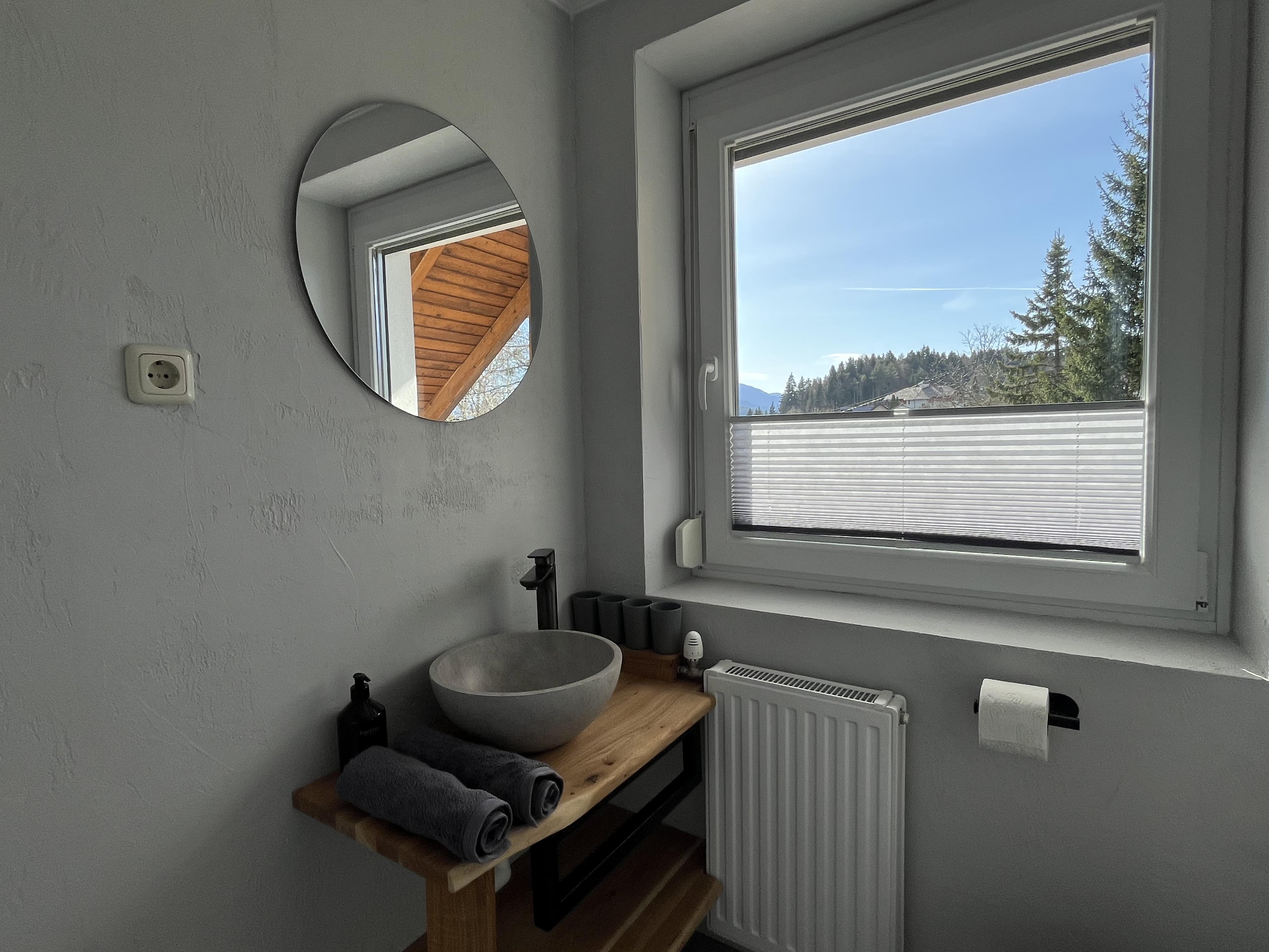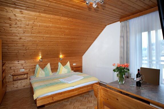 Unsere moderne Ferienwohnung verfügt über einen Holzboden und einen großen Wohn & Schlafraum. In diesem befinden sich zum Einen das große Fichtenholzbett für 2 Erwachsene und zum Anderen eine durch einen Vorhang abgetrennte Nische indem sich ein Stockbett für 2 Kinder befindet. Daher ist diese Wohnung ideal für 2 Erwaschene und 1 - 2 Kinder. Zusätzlich befindet sich in der Wohnung eine kleine Kochgelegenheit inkl. Kühlschrank und ein Esstisch mit Stühlen für 4 Personen. Ebenso befindet sich eine Dusche sowie ein WC in der Wohnung. Die Wohnung verfügt auch über einen Balkon mit Blick auf die Karawanken und die Burgruine Finkenstein. WLAN und Fernseher.