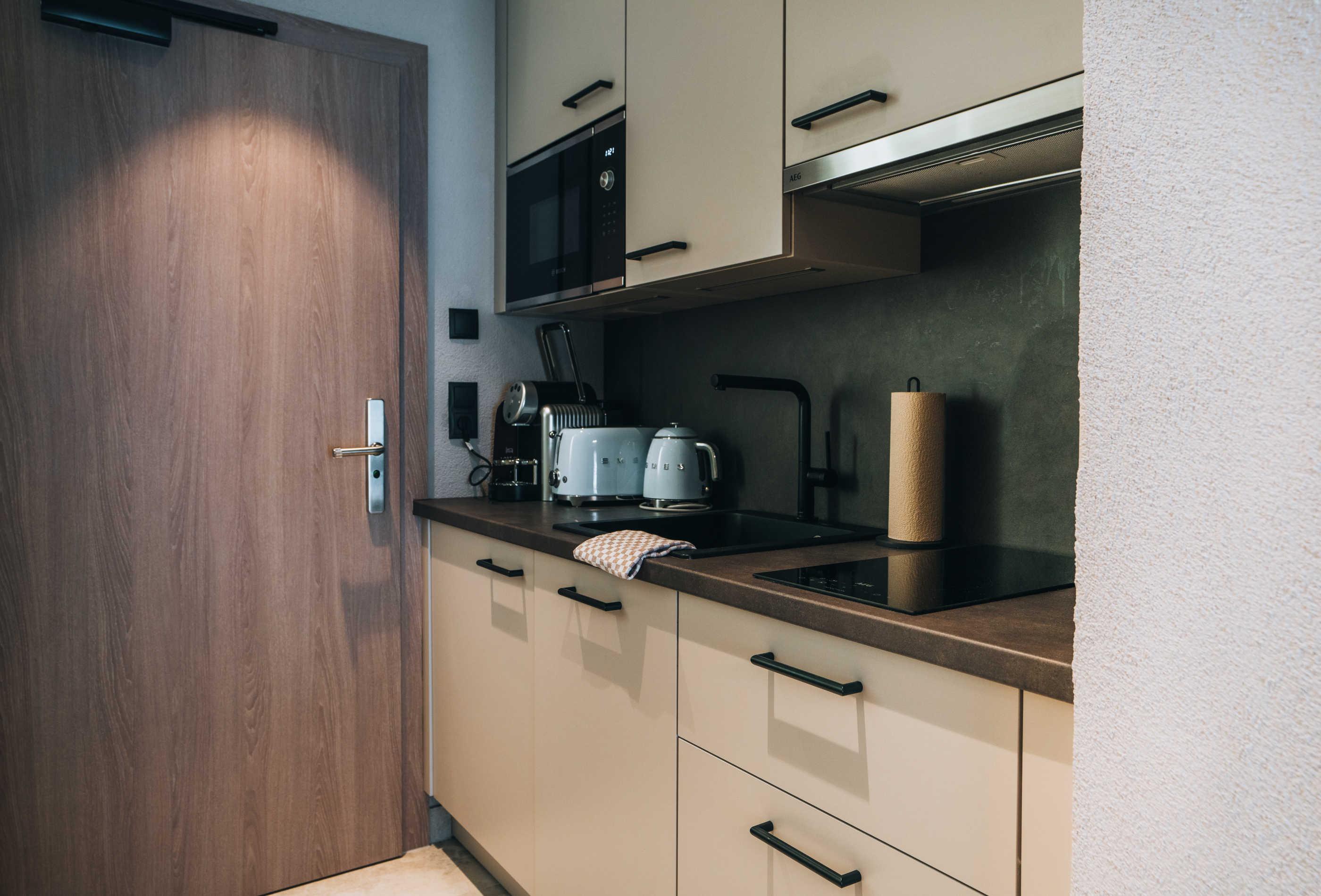 Modernes Studio XS mit ca. 25 m² Wohnfläche: 1 Doppelzimmer mit Essplatz; 1 Badezimmer mit Dusche/WC; 1 vollausgestatteter Kochnische (Nespresso Business Kaffeemaschine & Kaffeevollautomat, Cerankochfeld, Küchlschrank, Mikrowelle, Geschirrspüler uvm.); Südbalkon