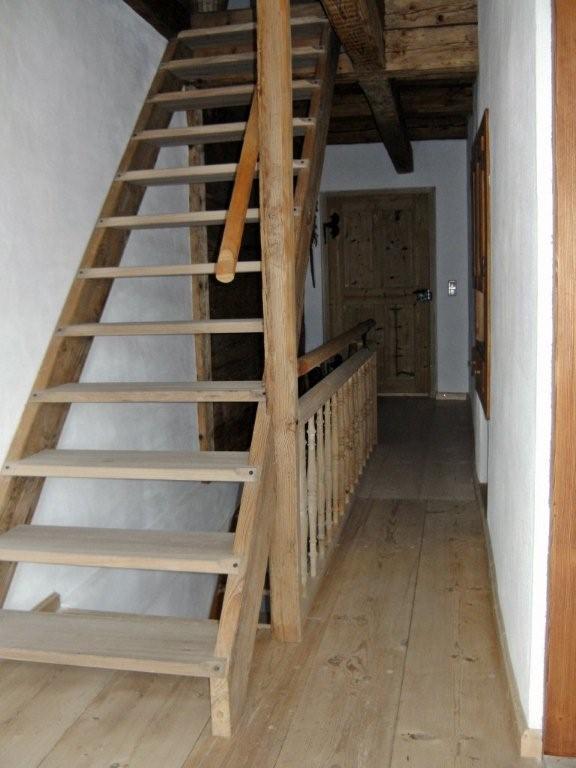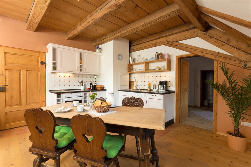 Schön geschnittene Wohnung mit sehr große Wohnküche. Stillvolle Einrichtung mit Massivholzmöbel. Holzfußboden, Lehmverputze Wände, hohe Räume mit originaler Balkendecke.