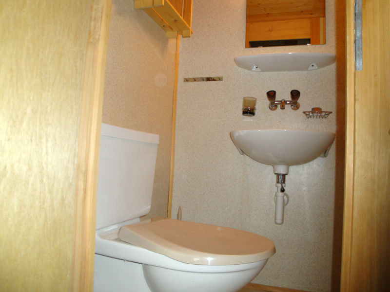Badezimmer mit Dusche und Lavabo. Ein weiteres Badezimmer mit WC.