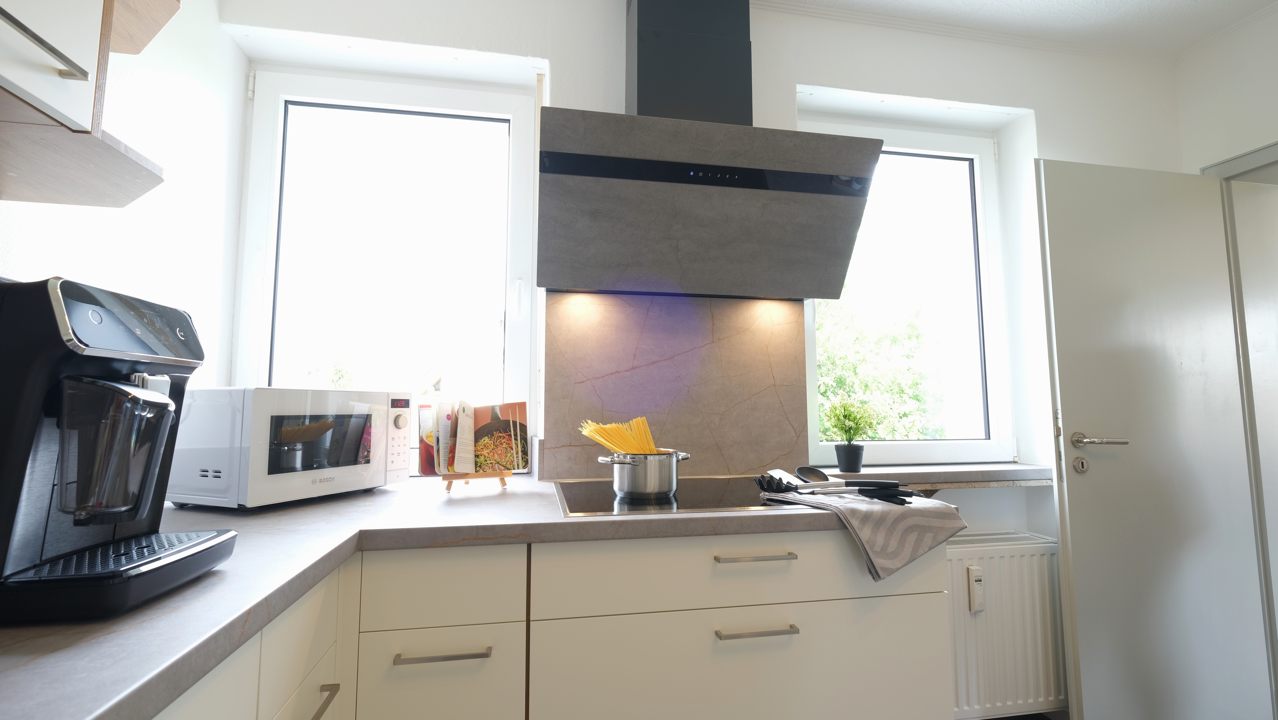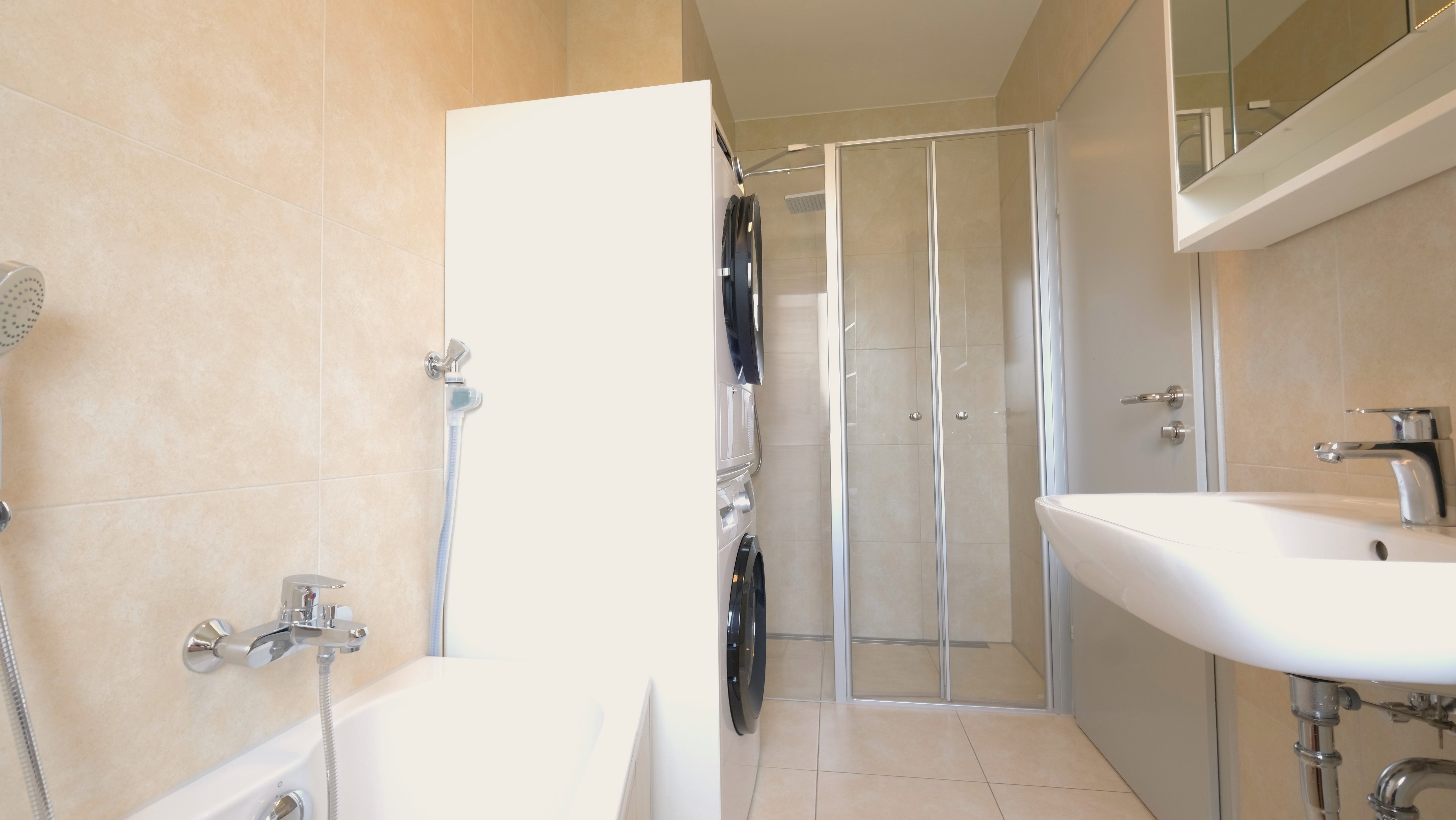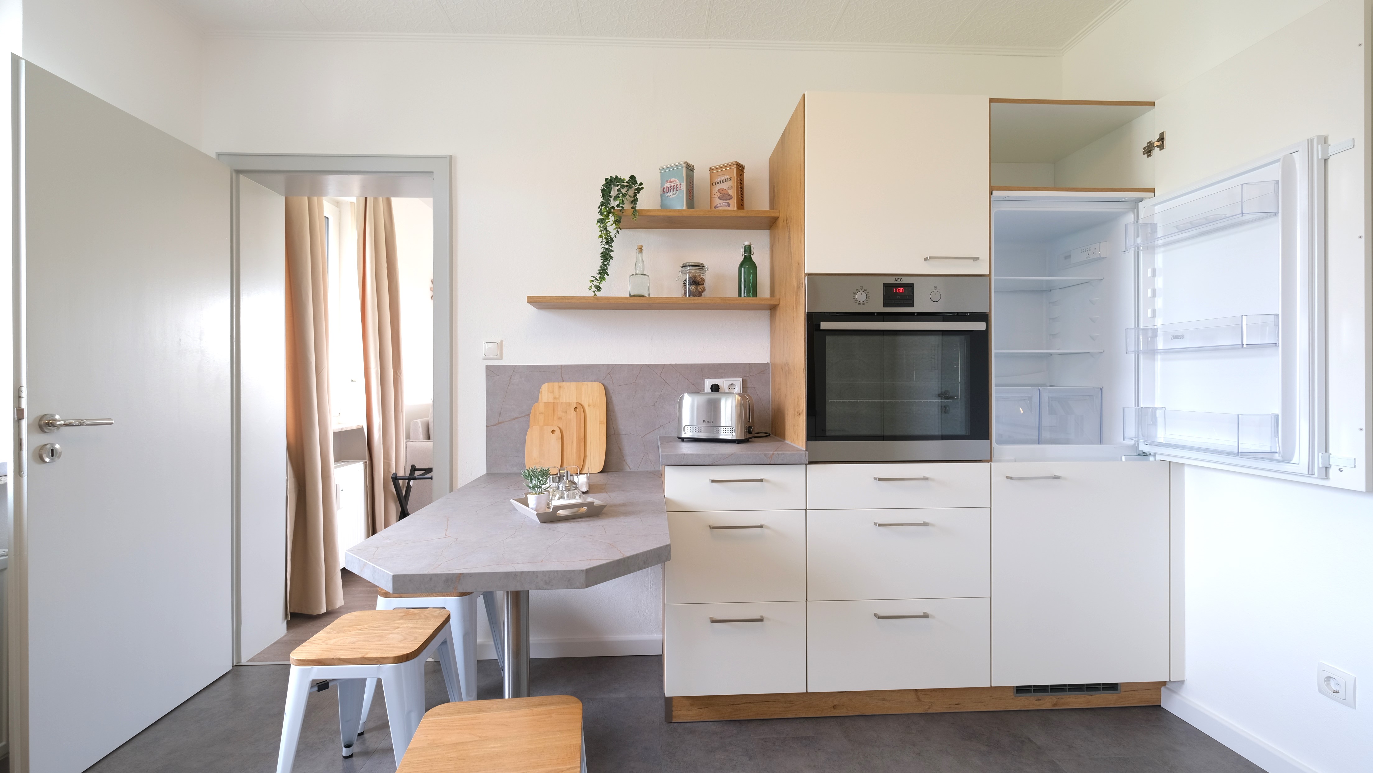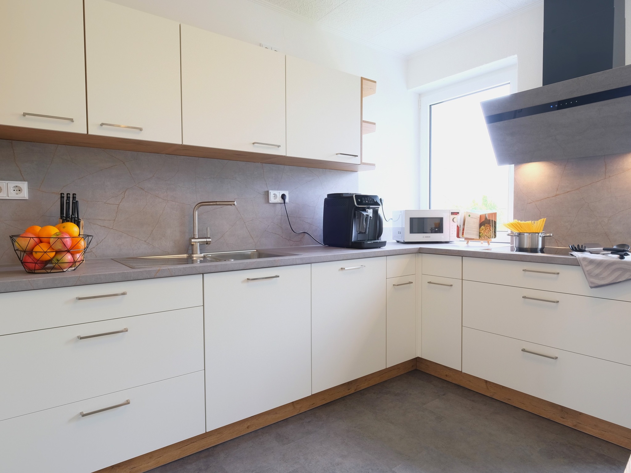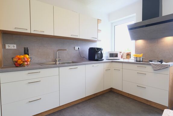 Die sehr große Küche hat einen Kühlschrank mit Gefrierfach, einen Backofen, Mikrowelle, einen Geschirrspüler und ein Kochfeld sowie Kaffee Vollautomat incl. Milchschäumer, Wasserkocher und Toaster sowie einen Tisch mit Sitzgelegenheit. Im Bad befindet sich eine ebenerdige Dusche, ein Haartrockner, eine Waschmaschine und ein Wäschetrockner. Handtücher und Bettwäsche werden im Apartment gestellt.