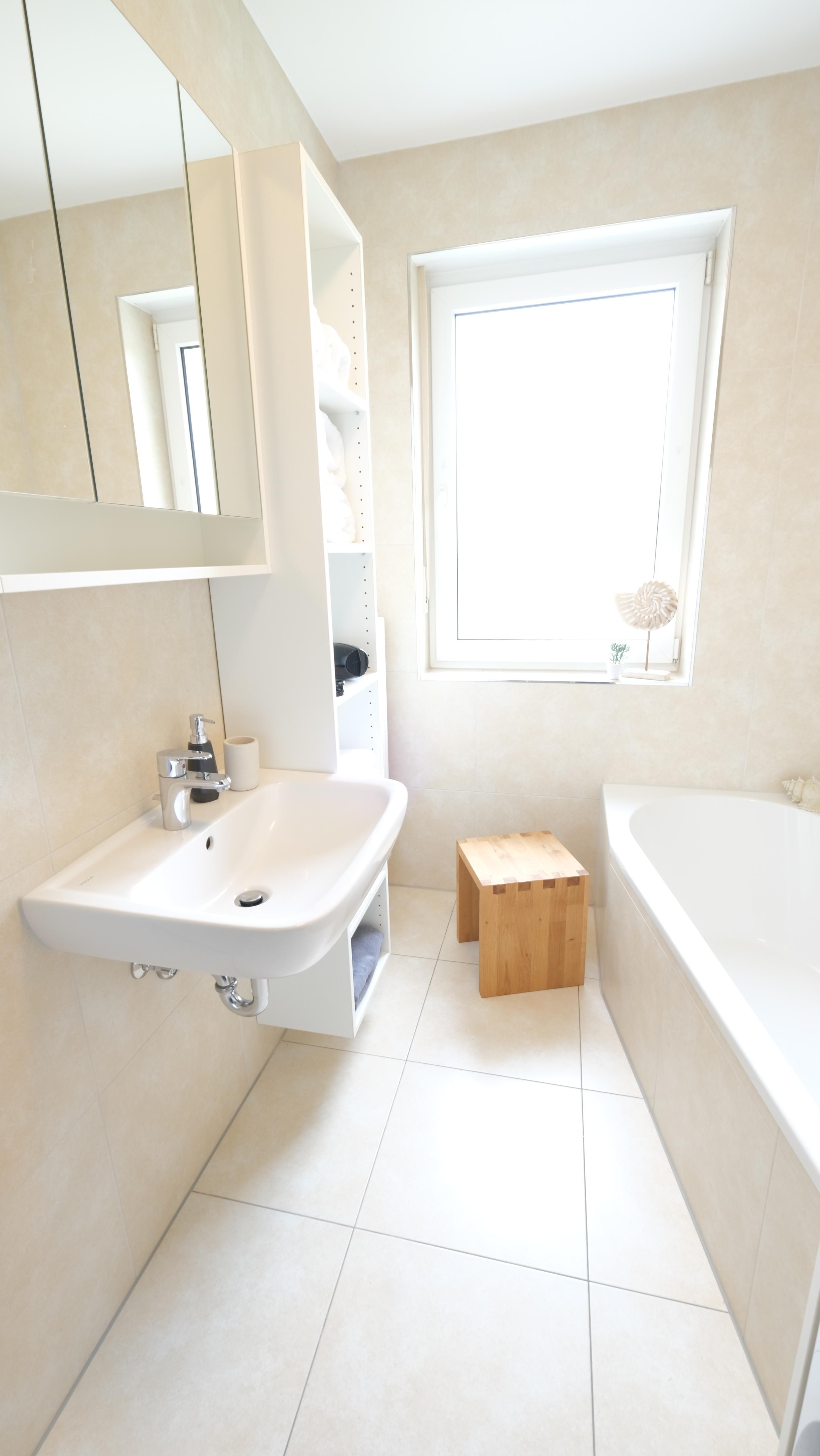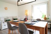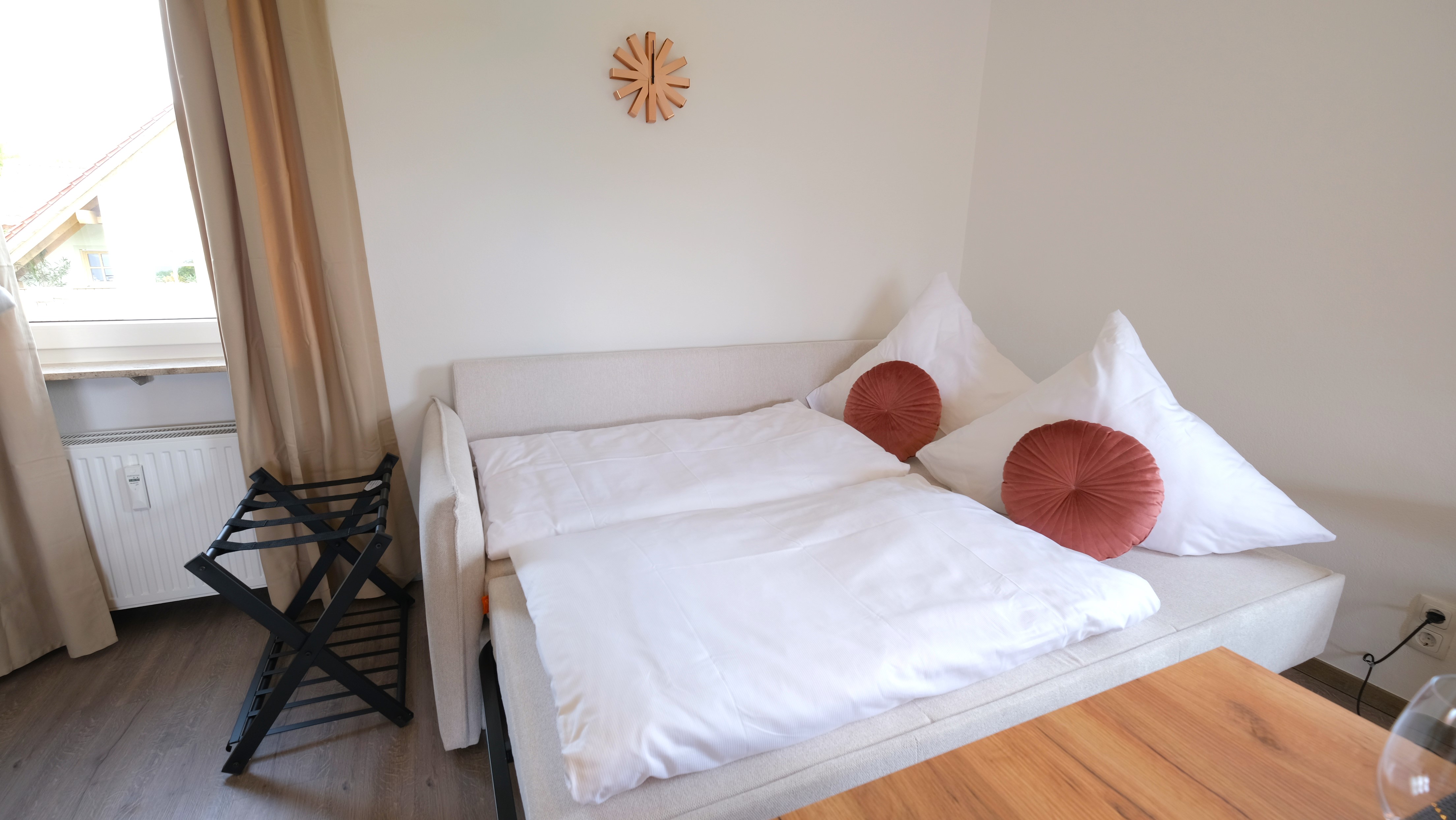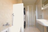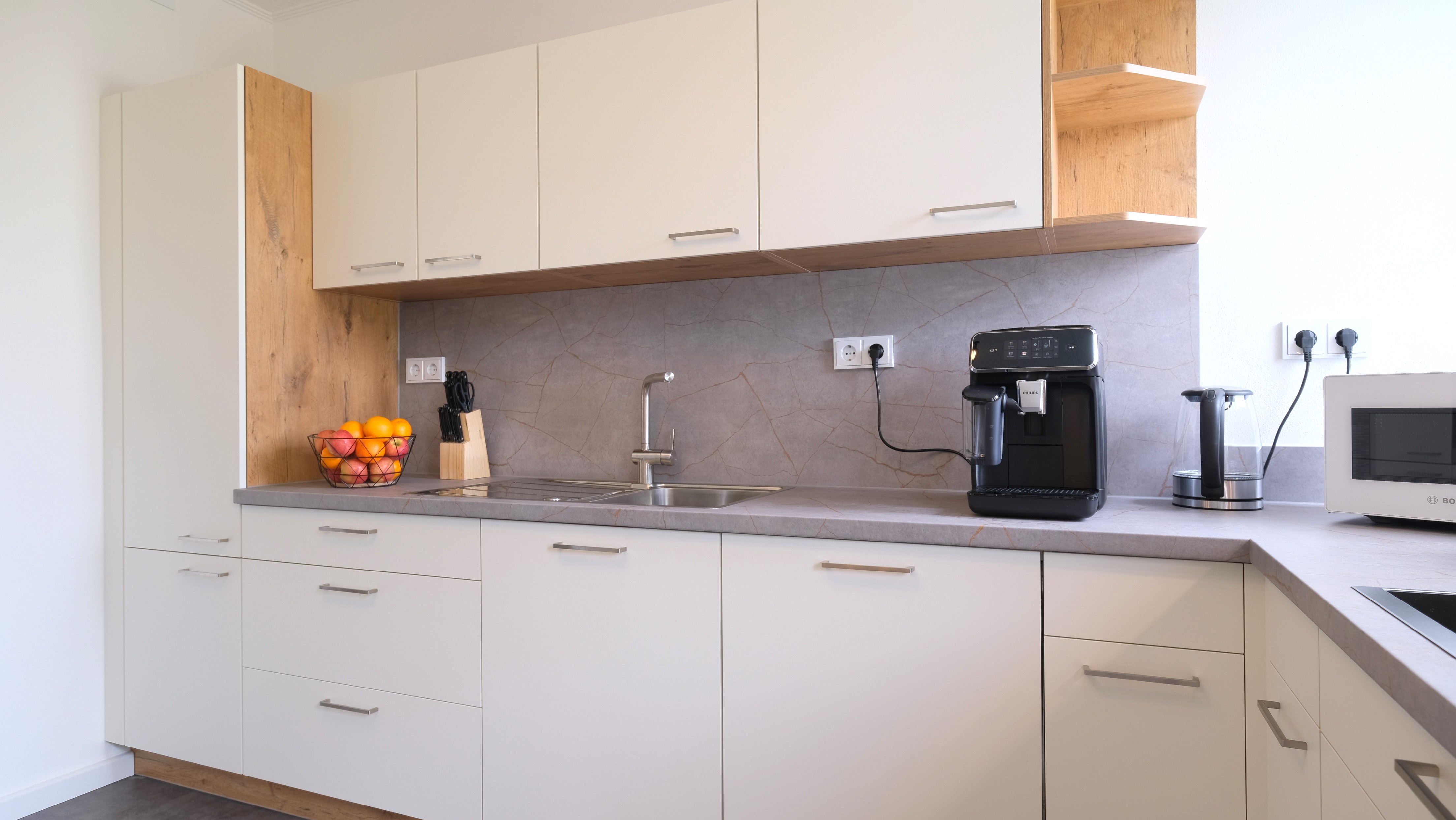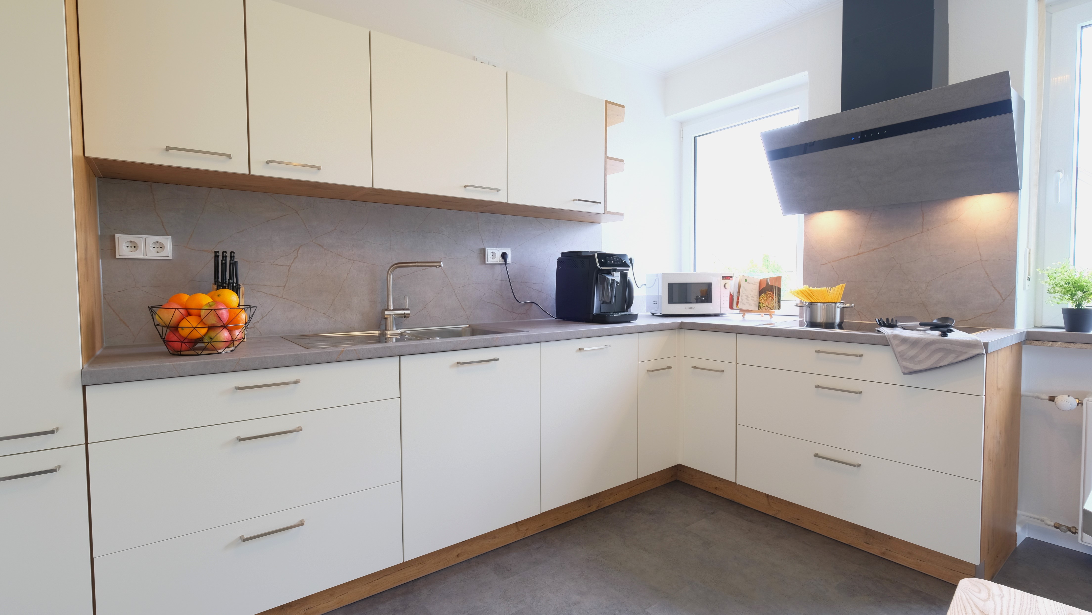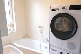 Die sehr große Küche hat einen Kühlschrank mit Gefrierfach, einen Backofen, Mikrowelle, einen Geschirrspüler und ein Kochfeld sowie Kaffee Vollautomat incl. Milchschäumer, Wasserkocher und Toaster sowie einen Tisch mit Sitzgelegenheit. Im Bad befindet sich eine ebenerdige Dusche, ein Haartrockner, eine Waschmaschine und ein Wäschetrockner. Handtücher und Bettwäsche werden im Apartment gestellt.