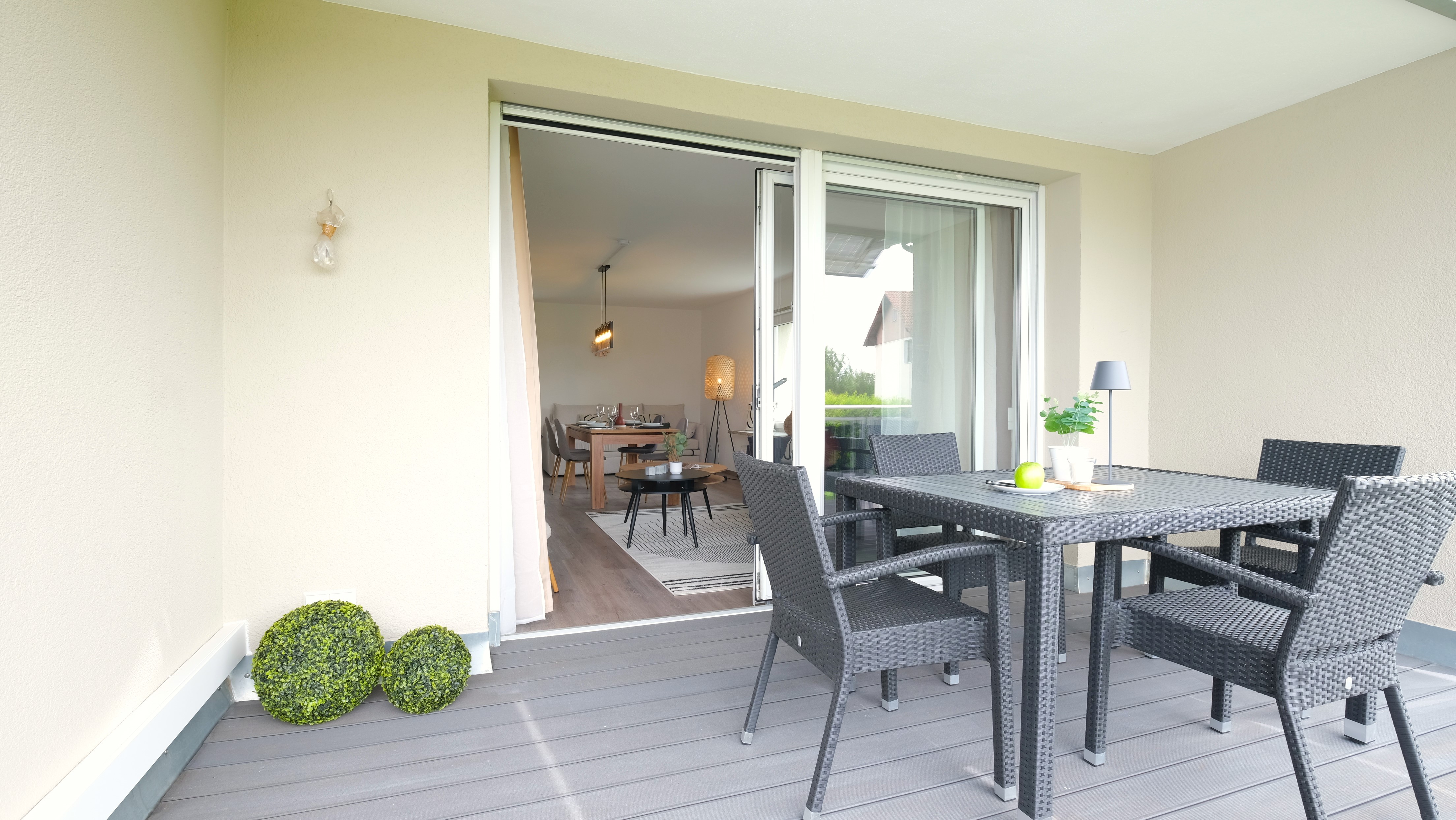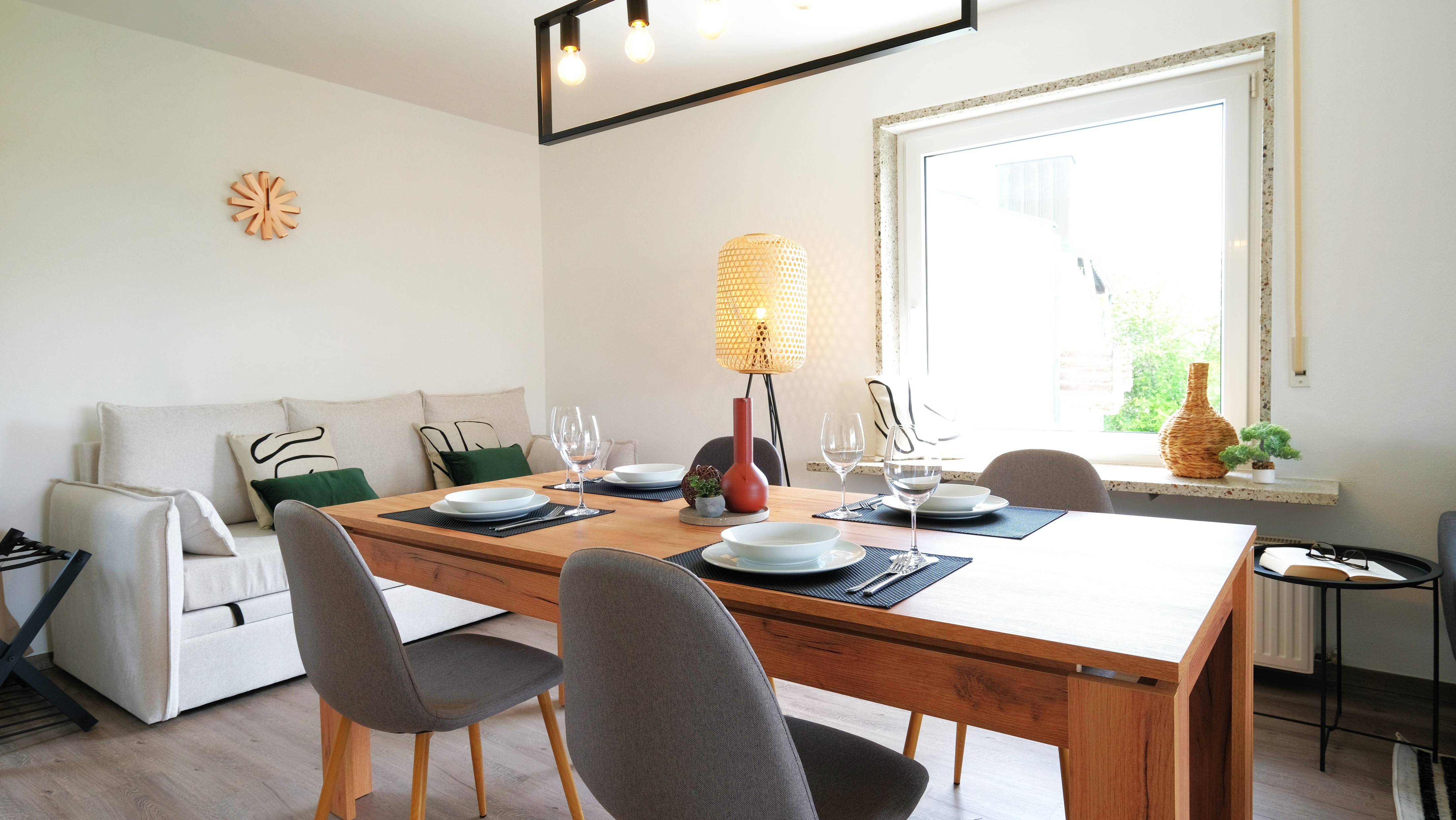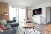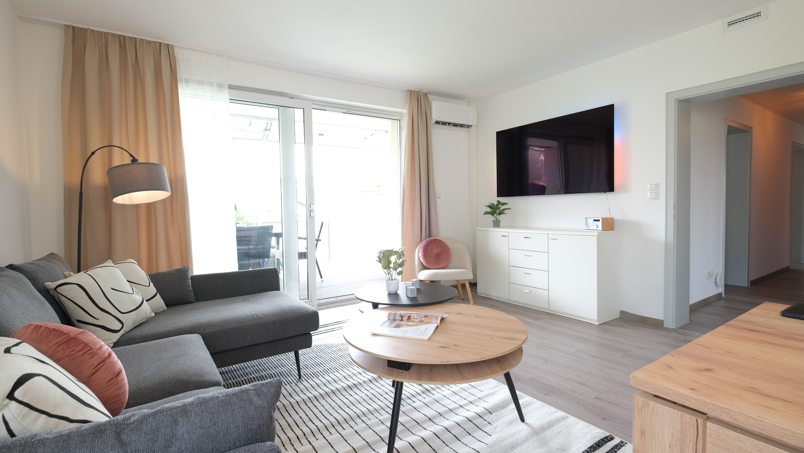 Das Wohnzimmer ist mit einem Schlafsofa, 2 Schlafgelegenheiten sowie Klimaanlage, einem 65“ OLED TV, einem großen Esstisch ausgestattet.