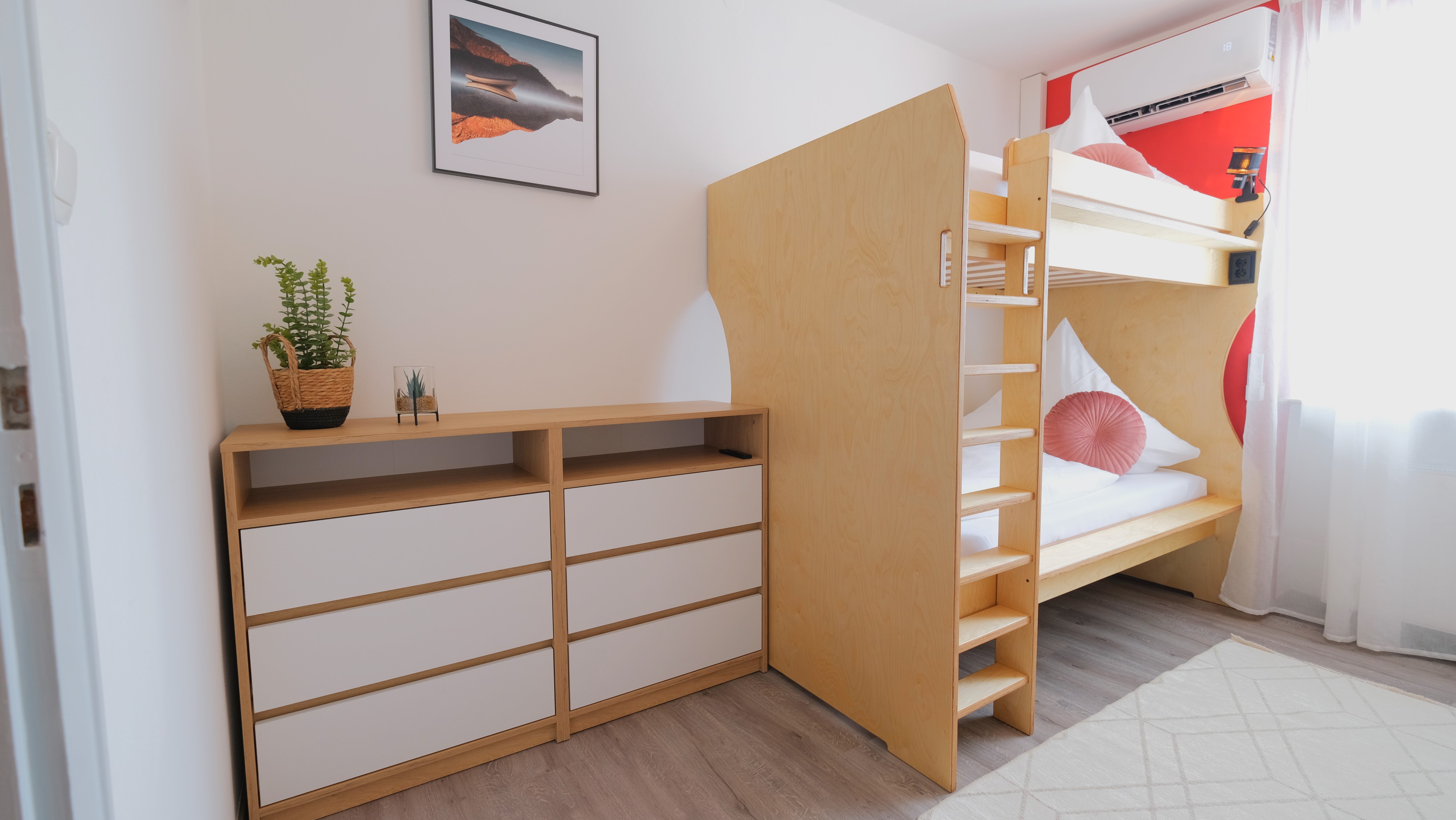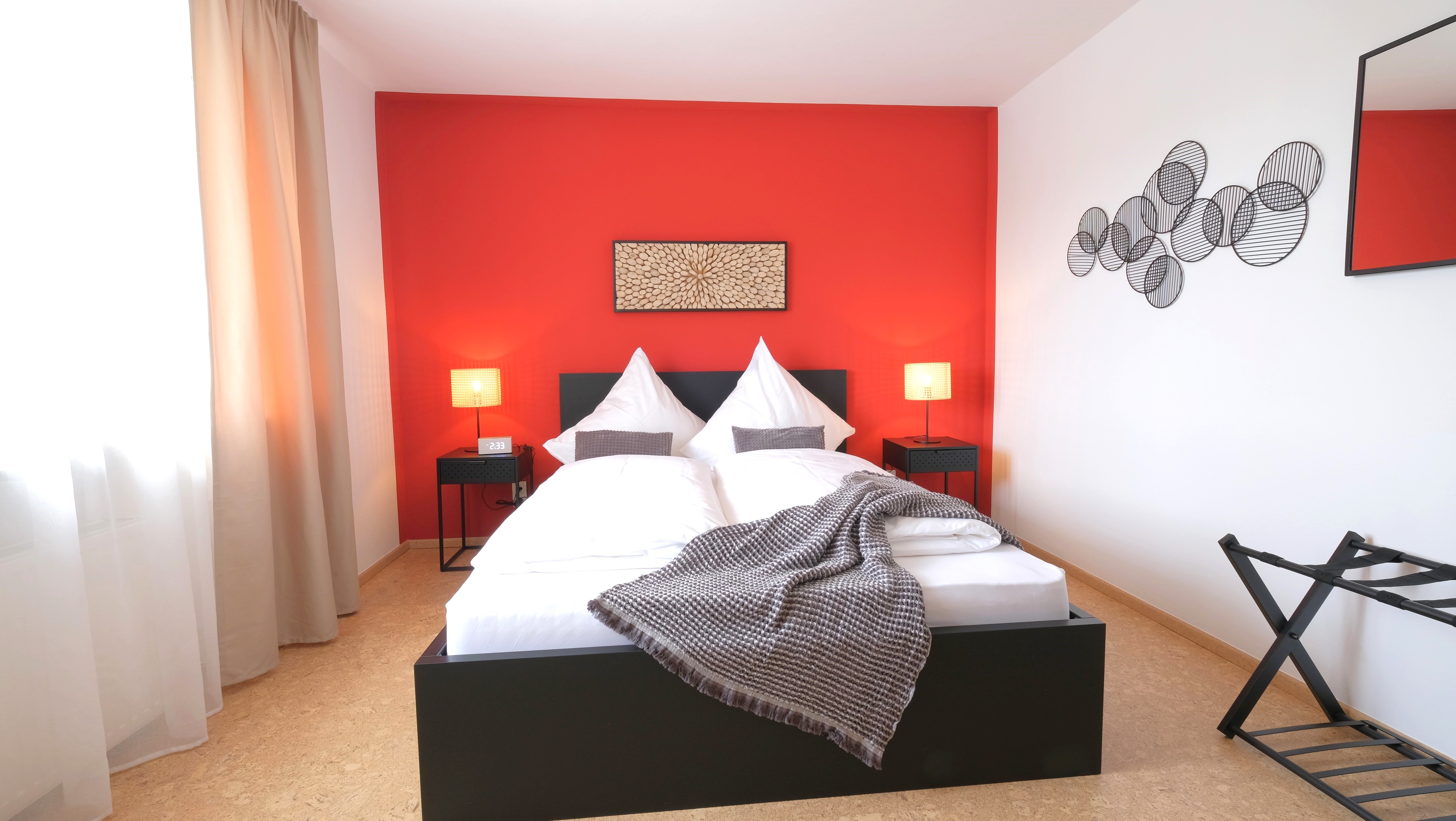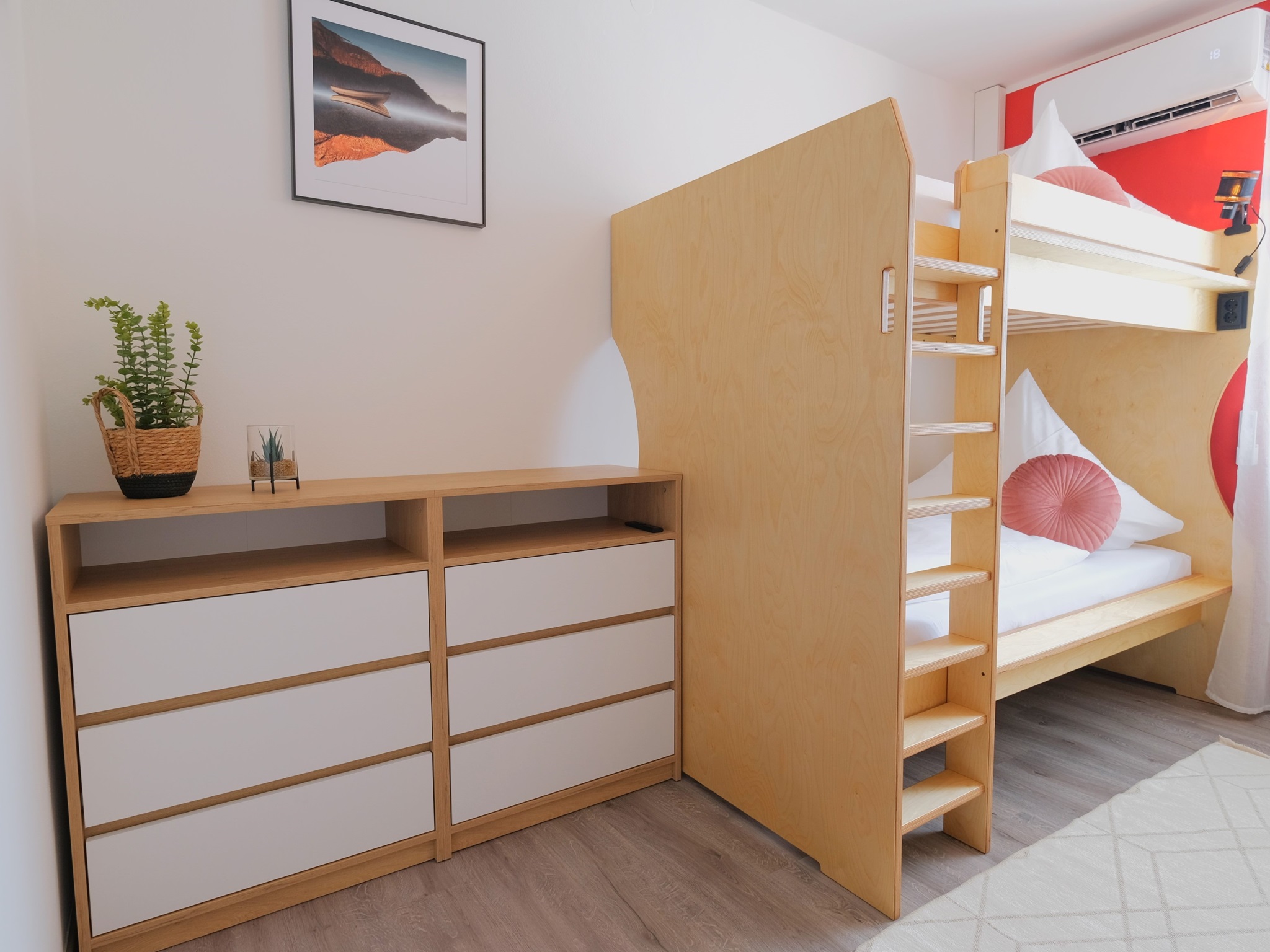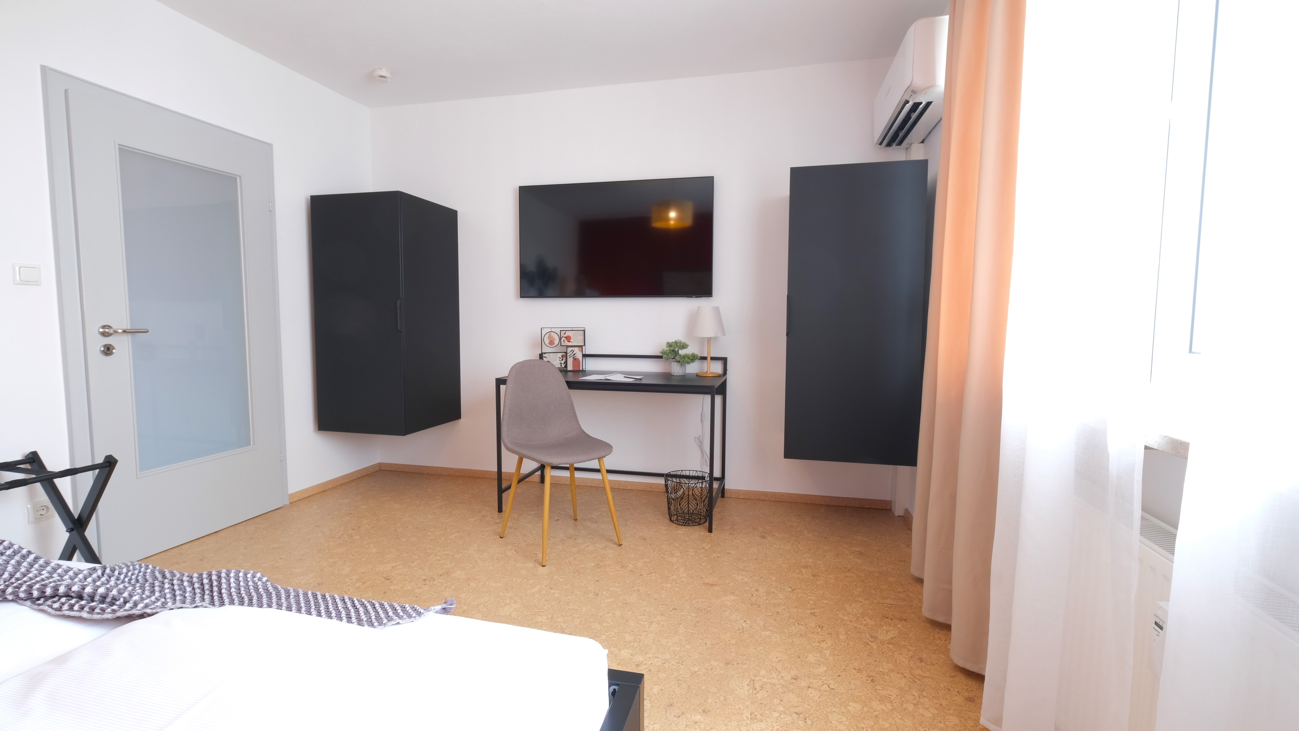 Die sehr helle Ferienwohnung, App. mit 2 Schlafzimmer, ca. 105qm, in der Villa Bachfischer mit Blick ins Grüne bietet kostenfreies WLAN und einen Balkon mit Tisch und Stühlen sowie einer Treppe in den Garten. Ein kostenfreier Privatparkplatz ist vorhanden und Sie können an der hauseigenen E-Tankstelle mit 11KW, 22KW oder 50KW DC Ladeleistung günstig Ihr E-Auto laden. Das Apartment verfügt über 2 Schlafzimmer, das erste große Schlafzimmer (Doppelbett) hat einen Schreibtisch mit Lampe, einen Radiowecker und einen Flachbild-TV und Klimaanlage. Das weitere Schlafzimmer mit 2 Hochbetten, 4 Schlafgelegenheiten hat ebenfalls einen Flachbild-TV und eine Klimaanlage.
