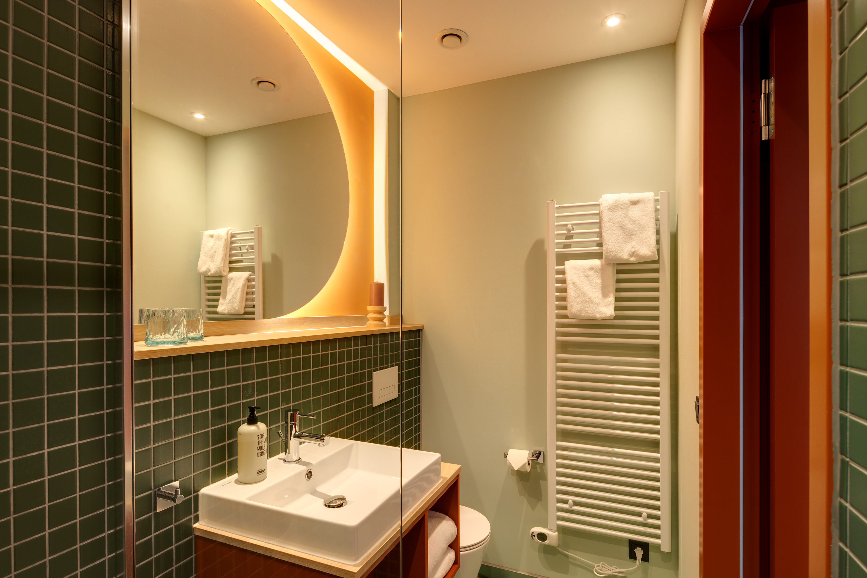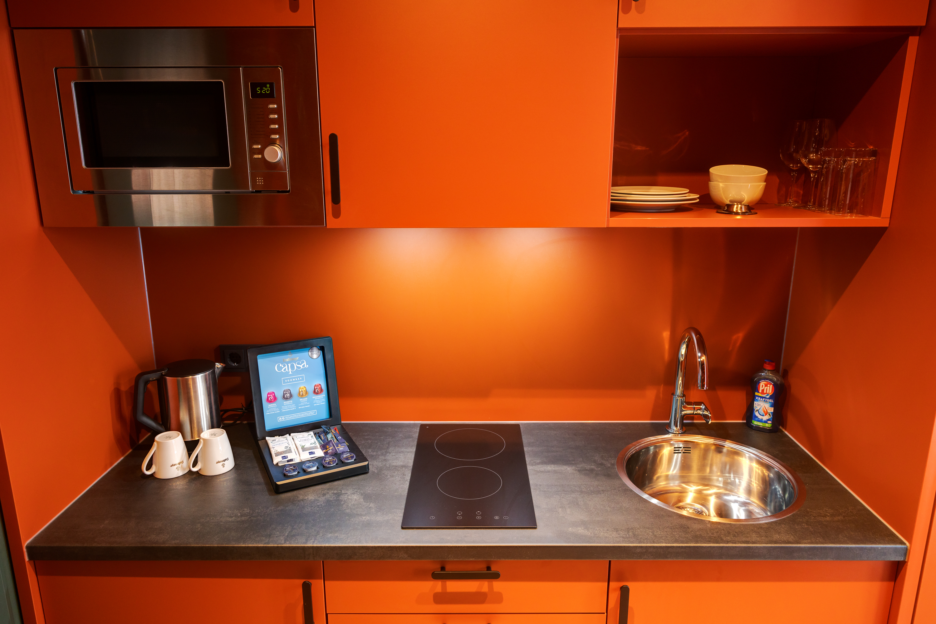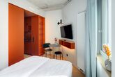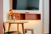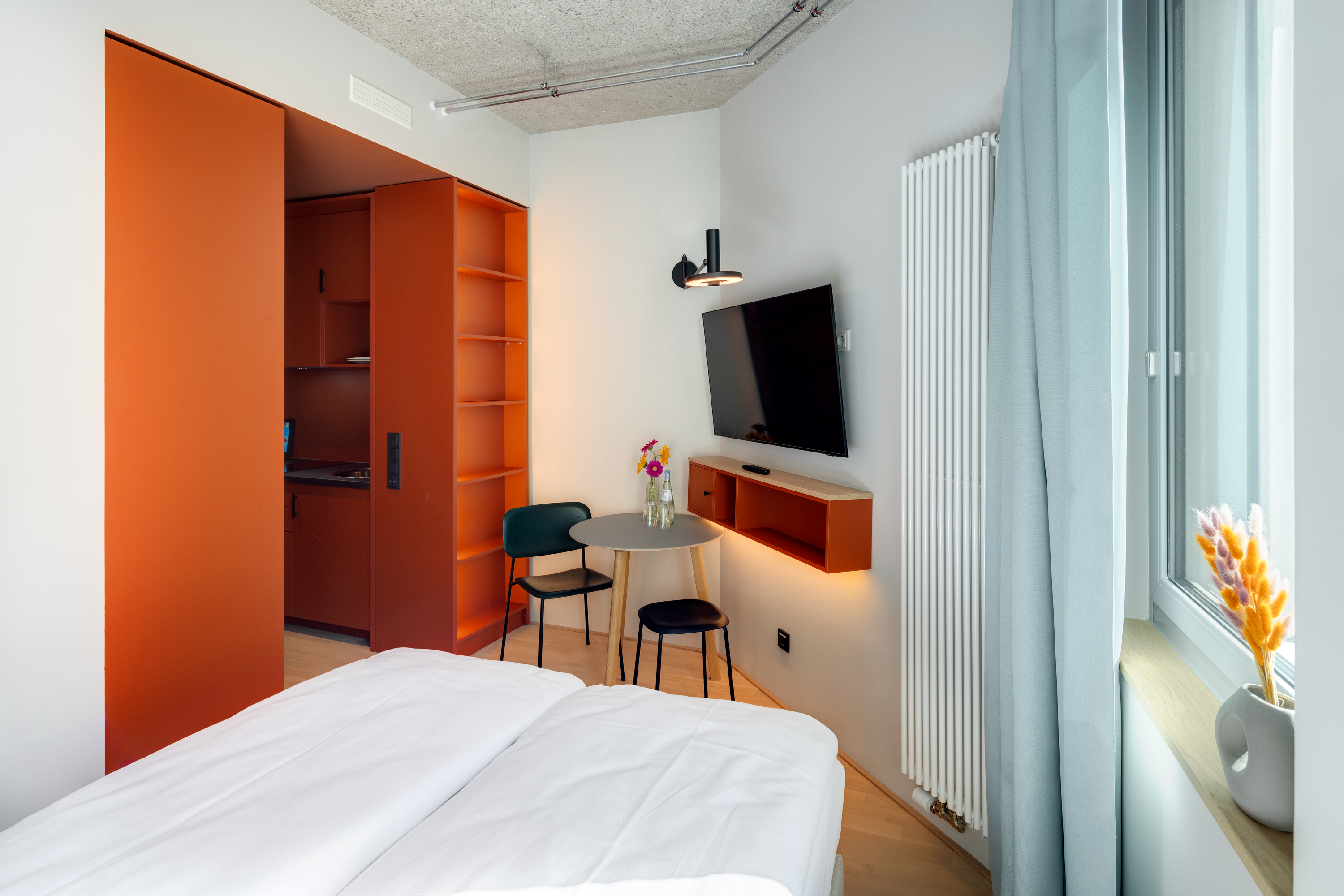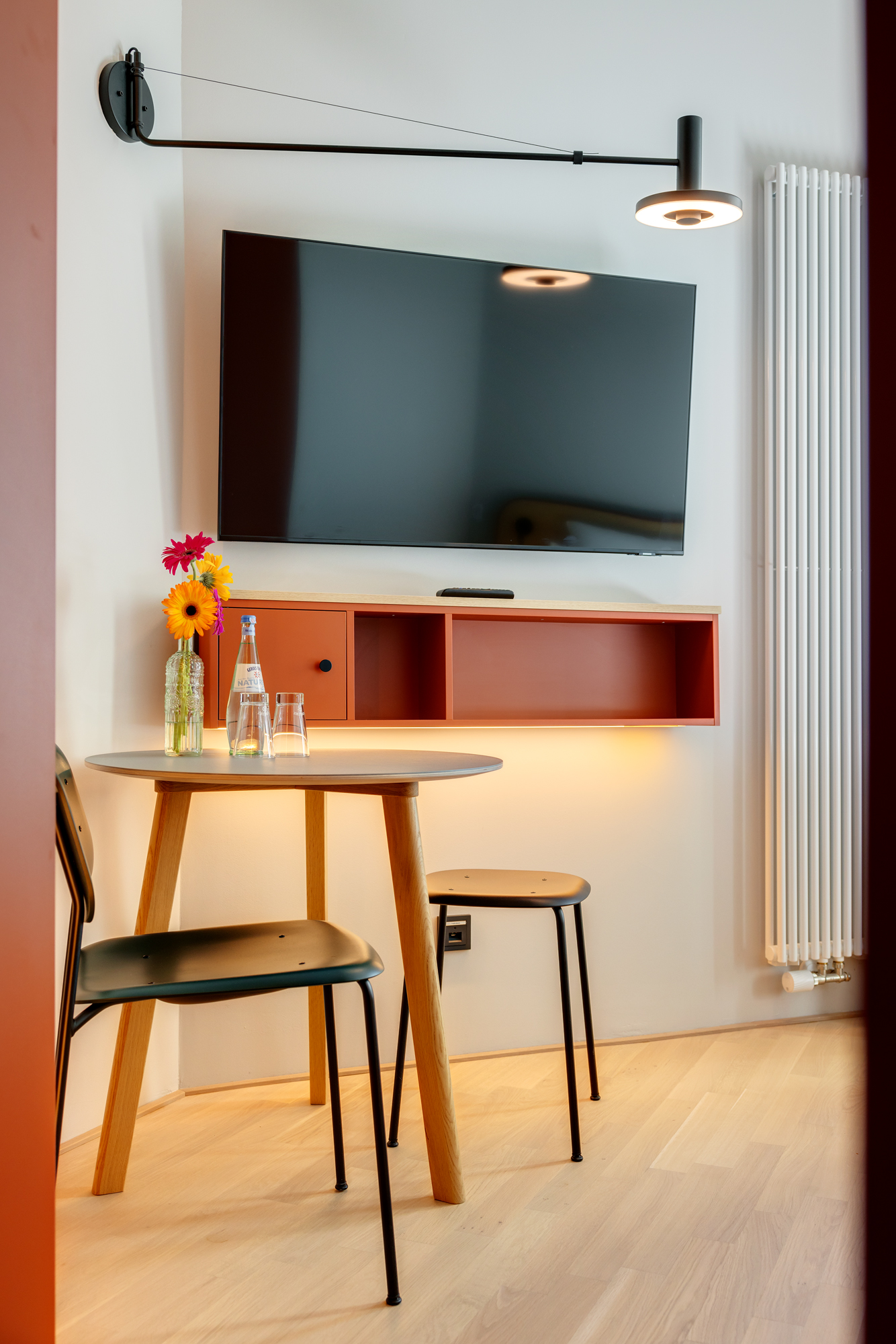Das Studio Standard bietet Ihnen ein geräumiges Zimmer, das sowohl als Wohn- als auch als Schlafbereich dient. Die geschmackvolle Einrichtung und das zeitgemäße Design schaffen eine angenehme Atmosphäre. Die Küchenzeile ist mit modernen Geräten wie Herd, Kühlschrank, eine Mikrowelle und Spülmaschine ausgestattet und bietet Ihnen die Möglichkeit, Ihre Lieblingsgerichte zuzubereiten. Im Badezimmer gibt es eine stilvolle begehbare Dusche, einen großen Handtuchheizkörper sowie einen großen Spiegel mit umlaufender LED-Beleuchtung über dem Waschbecken, der dem Raum Helligkeit und Weite verleiht. Das komfortable Queen-Size-Bett oder Doppelbett lädt zum Entspannen und Erholen ein.