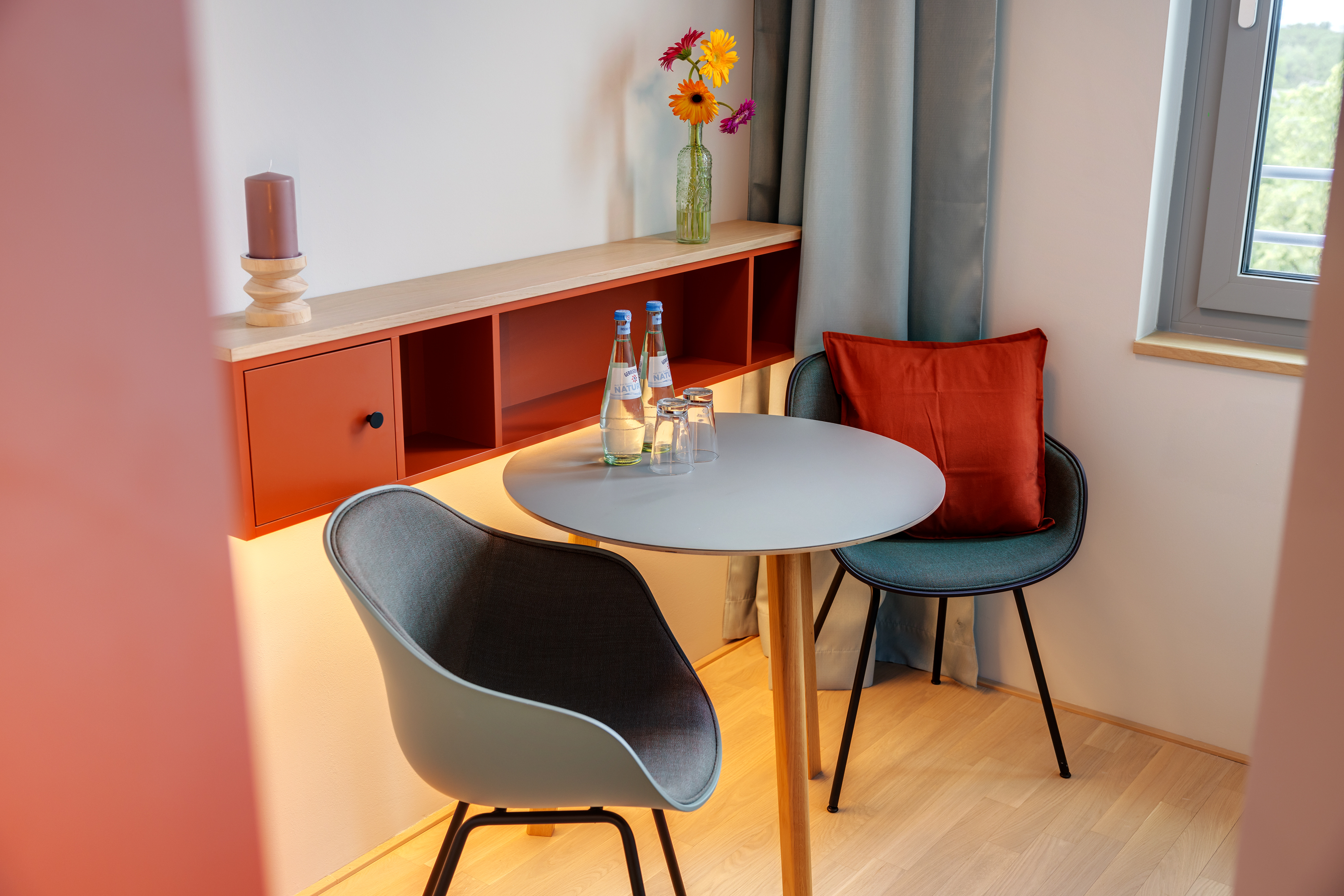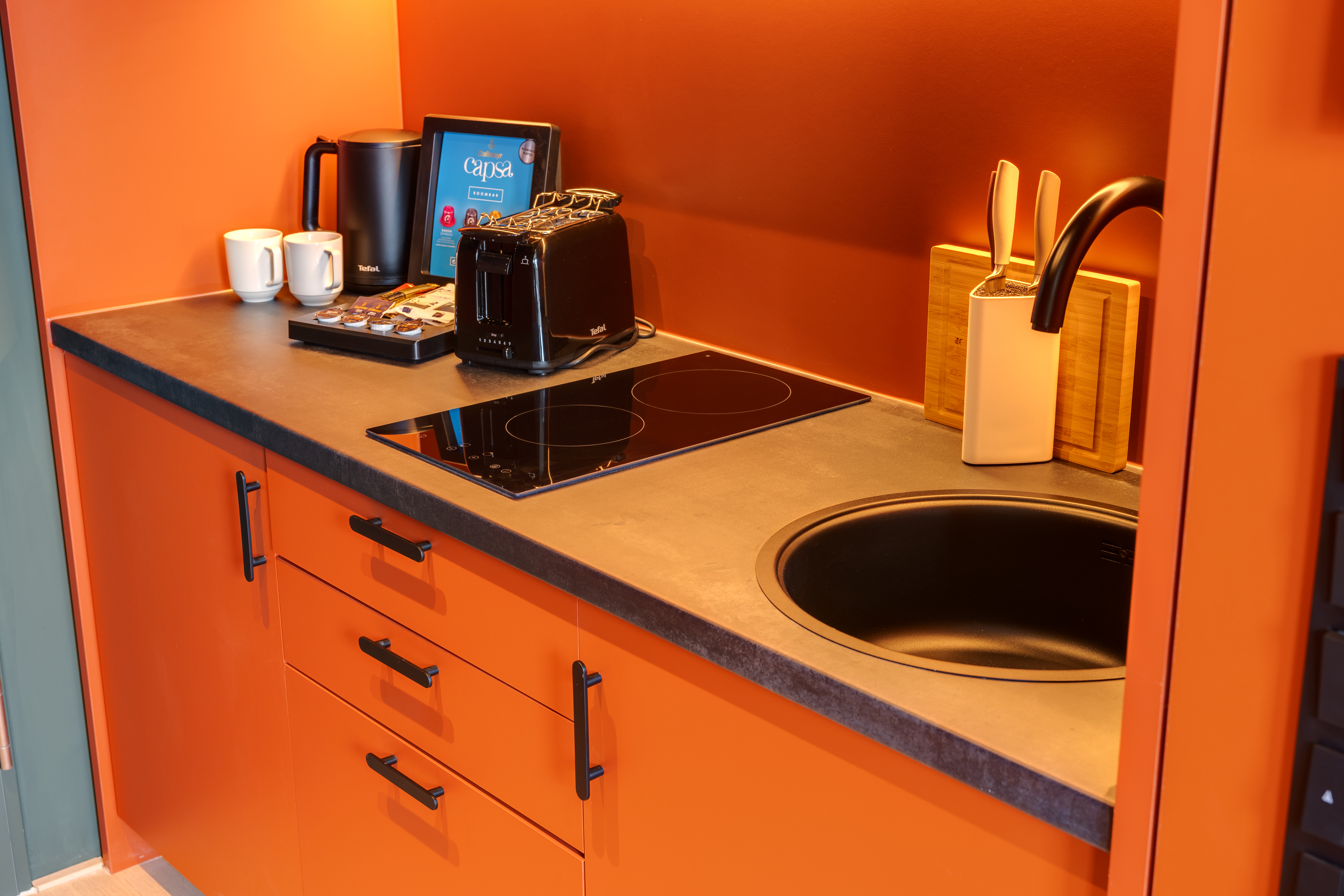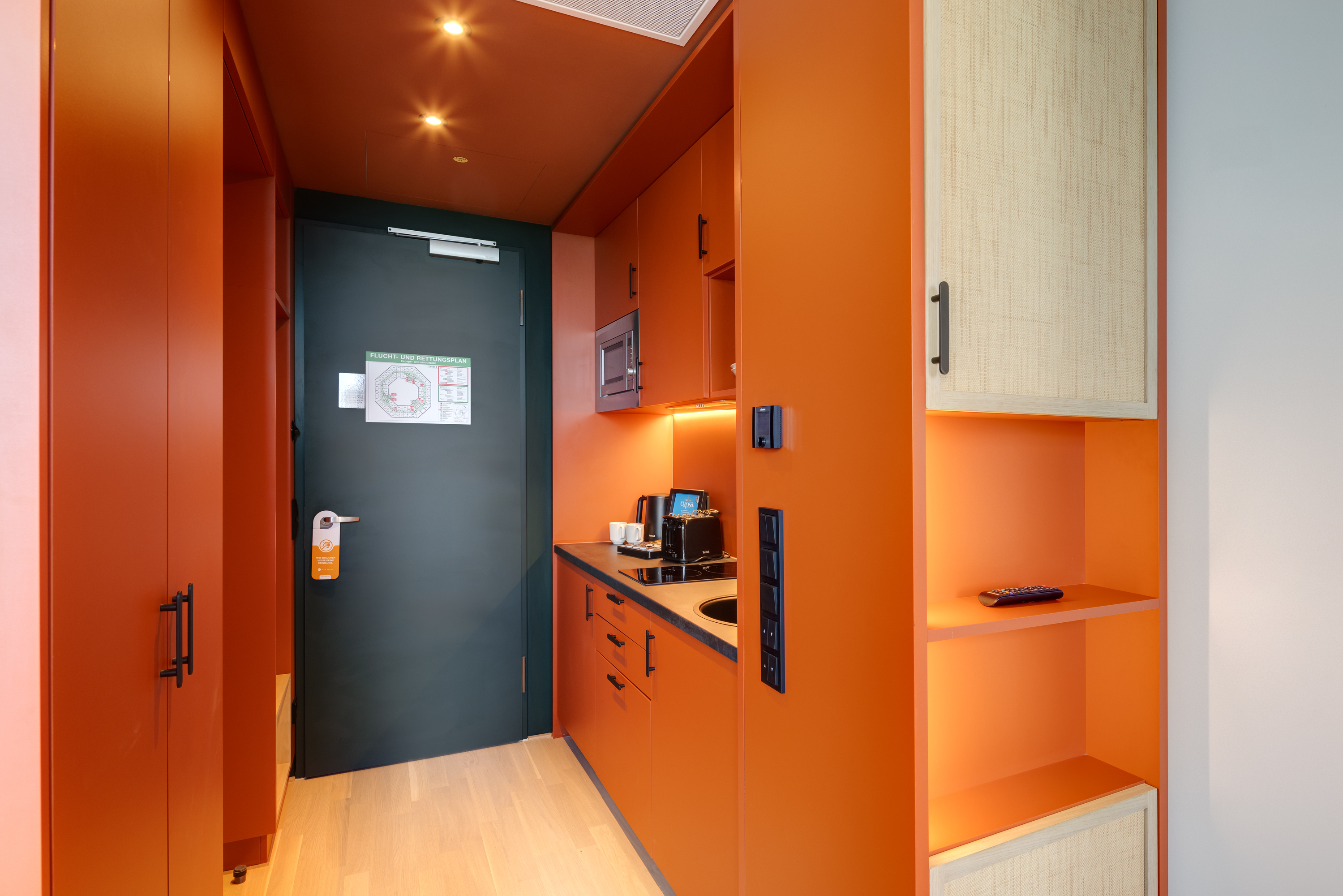 Das Studio Deluxe Premium bietet ihnen ein geräumiges Zimmer sowie einen separaten Arbeitsbereich, der Platz zum Arbeiten und Essen bietet. Die geschmackvolle Einrichtung und das zeitgemäße Design schaffen eine angenehme Atmosphäre. Die Küchenzeile ist mit modernen Geräten wie Herd, Kühlschrank, eine Mikrowelle und Spülmaschine ausgestattet und bietet Ihnen die Möglichkeit, Ihre Lieblingsgerichte zuzubereiten. Im Badezimmer gibt es eine stilvolle begehbare Dusche, einen großen Handtuchheizkörper sowie einen großen Spiegel mit umlaufender LED-Beleuchtung über dem Waschbecken, der dem Raum Helligkeit und Weite verleiht. Ein komfortables Queen Size Bett bietet ausreichend Platz und Entspannung für zwei Personen.