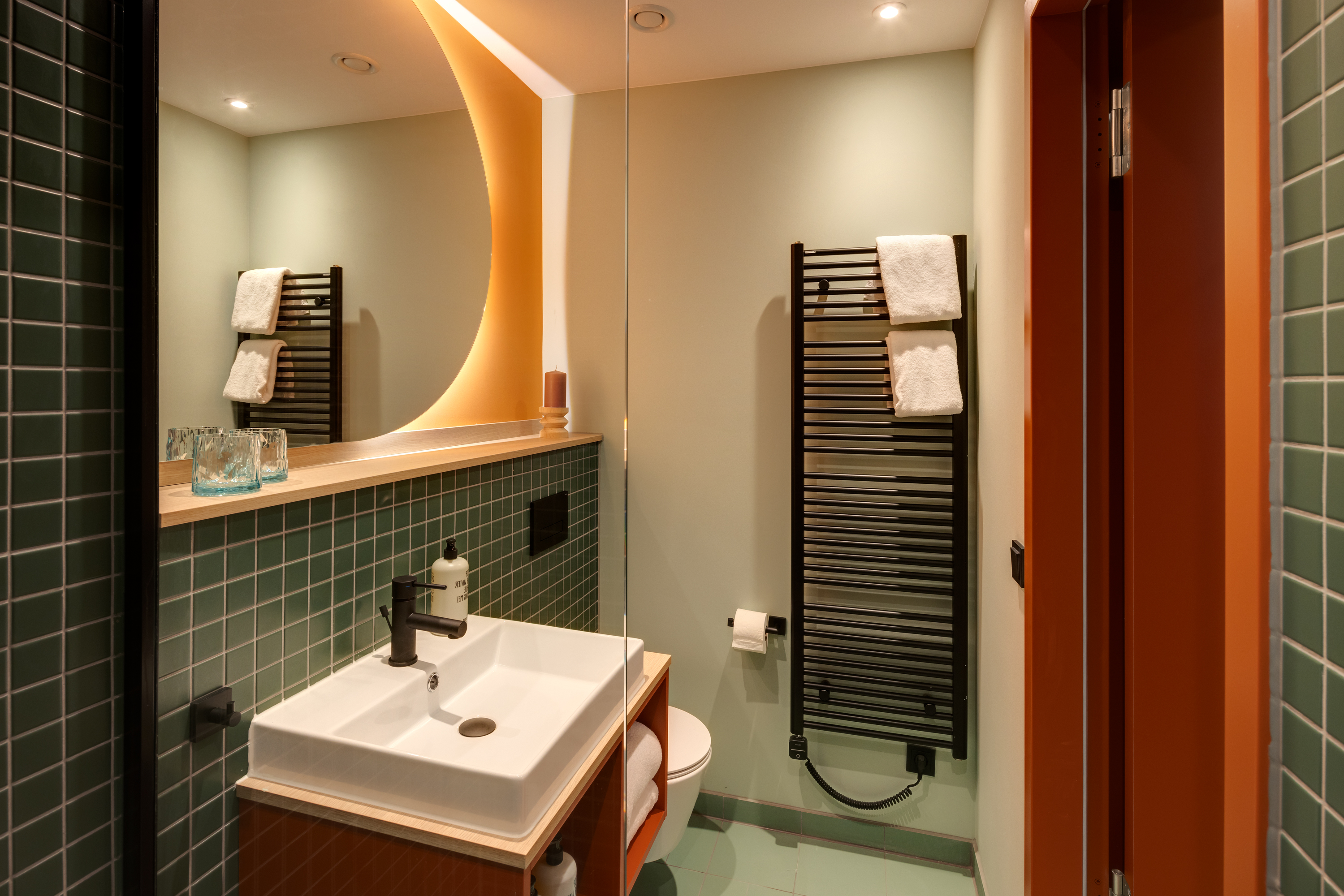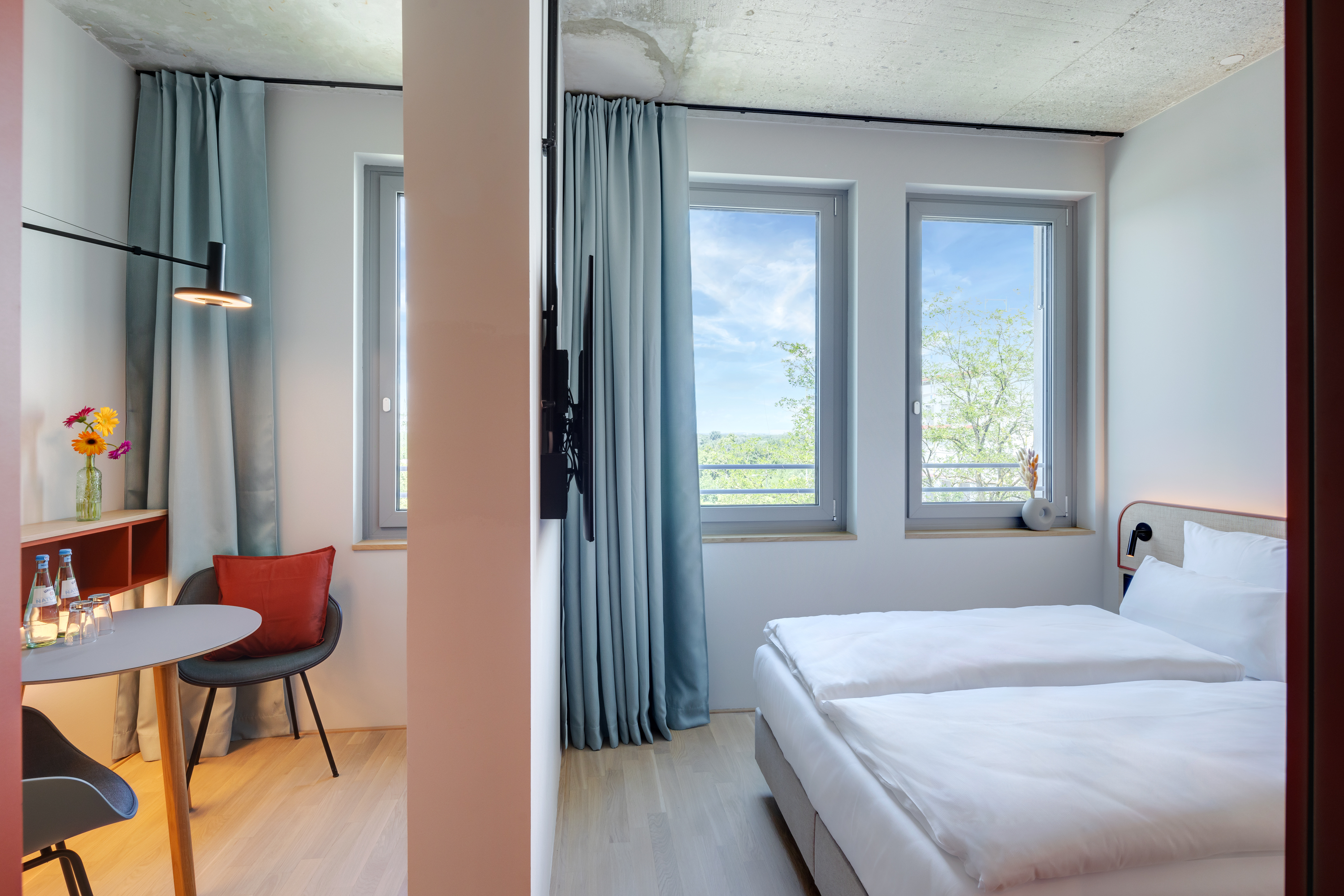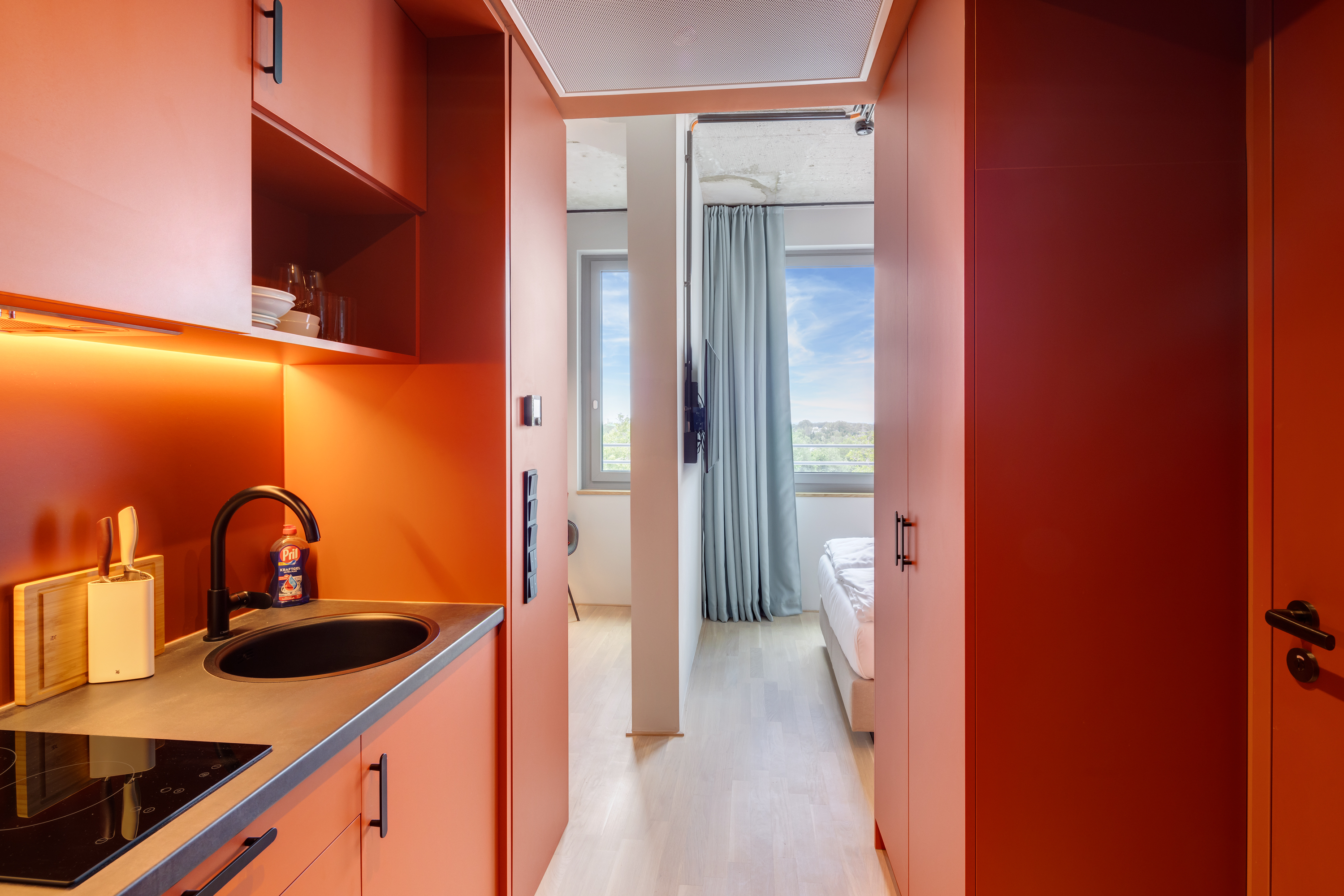 Das Studio Deluxe Premium bietet ihnen ein geräumiges Zimmer sowie einen separaten Arbeitsbereich, der Platz zum Arbeiten und Essen bietet. Die geschmackvolle Einrichtung und das zeitgemäße Design schaffen eine angenehme Atmosphäre. Die Küchenzeile ist mit modernen Geräten wie Herd, Kühlschrank, eine Mikrowelle und Spülmaschine ausgestattet und bietet Ihnen die Möglichkeit, Ihre Lieblingsgerichte zuzubereiten. Im Badezimmer gibt es eine stilvolle begehbare Dusche, einen großen Handtuchheizkörper sowie einen großen Spiegel mit umlaufender LED-Beleuchtung über dem Waschbecken, der dem Raum Helligkeit und Weite verleiht. Ein komfortables Queen Size Bett bietet ausreichend Platz und Entspannung für zwei Personen.
