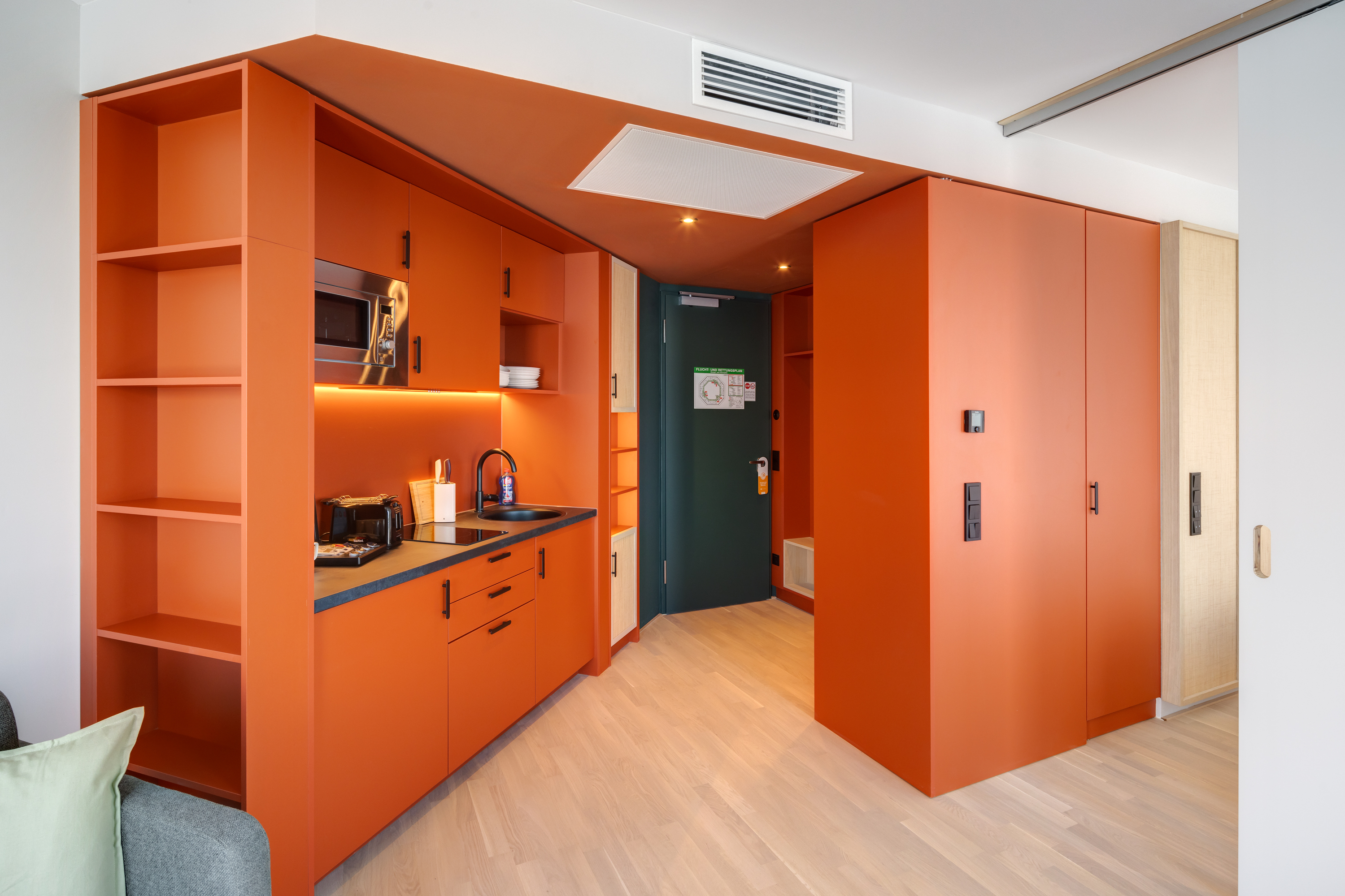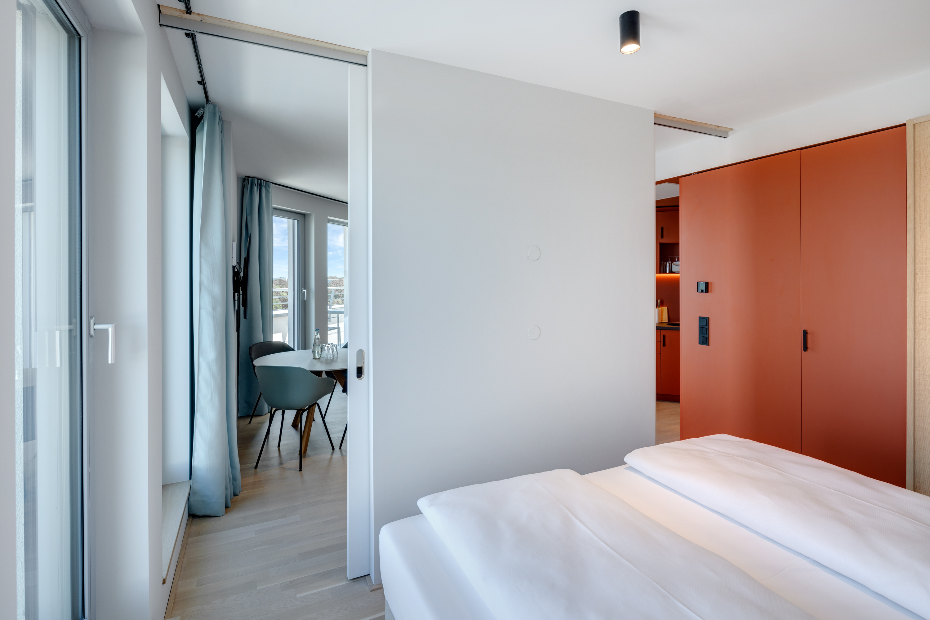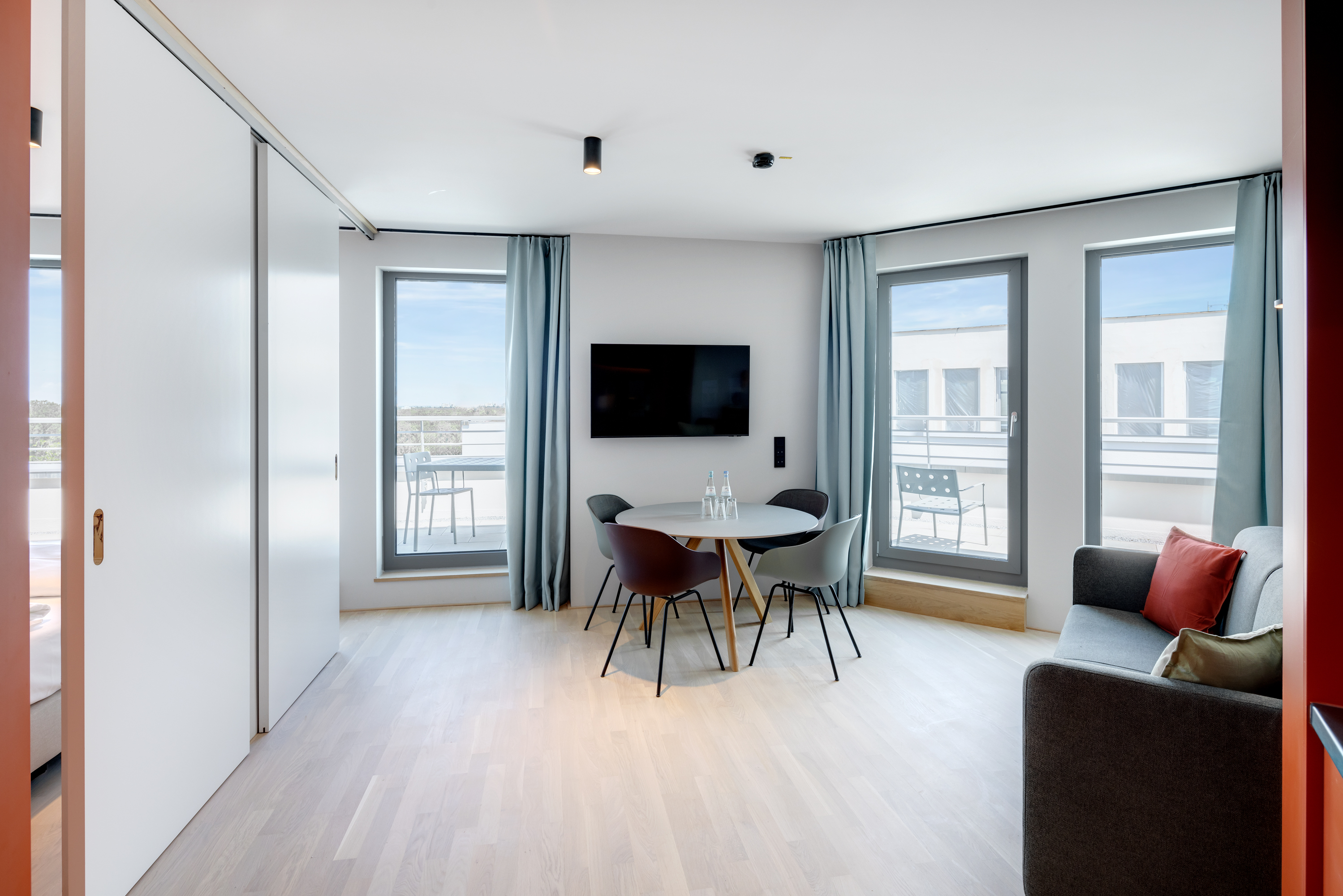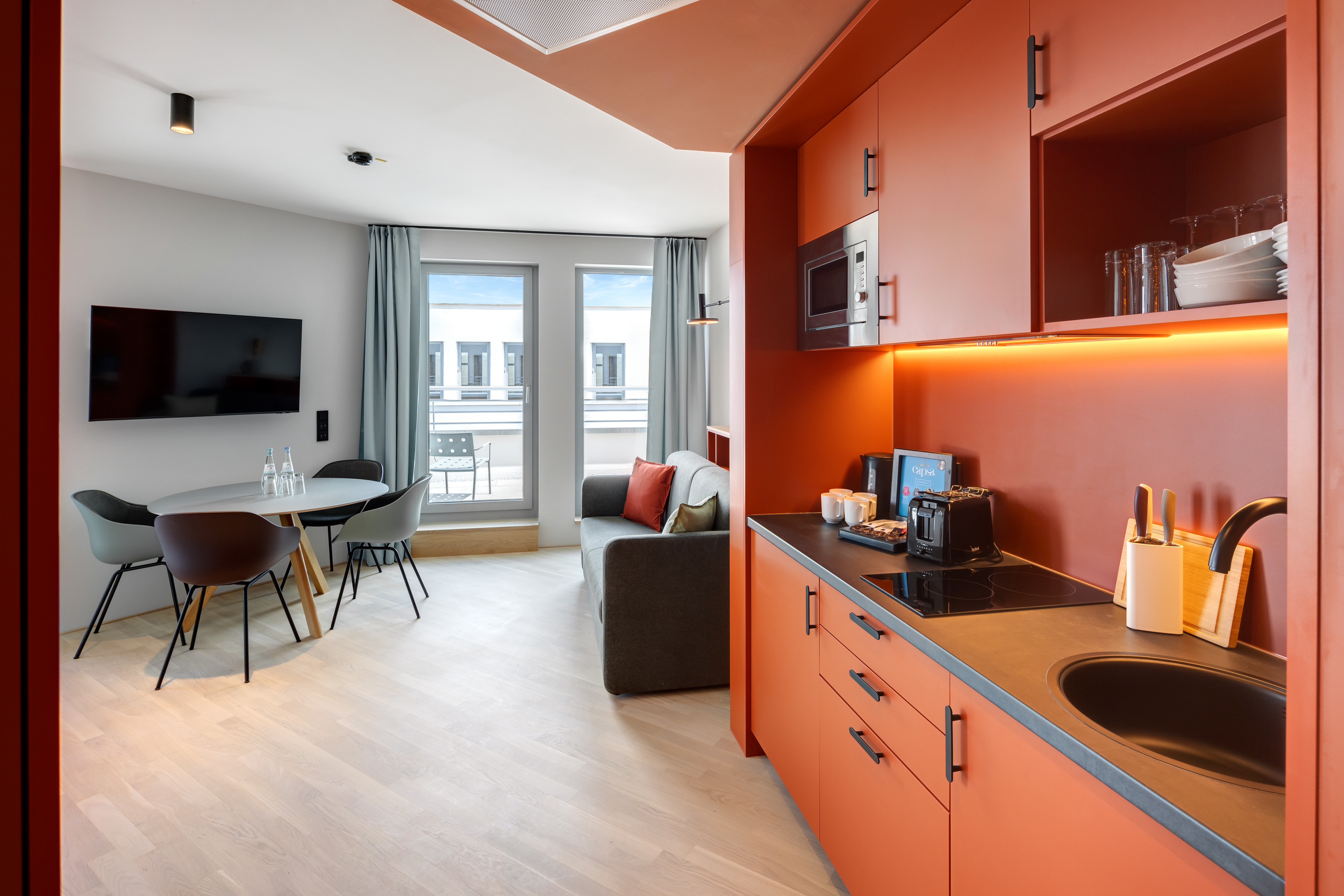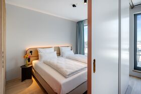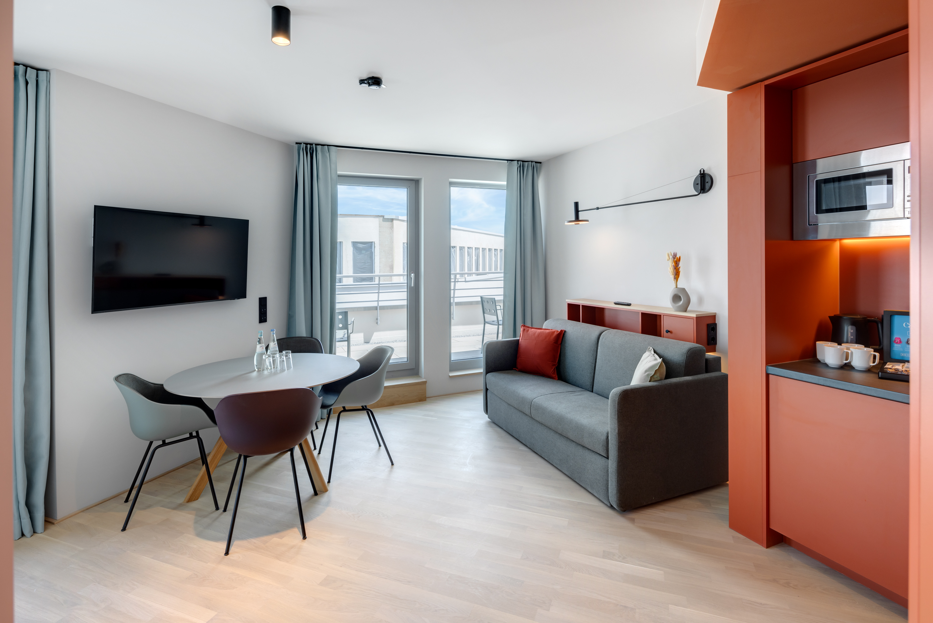 Ein-Zimmer-Apartment mit Dachterrasse und Panorama Ausblick auf die Stadt. Das Studio Superior bietet viel Platz für bis zu 4 Personen, was es auch ideal für Familien macht. Neben einen bequemen Doppelbett für den erholsamen Schlaf, verfügt das Studio zusätzlich über ein Schlafsofa oder Stockbettsofa. Egal ob Sie als Familie reisen oder einfach nur mehr Platz benötigen, das Studio Superior bietet Ihnen den Komfort und die Flexibilität, die Sie brauchen. Die geschmackvolle Einrichtung und das zeitgemäße Design schaffen eine angenehme Atmosphäre. Die Küchenzeile ist mit modernen Geräten wie Herd, Kühlschrank, eine Mikrowelle und Spülmaschine ausgestattet und bietet Ihnen die Möglichkeit, Ihre Lieblingsgerichte zuzubereiten. Im Badezimmer gibt es eine stilvolle begehbare Dusche, einen großen Handtuchheizkörper sowie einen großen Spiegel mit umlaufender LED-Beleuchtung über dem Waschbecken, der dem Raum Helligkeit und Weite verleiht.