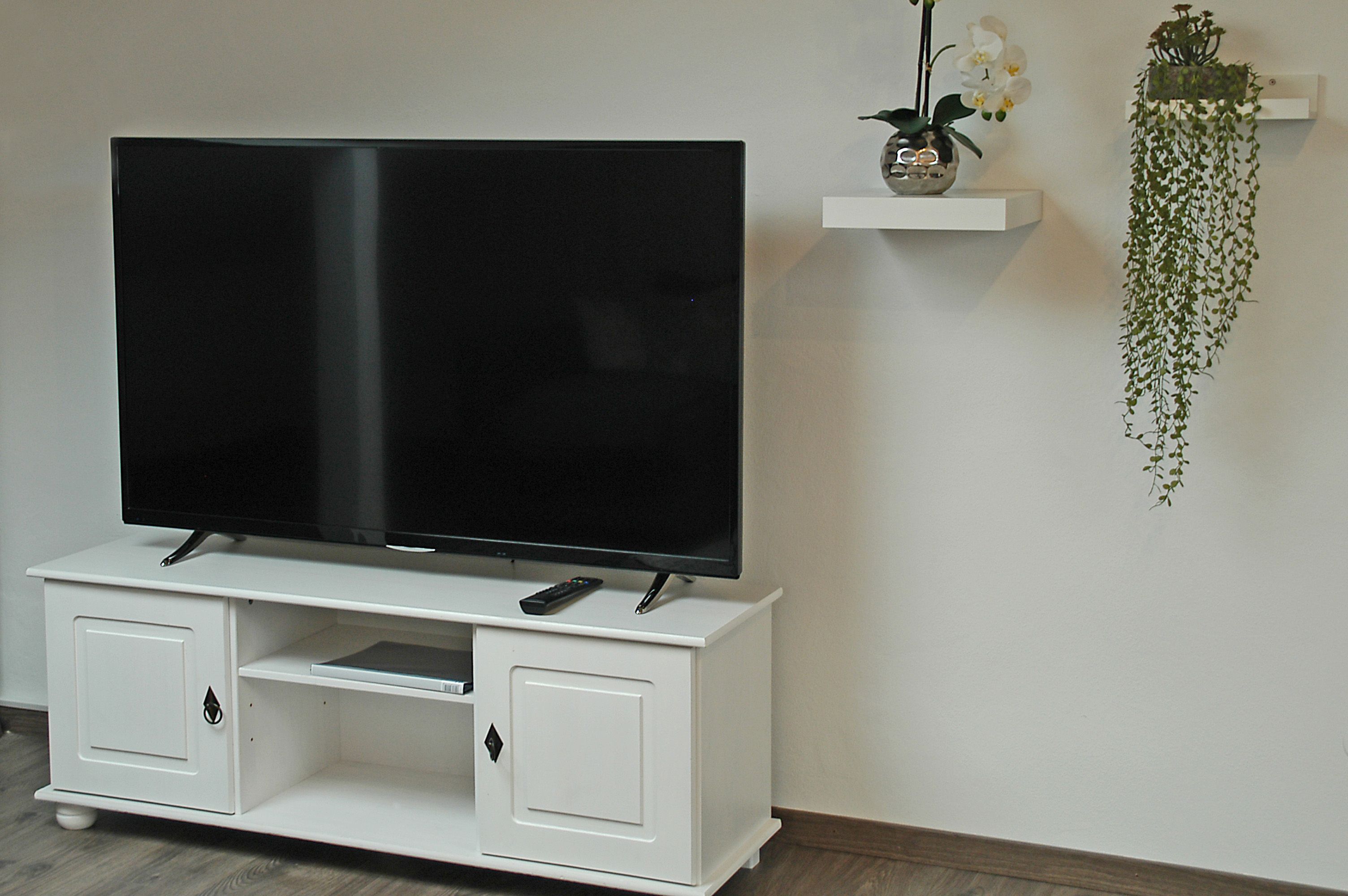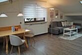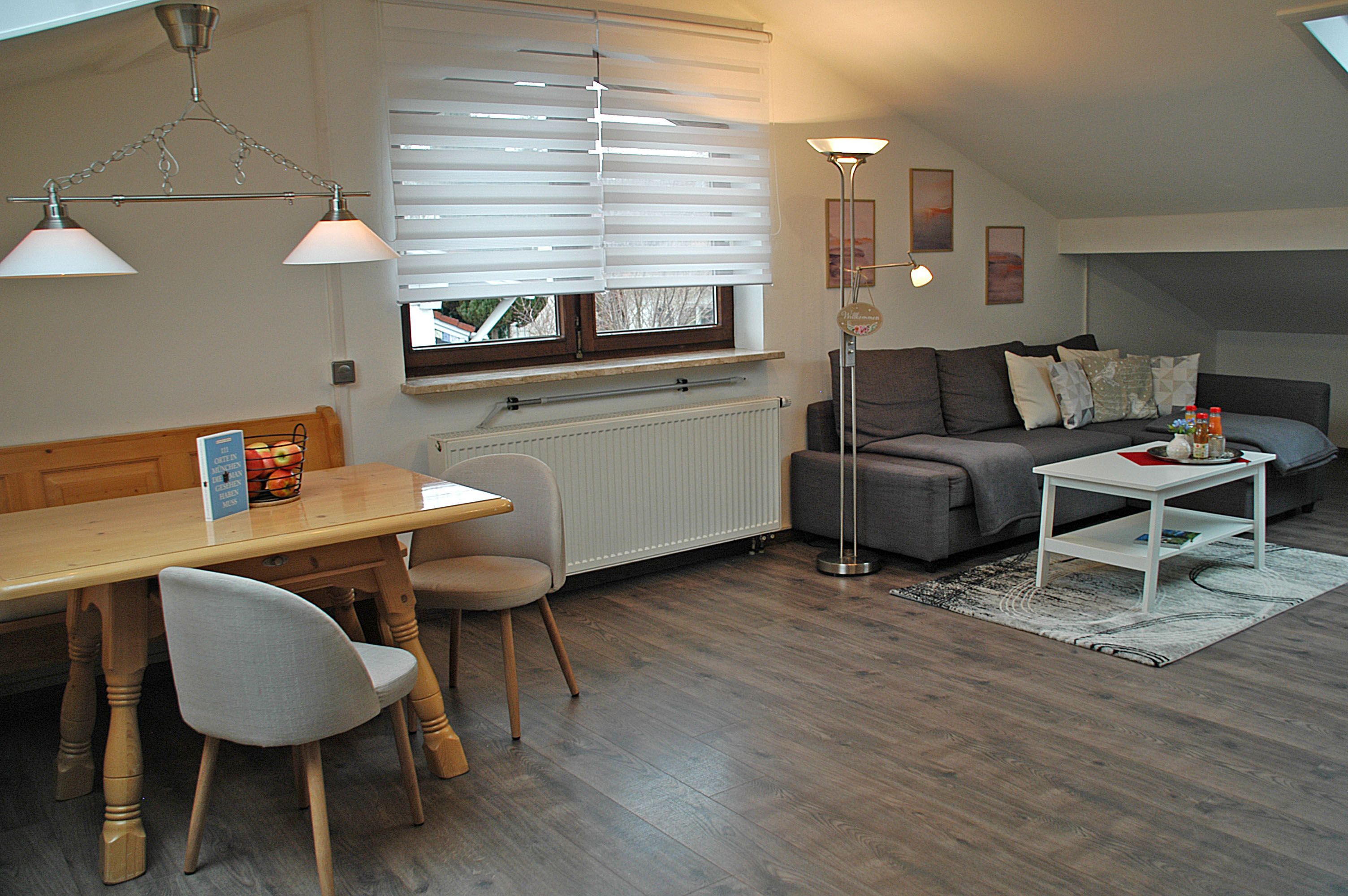 Die beghaglich eingerichtete, helle Ferienwohnung bietet einen kombinierten Wohn-/Essbereich (mit Schlafsofa 140x200 cm), Radio, 55-Zoll-Fernseher und Schreibtisch sowie eine Klimaanlage.