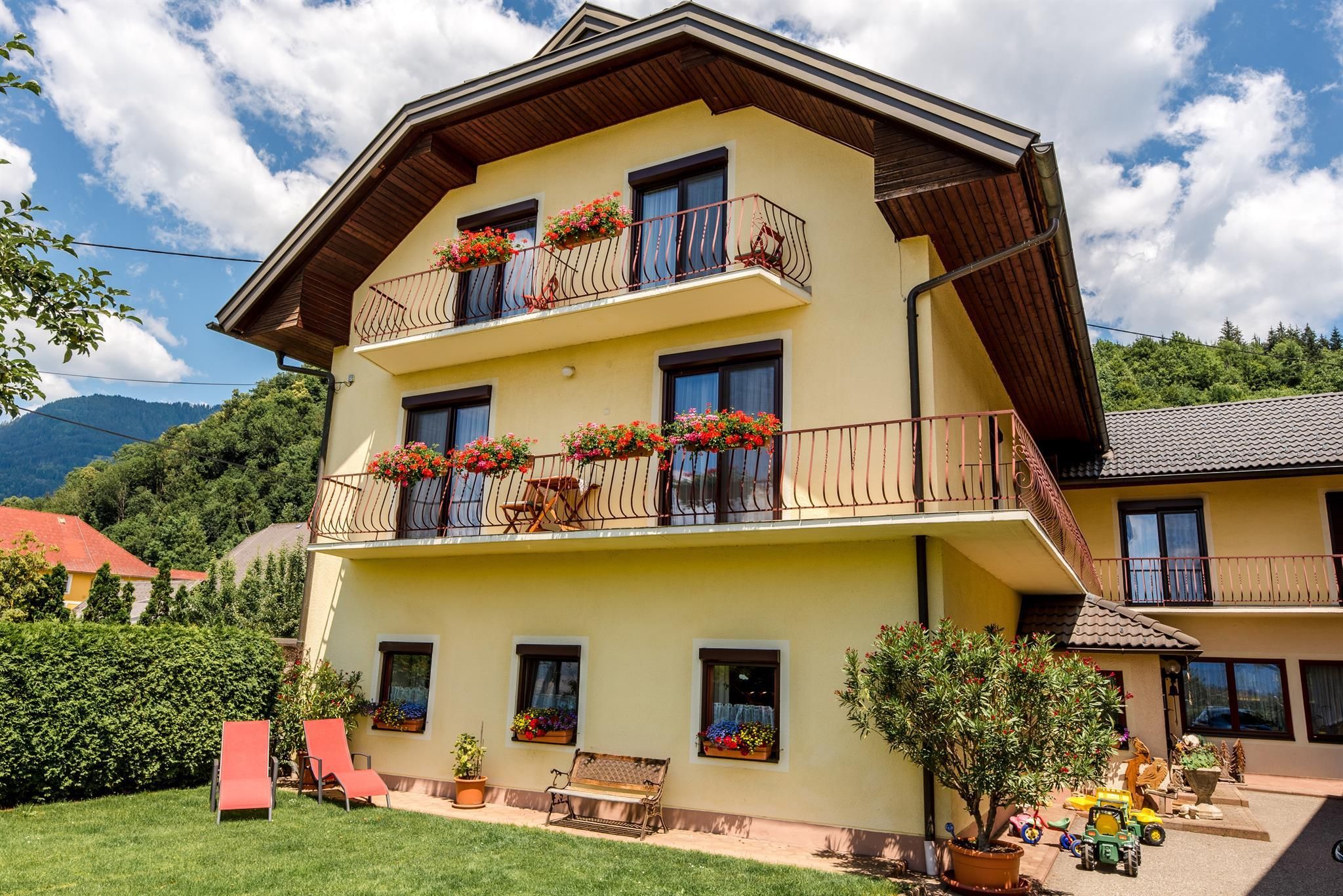 Wir bieten: drei ebenso schöne wie komfortable Ferienwohnungen mit Blick auf die Burgruine Landskron, die Karawanken und den Naturpark Dobratsch.