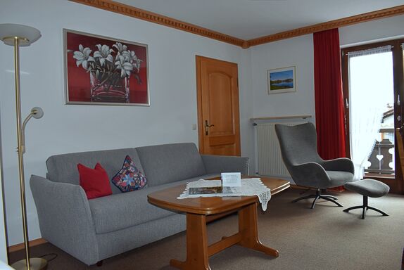Die 40m² große Ferienwohnung befindet sich im 1. Obergeschoss. Die Wohnung hat getrennte Wohn- und Schlafzimmer und bietet reichlich Platz für 2 Personen. Sie ist komplett ausgestattet inkl. Sat-TV, Radio und CD-Player. Der große Balkon mit Blick Richtung Osten und Süden in die Ammergauer Alpen lädt zum Ruhen und Genießen ein.